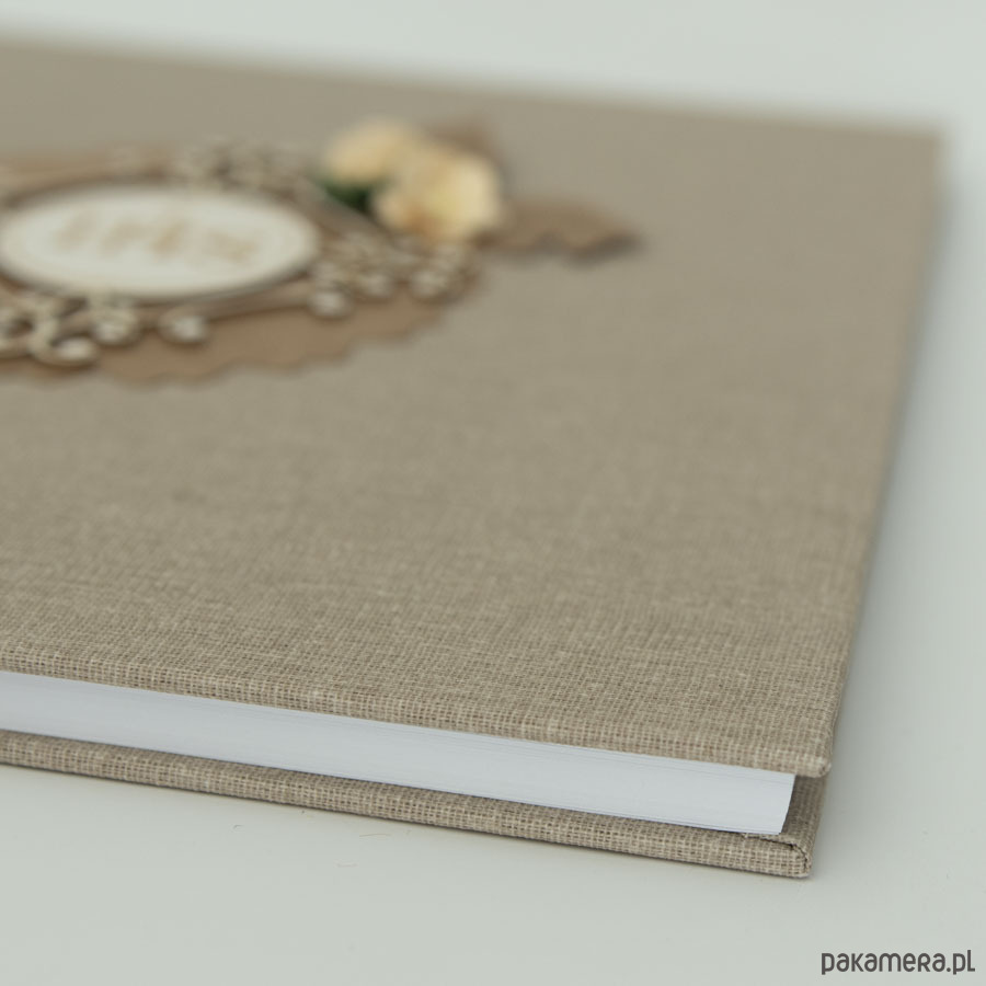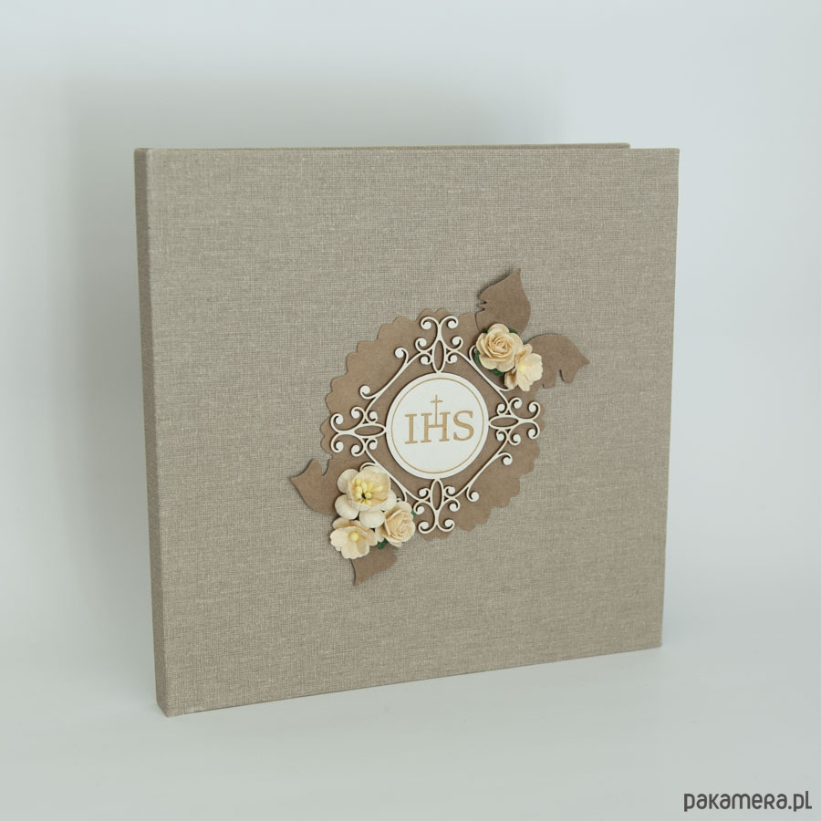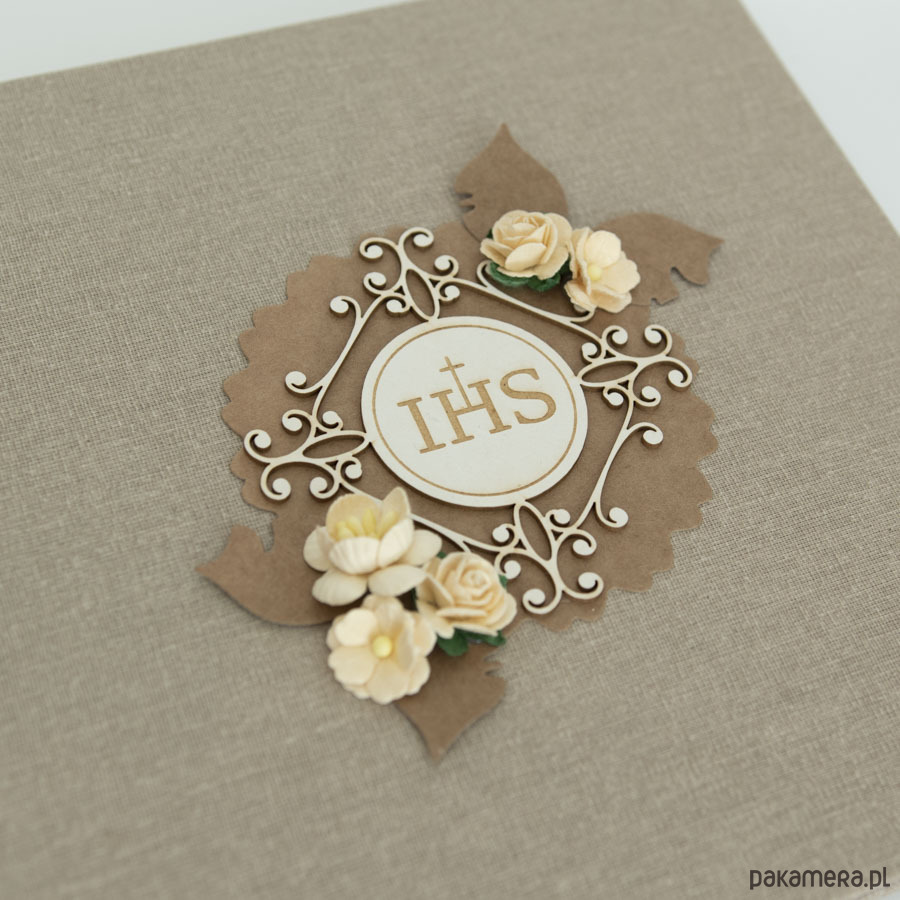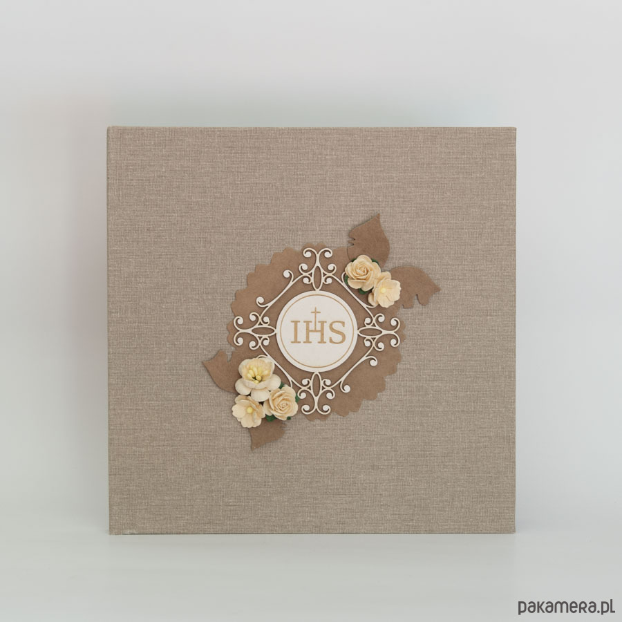 Twarda oprawa płócienna w naturalnym kolorze, z przodu zdobienie przestrzenną hostią i papierowymi kwiatuszkami.