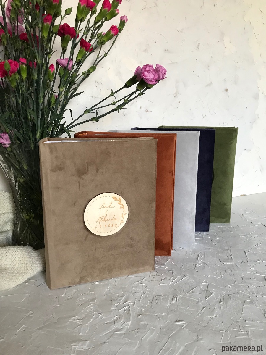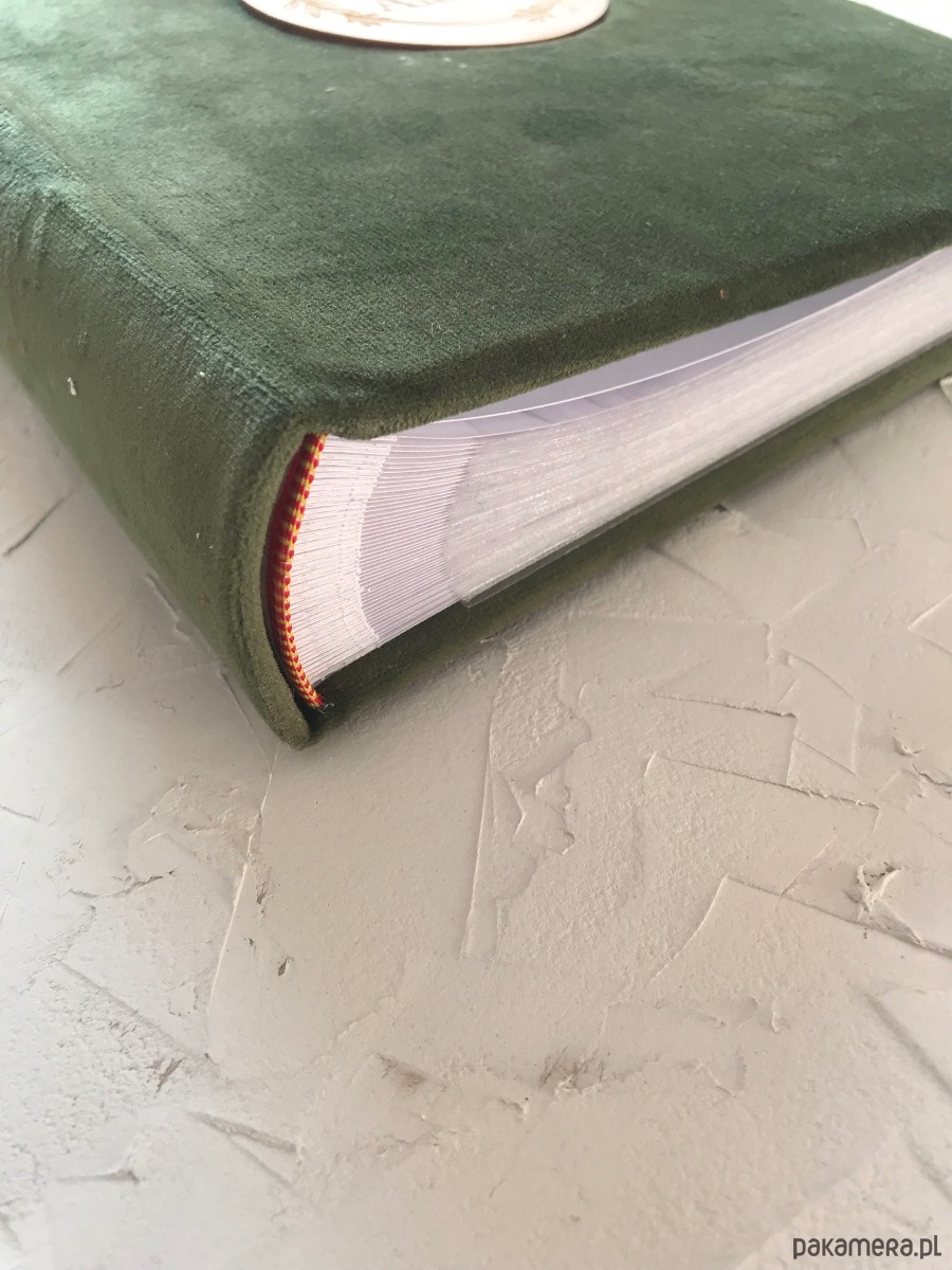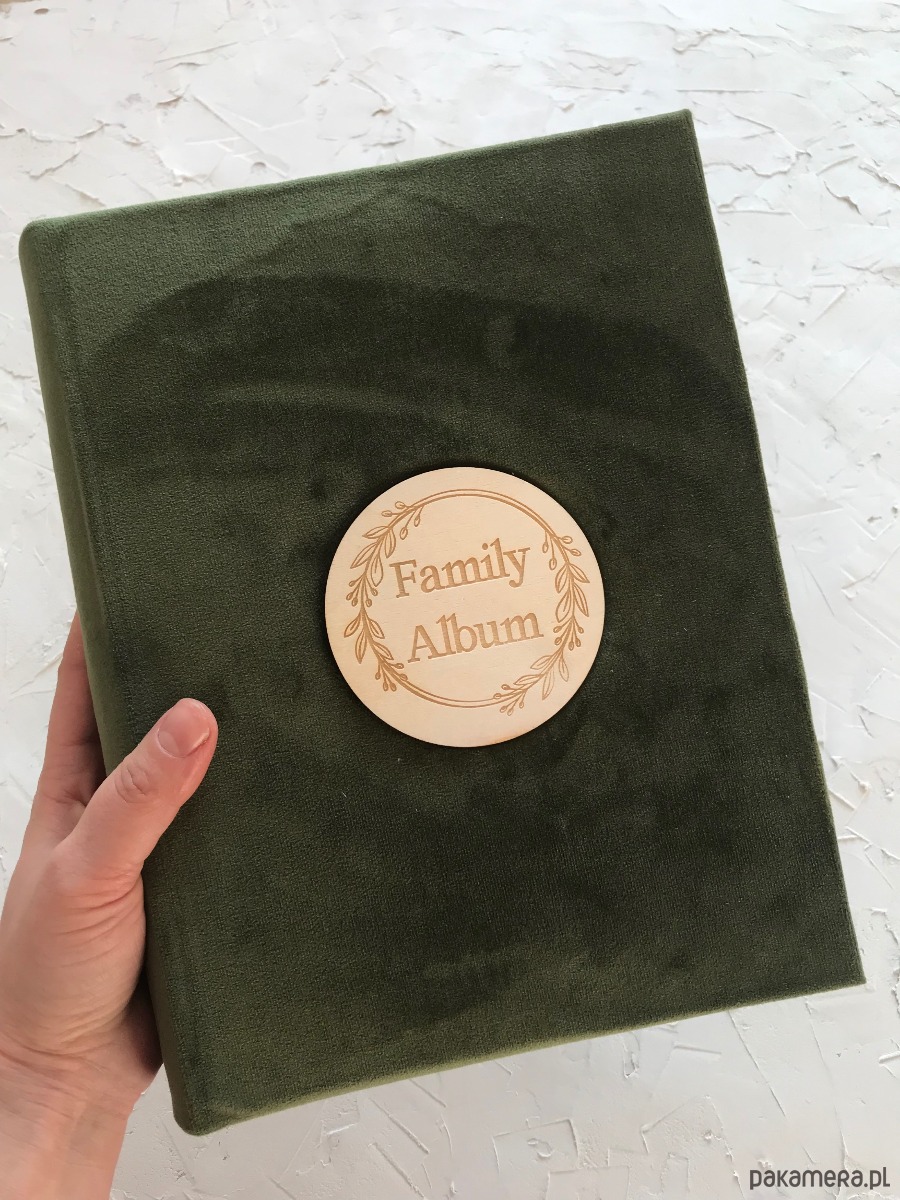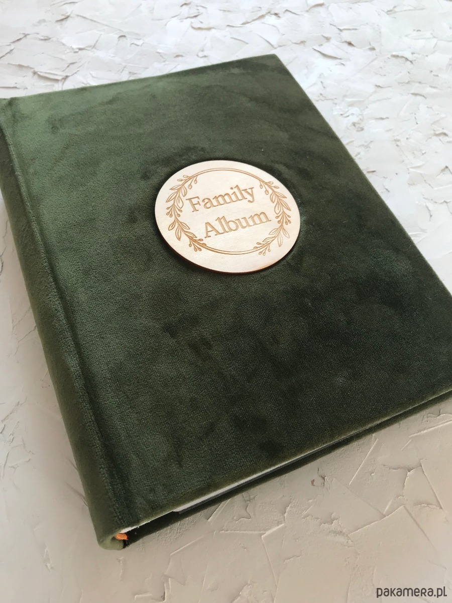4 Albumy koloru leśna zieleń z grawerem drewnianym. Białe przekładki na podpisy zdjęć.