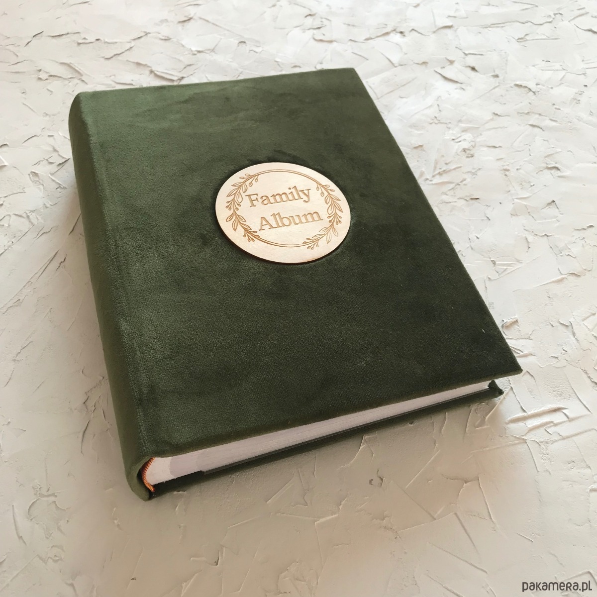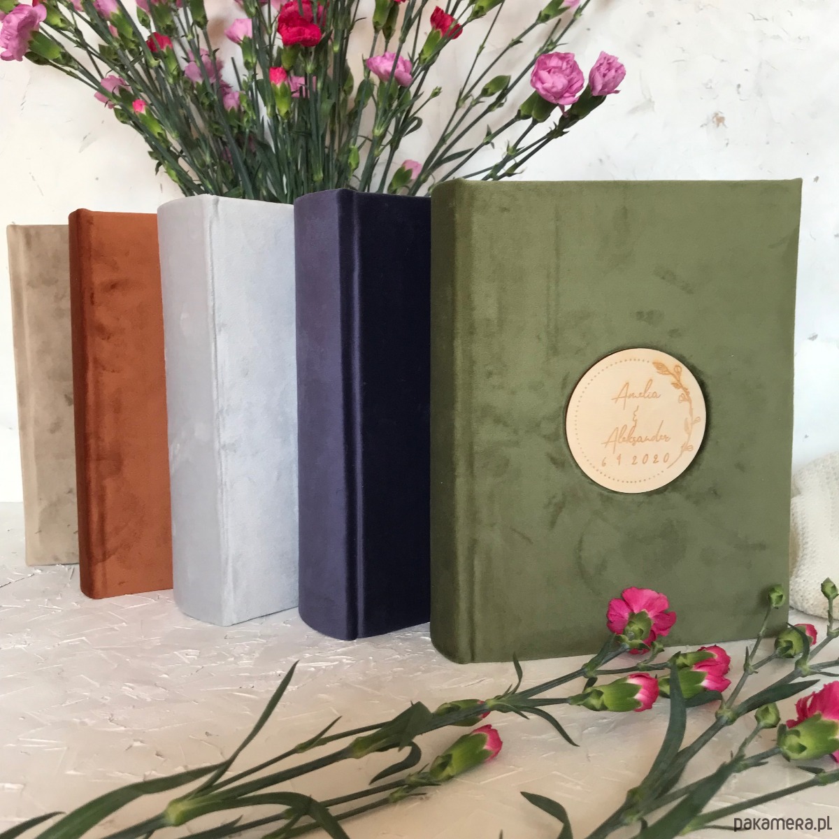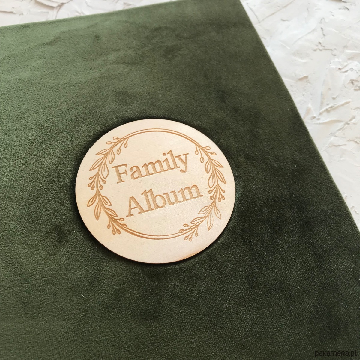 4 Albumy koloru leśna zieleń z grawerem drewnianym. Białe przekładki na podpisy zdjęć.
