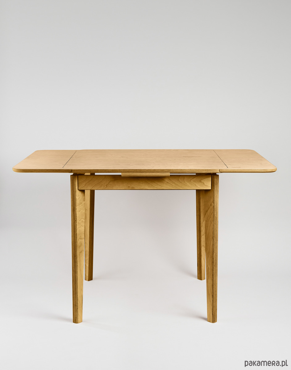 Blat: wykonany jest z jednego arkusza sklejki, czyli po rozłożeniu cała powierzchnia tworzy ciągły rysunek. Mechanizm rozkładania to rękodzieło, również ze sklejki. Wymaga odrobiny uwagi, wynagradza możliwością rozłożenia każdej strony niezależnie. Po rozłożeniu blat sprawia wrażenie jakby lewitował nad ramą.