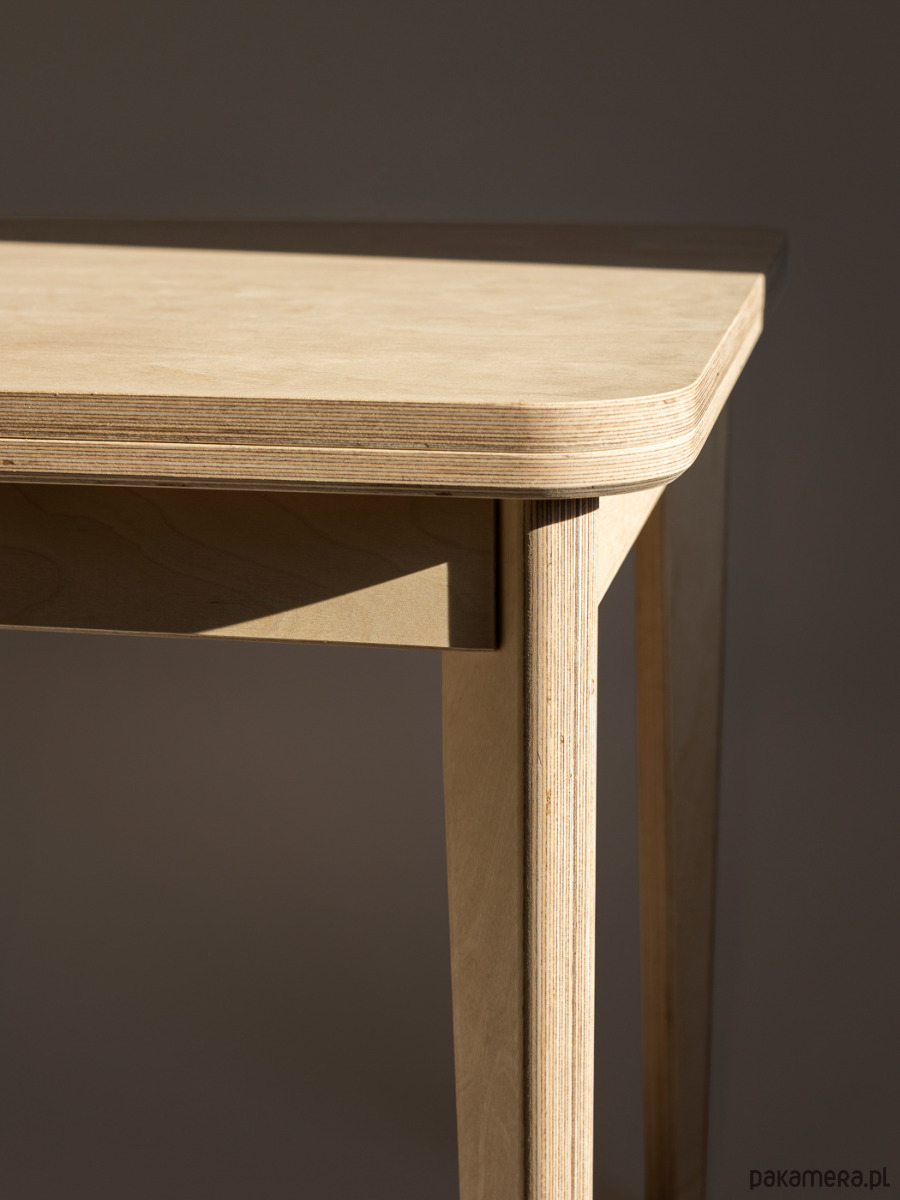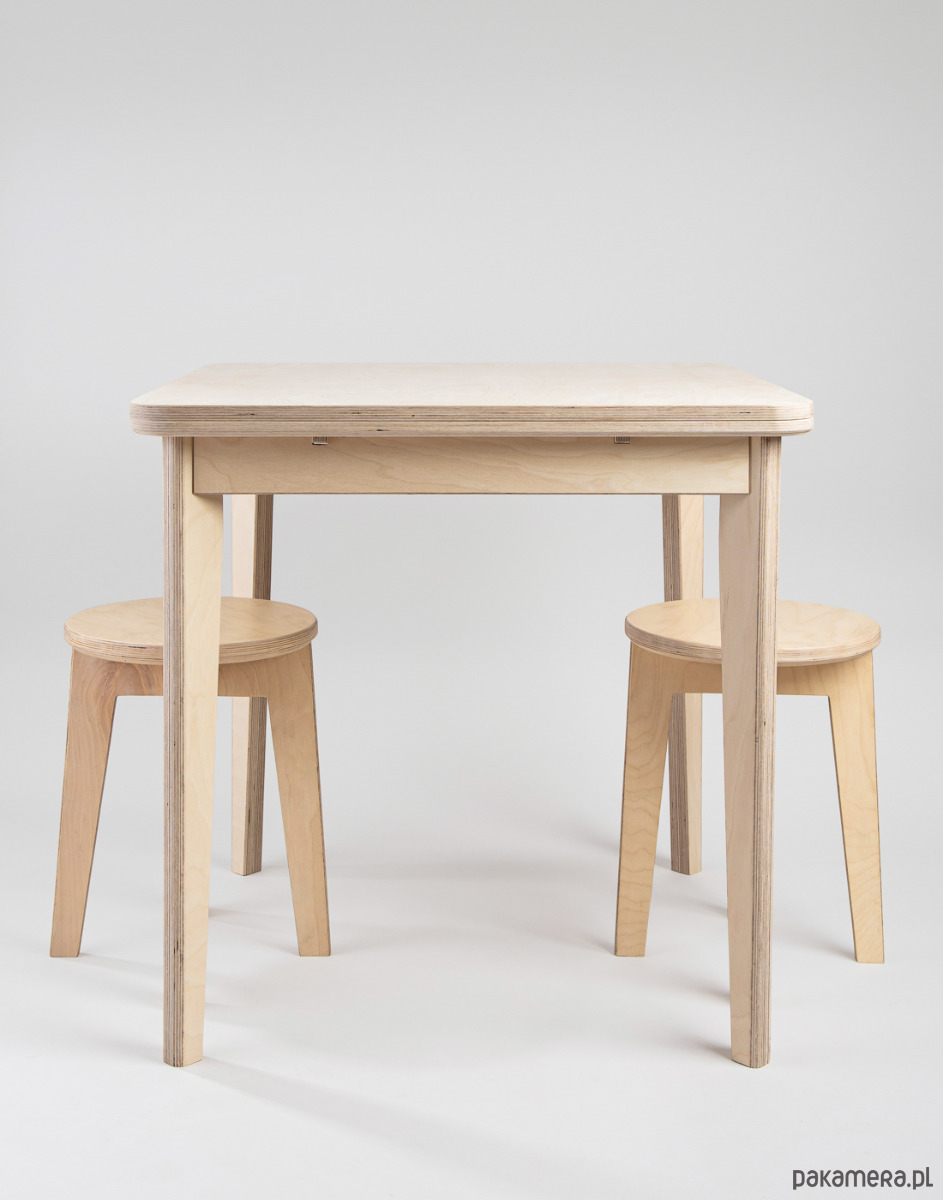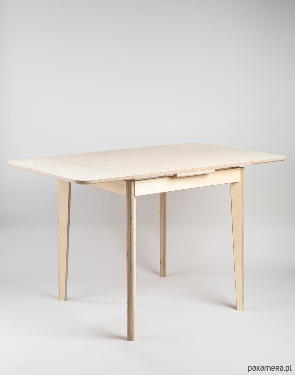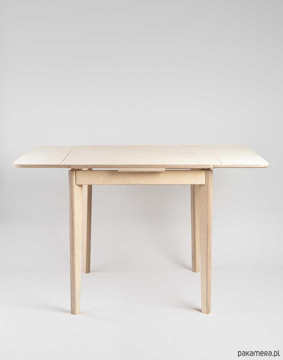 Blat: wykonany jest z jednego arkusza sklejki, czyli po rozłożeniu cała powierzchnia tworzy ciągły rysunek. Mechanizm rozkładania to rękodzieło, również ze sklejki. Wymaga odrobiny uwagi, wynagradza możliwością rozłożenia każdej strony niezależnie. Po rozłożeniu blat sprawia wrażenie jakby lewitował nad ramą.