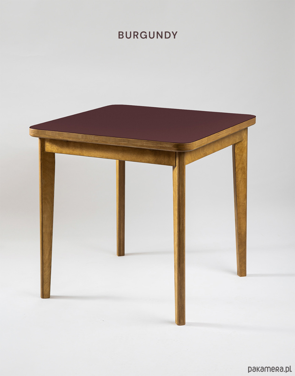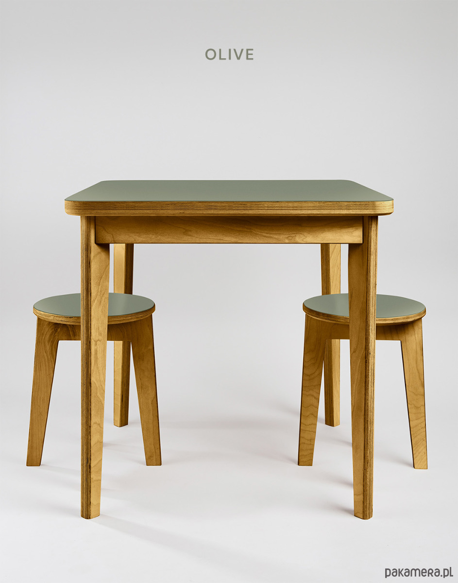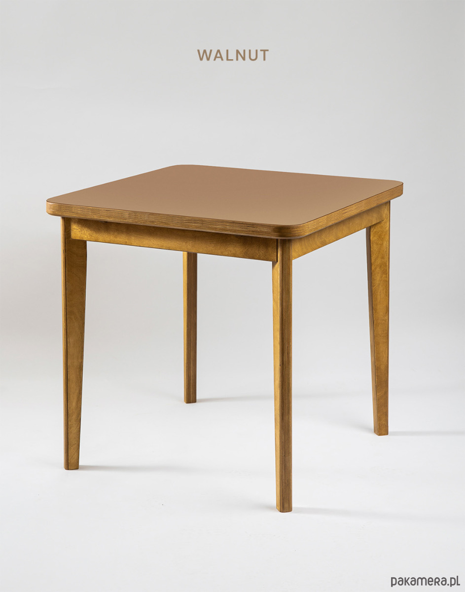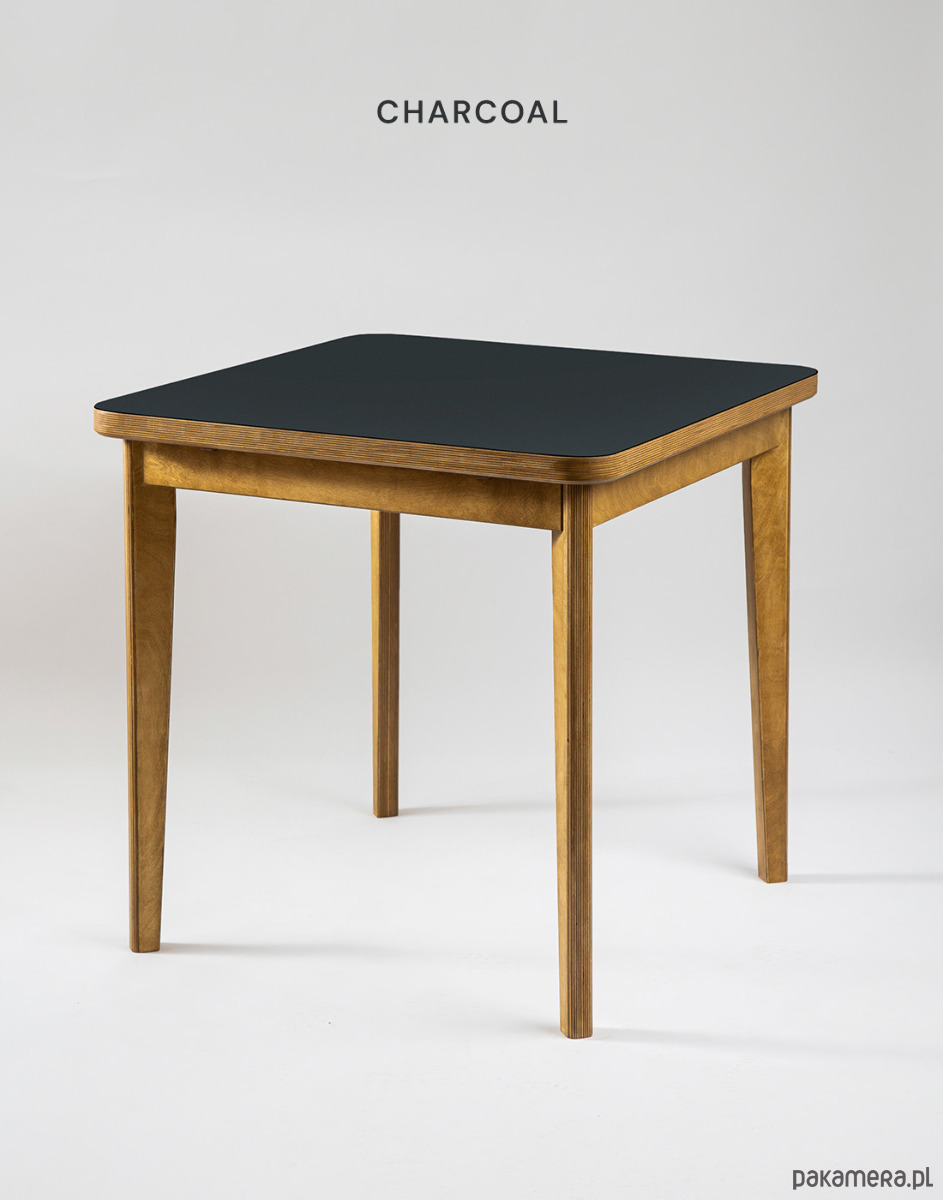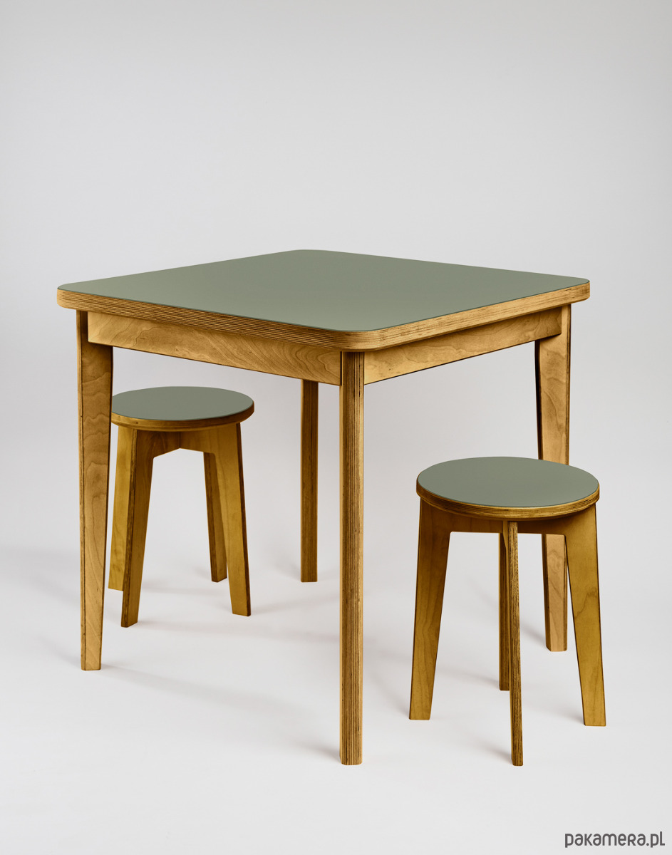 Ales to zgrabny stół jadalniany zbudowany w całości ze sklejki brzozowej z blatem pokrytym naturalnym linoleum meblowym.