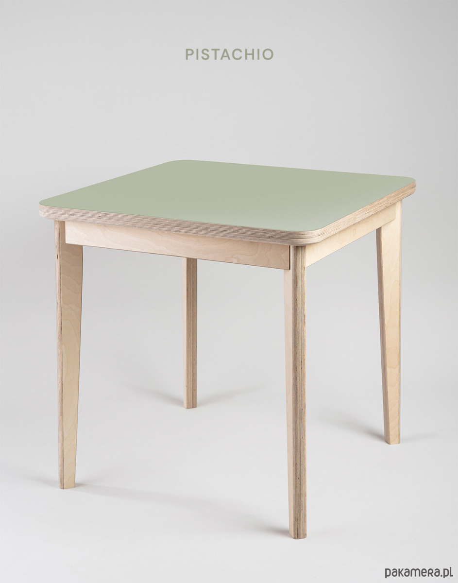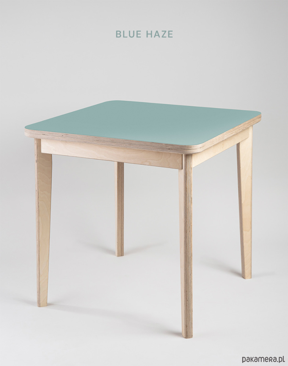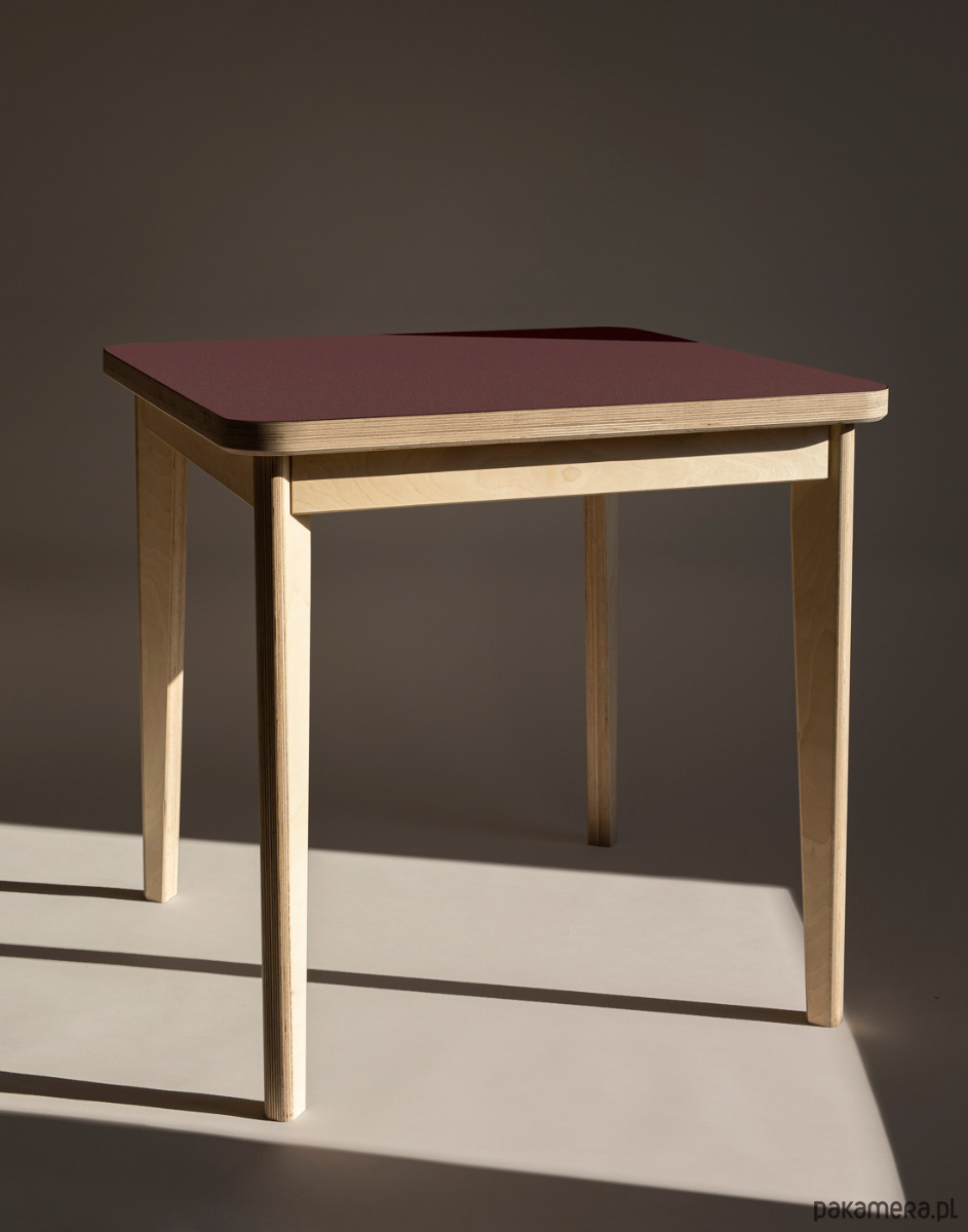 Ales to zgrabny stół jadalniany zbudowany w całości ze sklejki brzozowej z blatem pokrytym naturalnym linoleum meblowym.