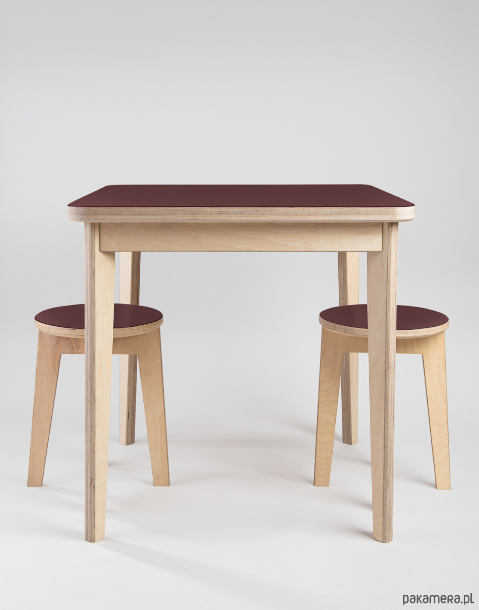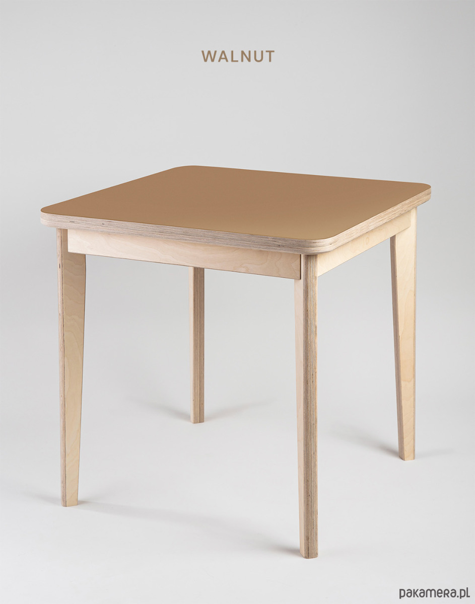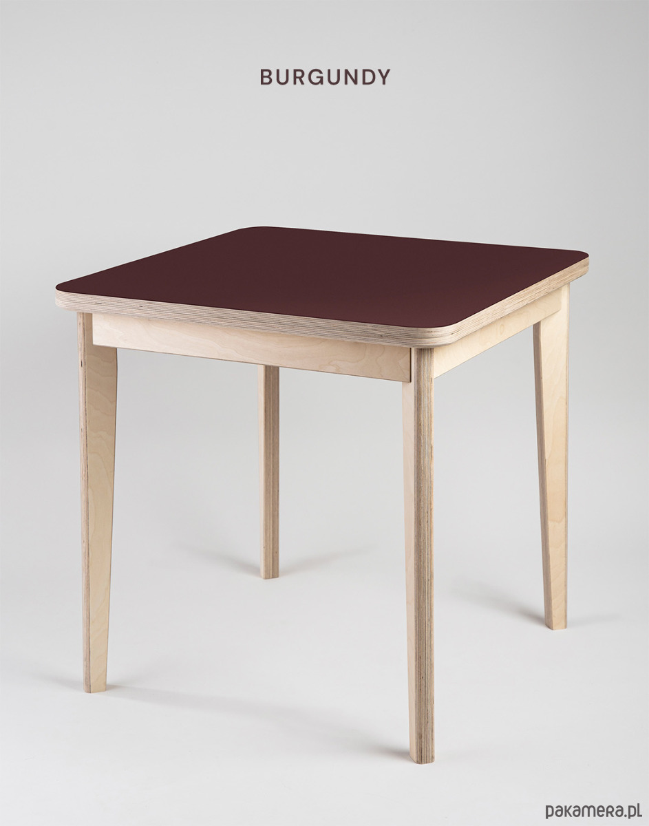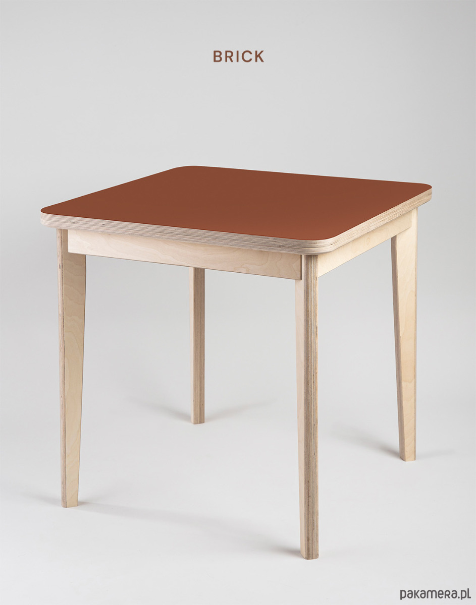 Ales to zgrabny stół jadalniany zbudowany w całości ze sklejki brzozowej z blatem pokrytym naturalnym linoleum meblowym.