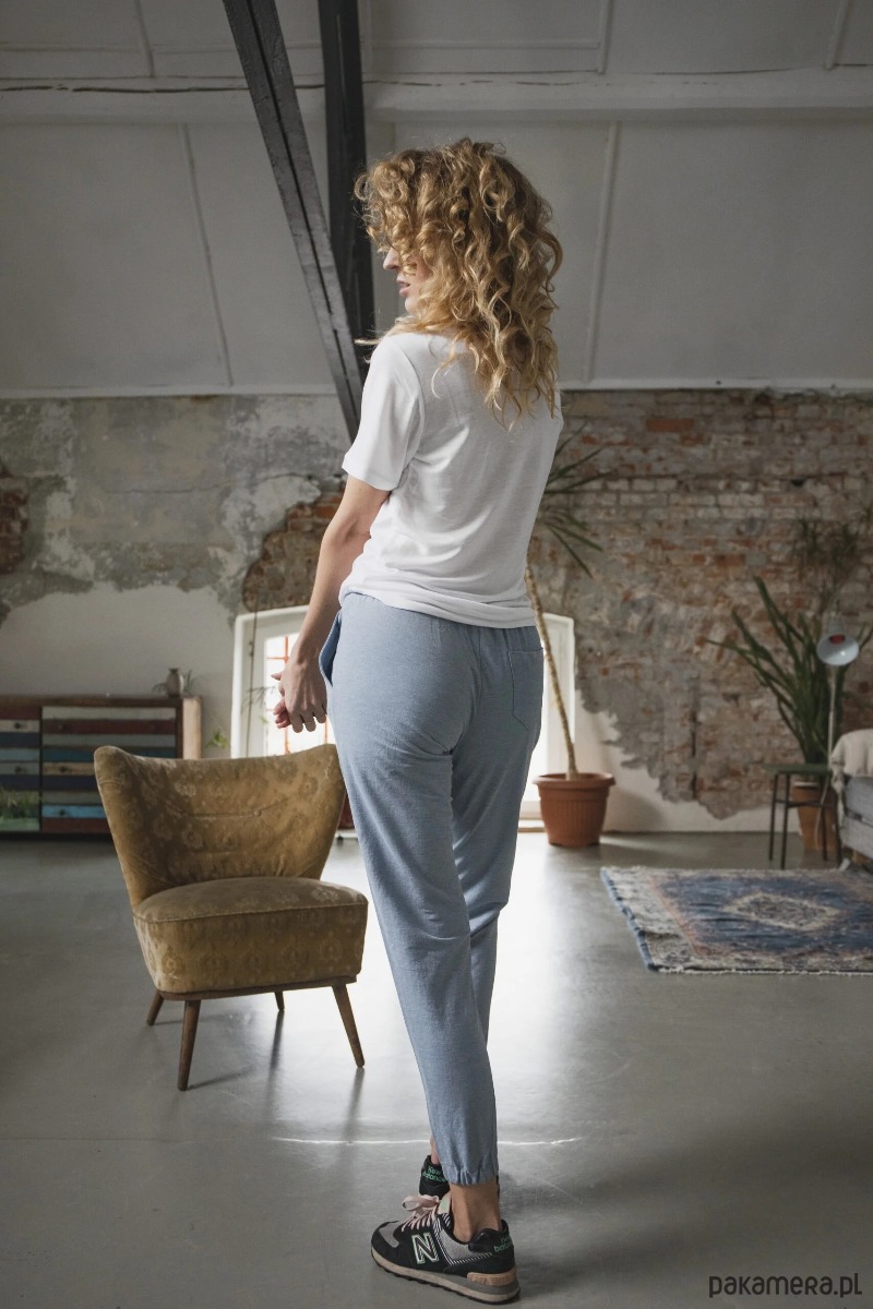Spodnie mają gumę w pasie oraz dodatkowe sznureczki, dzięki czemu idealnie dopasujesz je do swojej talii. Spodnie posiadają także pojemne kieszenie a nogawki są zakończone gumeczką.
