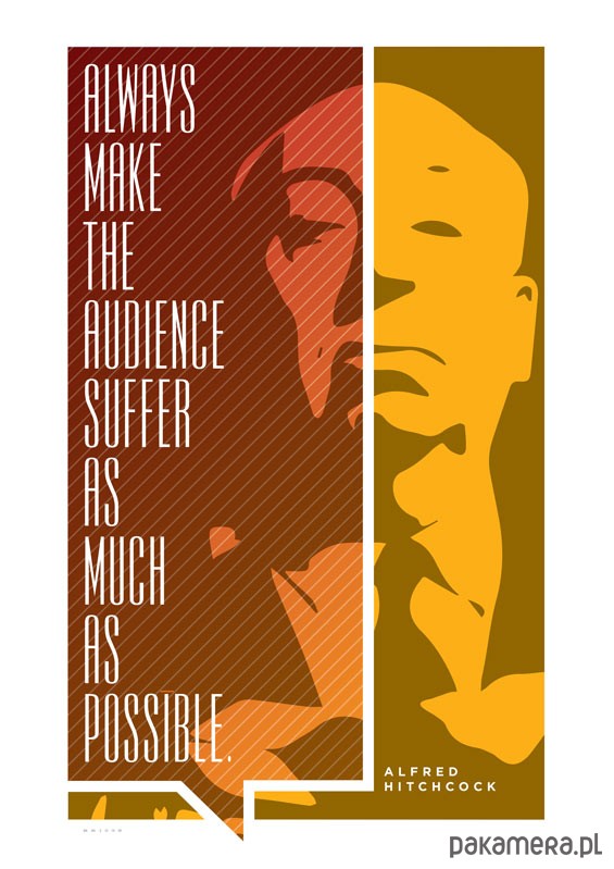 Plakat z autorską grafiką inspirowany postacią Alfreda Hitchcocka i jego słynną wypowiedzią "Always make the audience suffer as much as possible".