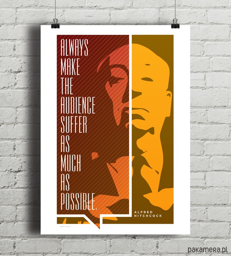 Plakat z autorską grafiką inspirowany postacią Alfreda Hitchcocka i jego słynną wypowiedzią "Always make the audience suffer as much as possible".