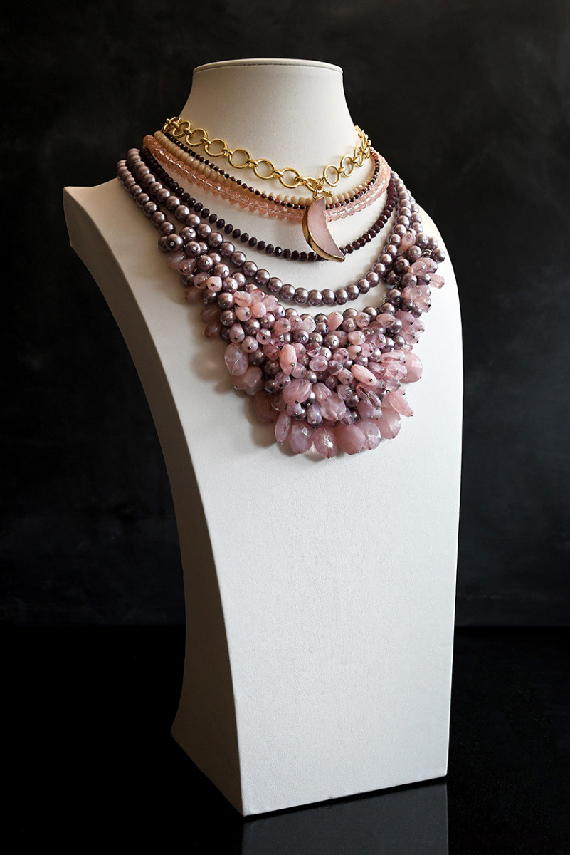 Wykonany ze szklanych pereł, szklanych korali, fasetowanych kryształków i oponek fasetowanego granatu oraz metalowych elementów.