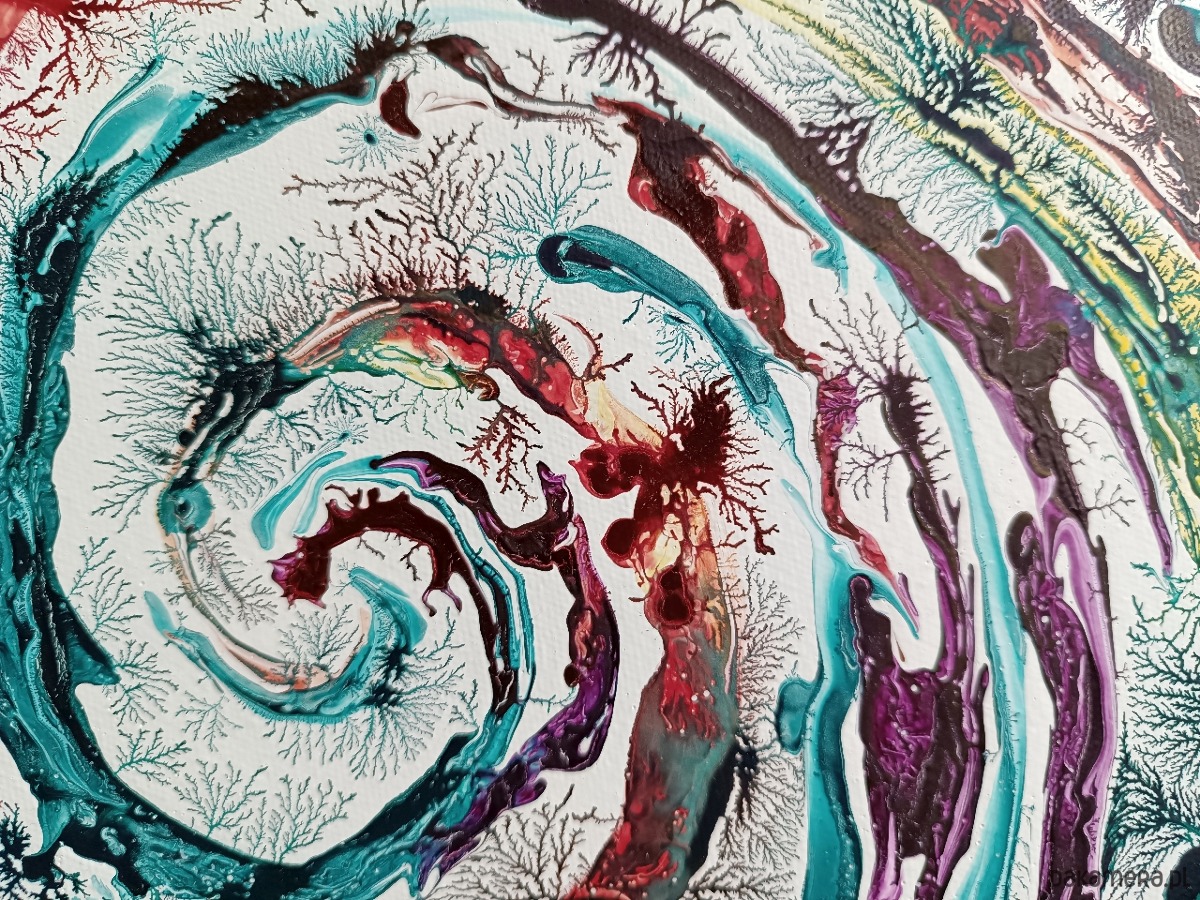 Żywe, wyraziste połączenia wirujących ze sobą kolorów to metafora życia - jego zmienności, ogromnej dynamiki i piękna! Kolory i kształty łączą się ze sobą, przenikają, wibrują w sieci połączeń. To ten moment, kiedy czujesz się najbardziej żywy, kiedy wiele się dzieje, rozpiera energia i wszystko ma swój sens. To ten moment, kiedy jesteś alive!