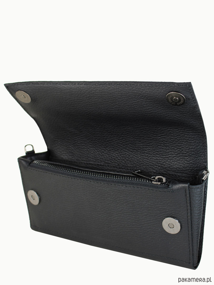 Portfel ręcznie wykonany z najwyższej jakości skóry naturalnej. Zapinany na dwa zatrzaski, w środku i z tyłu posiada dużą kieszonkę zapinaną na suwak, wewnątrz znajdują się trzy otwarte przegrody oraz 8 kieszeni na karty. Portfel jest na tyle duży, że z łatwością pomieści telefon. Dzięki temu można go używać jako torebkę, nerkę oraz kopertówkę.