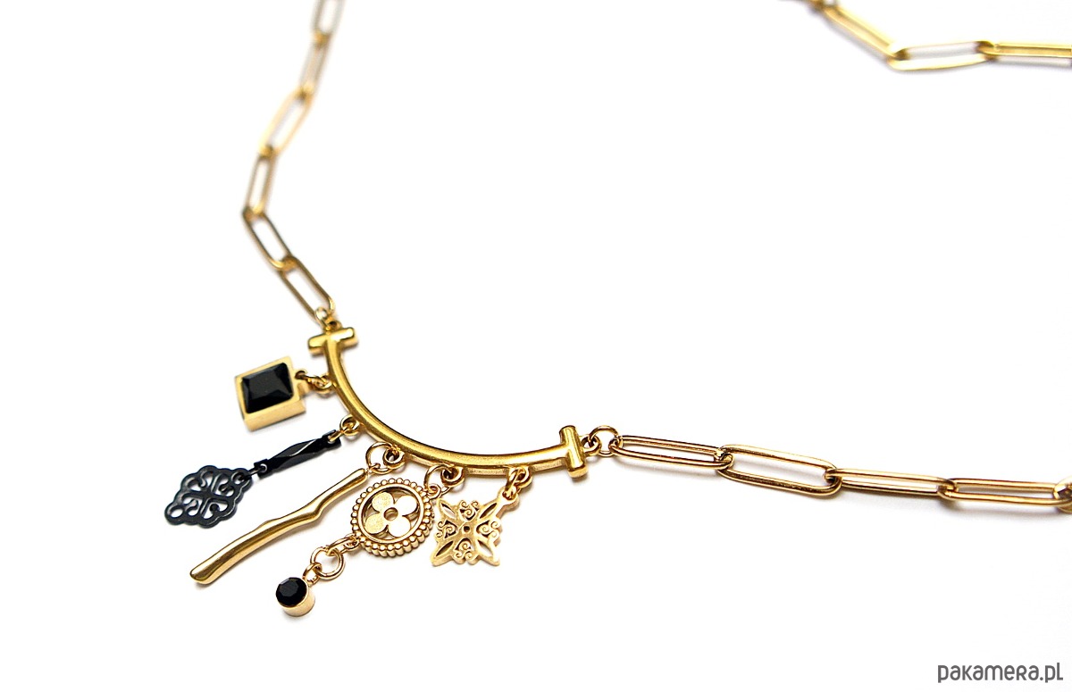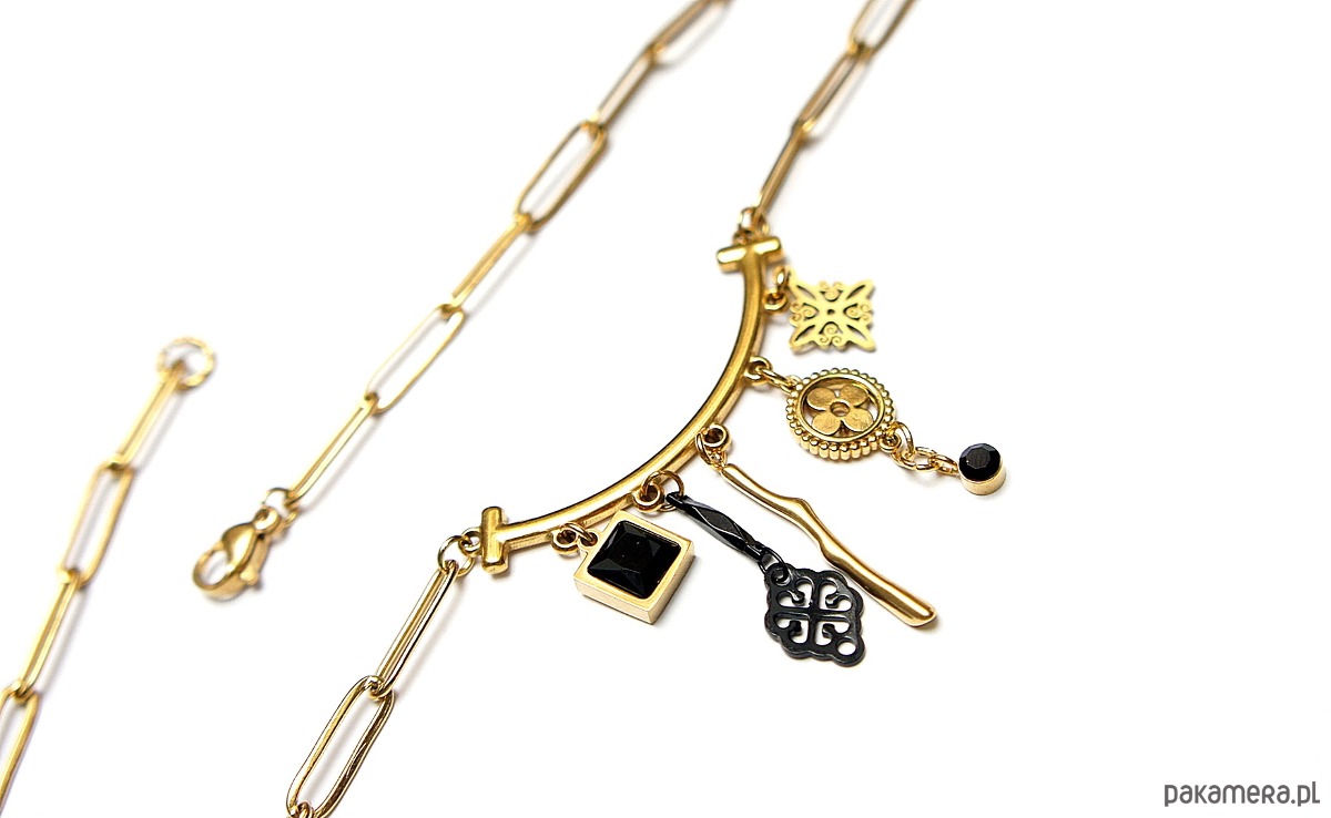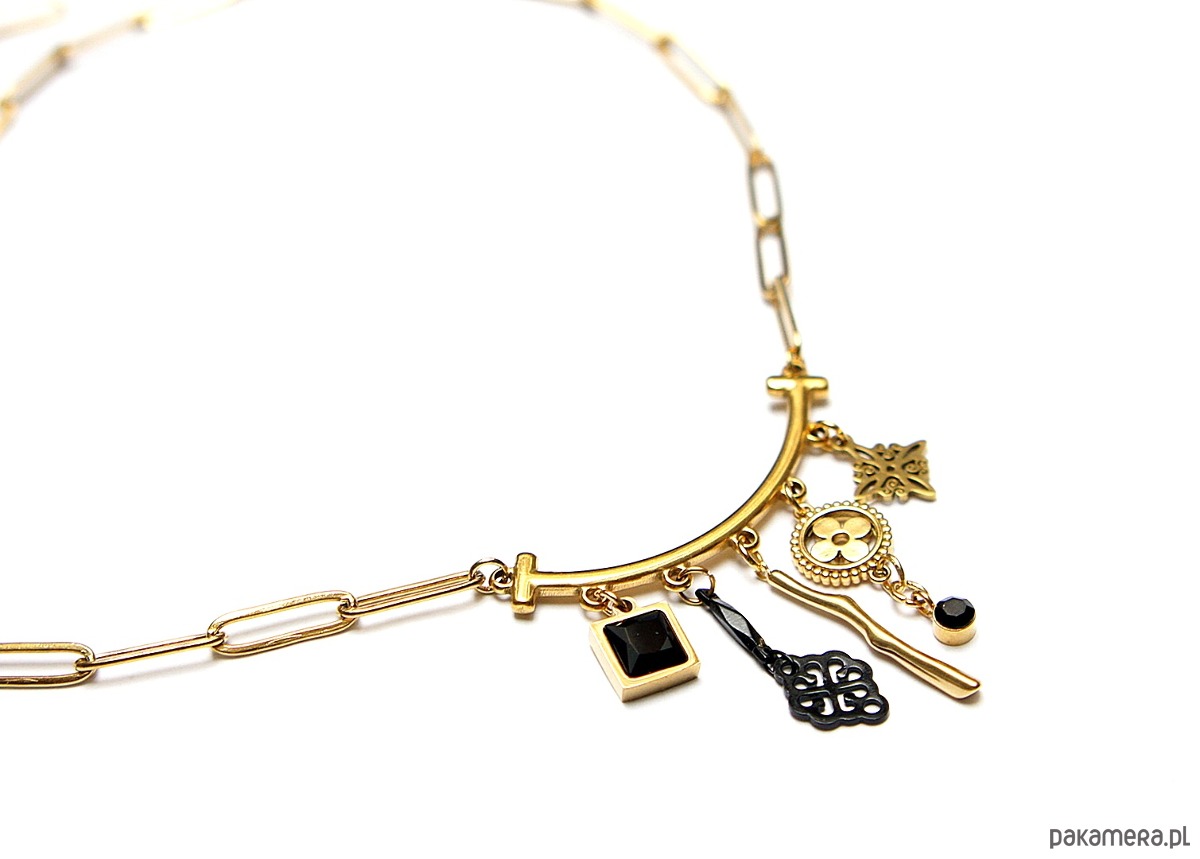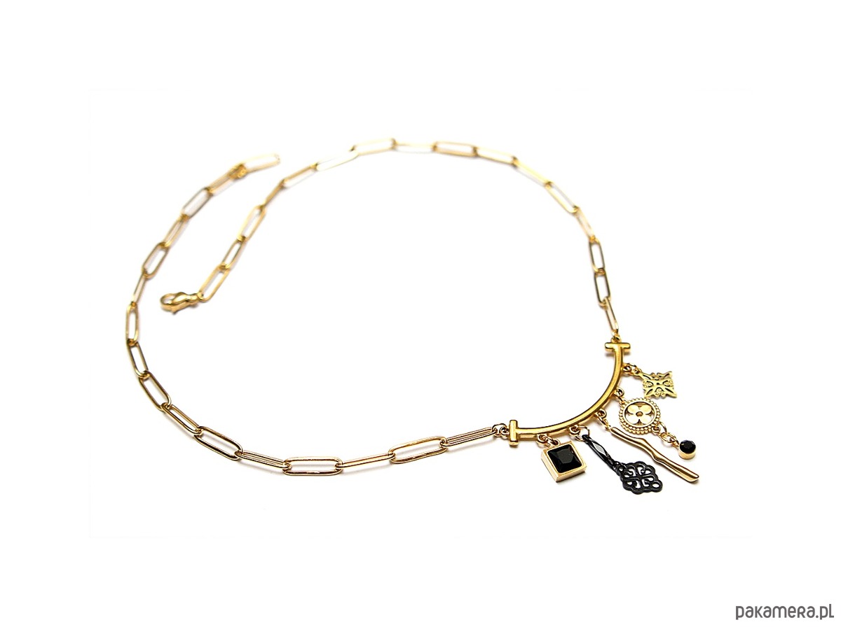 Naszyjnik wykonany w całości ze stali szlachetnej pozłacanej oraz stali szlachetnej w kolorze czarnym w połączeniu z cyrkoniami w oprawie. Całkowita długość naszyjnika ok. 42 cm.