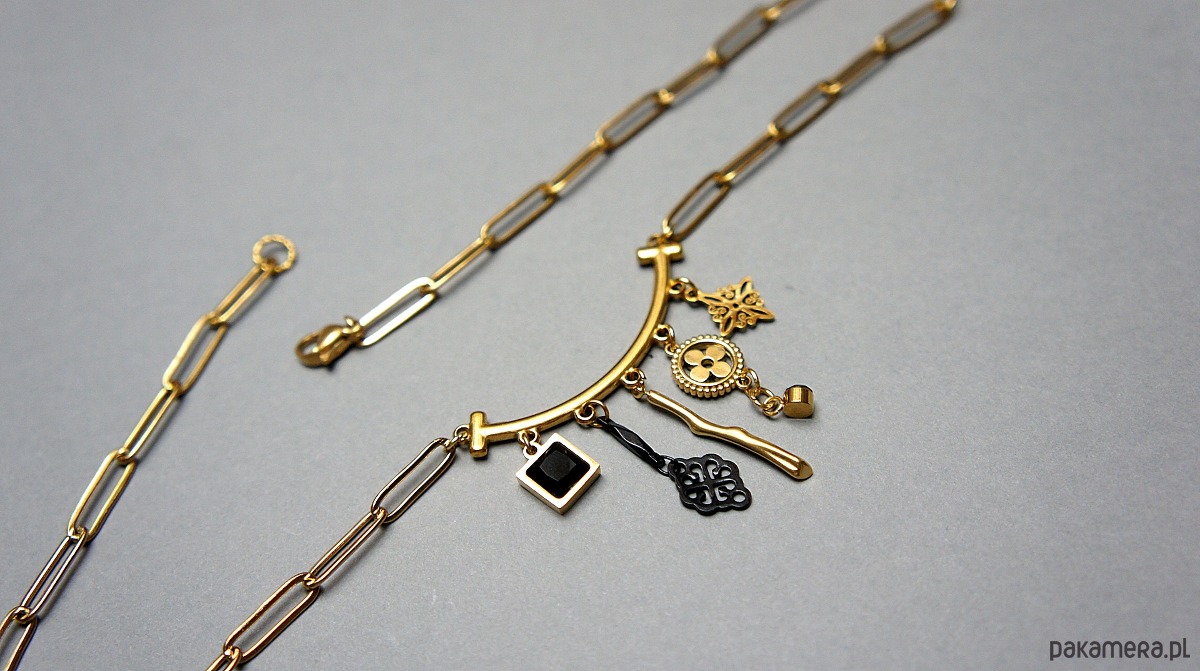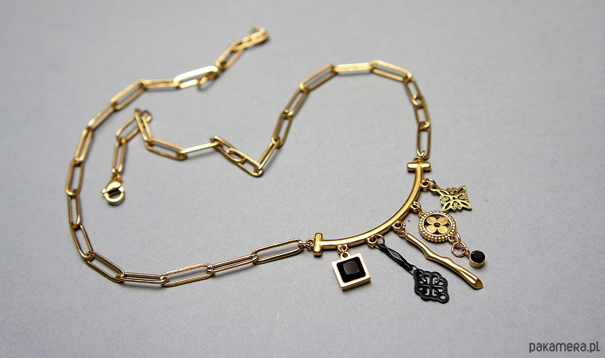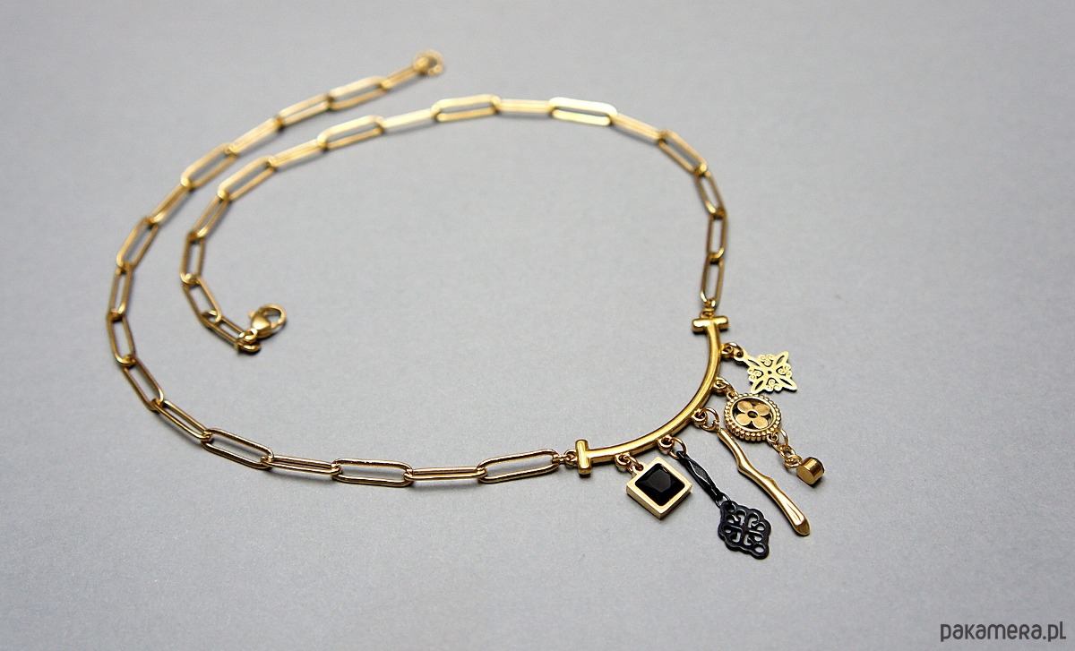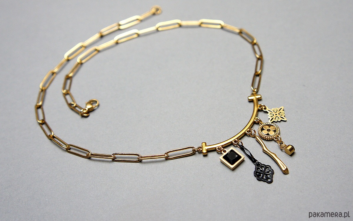 Naszyjnik wykonany w całości ze stali szlachetnej pozłacanej oraz stali szlachetnej w kolorze czarnym w połączeniu z cyrkoniami w oprawie. Całkowita długość naszyjnika ok. 42 cm.