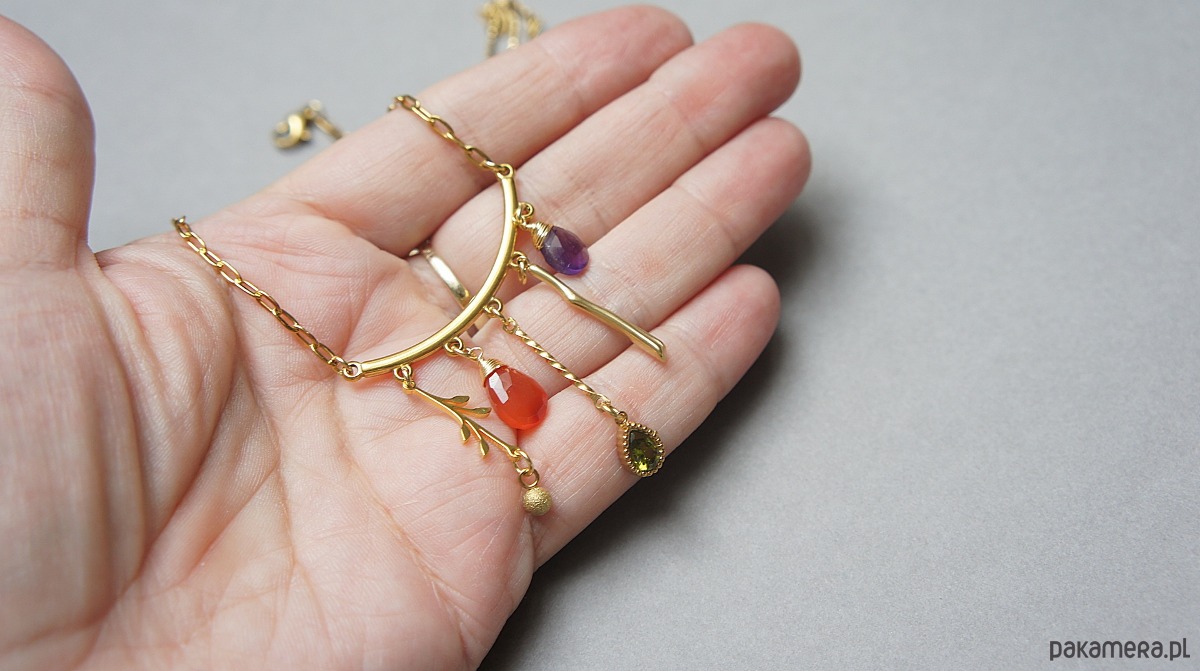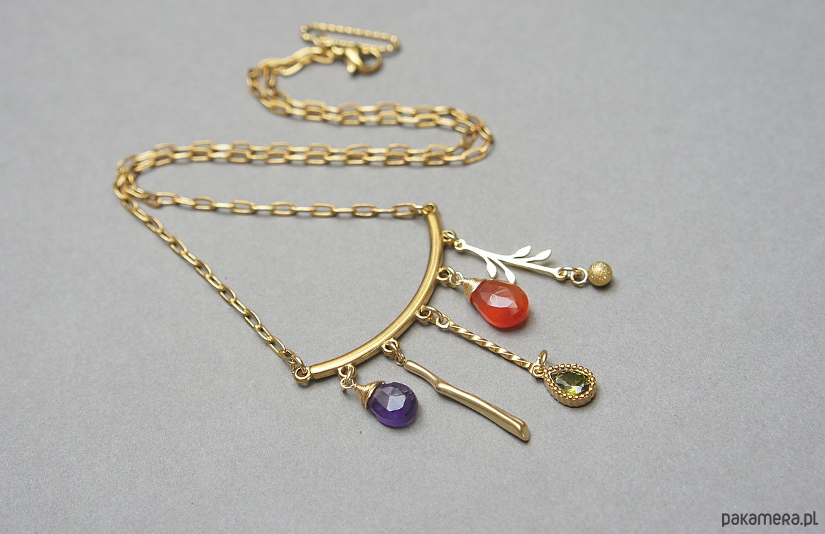Naszyjnik wykonany w całości ze stali szlachetnej w połączeniu z naturalnym ametystem, karneolem, cyrkonią w oprawie. Całkowita długość naszyjnika ok. 46,7 cm.