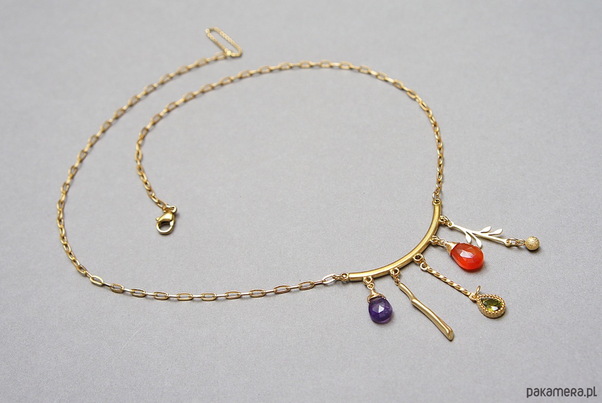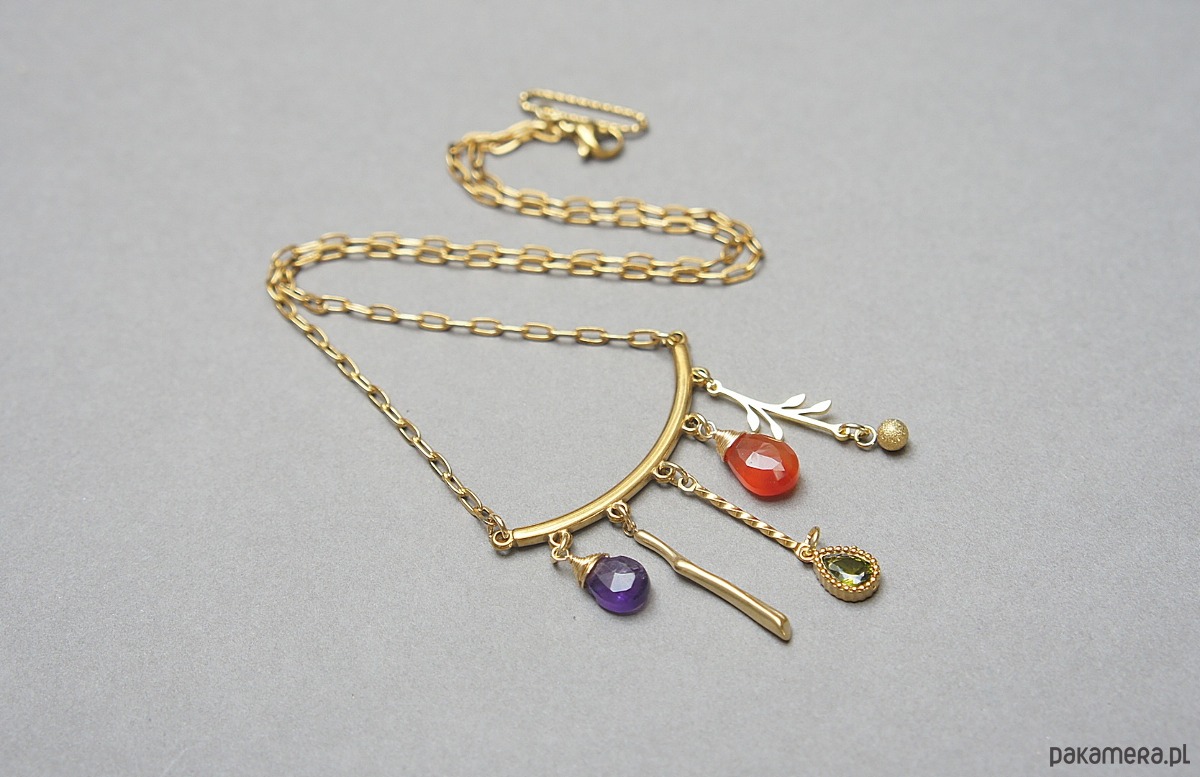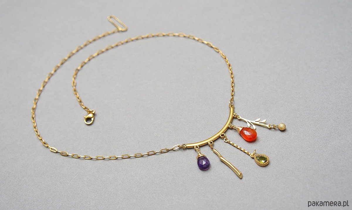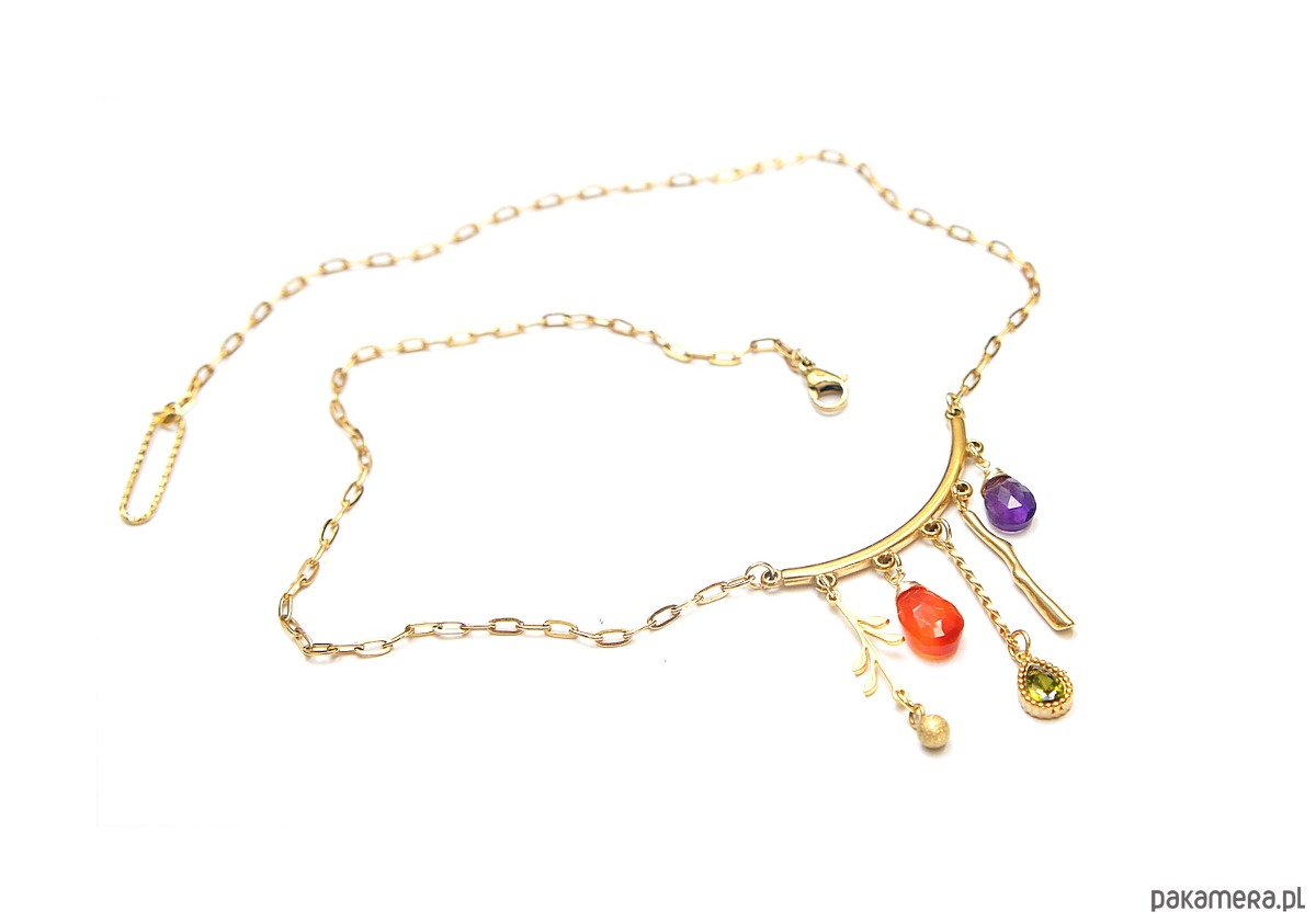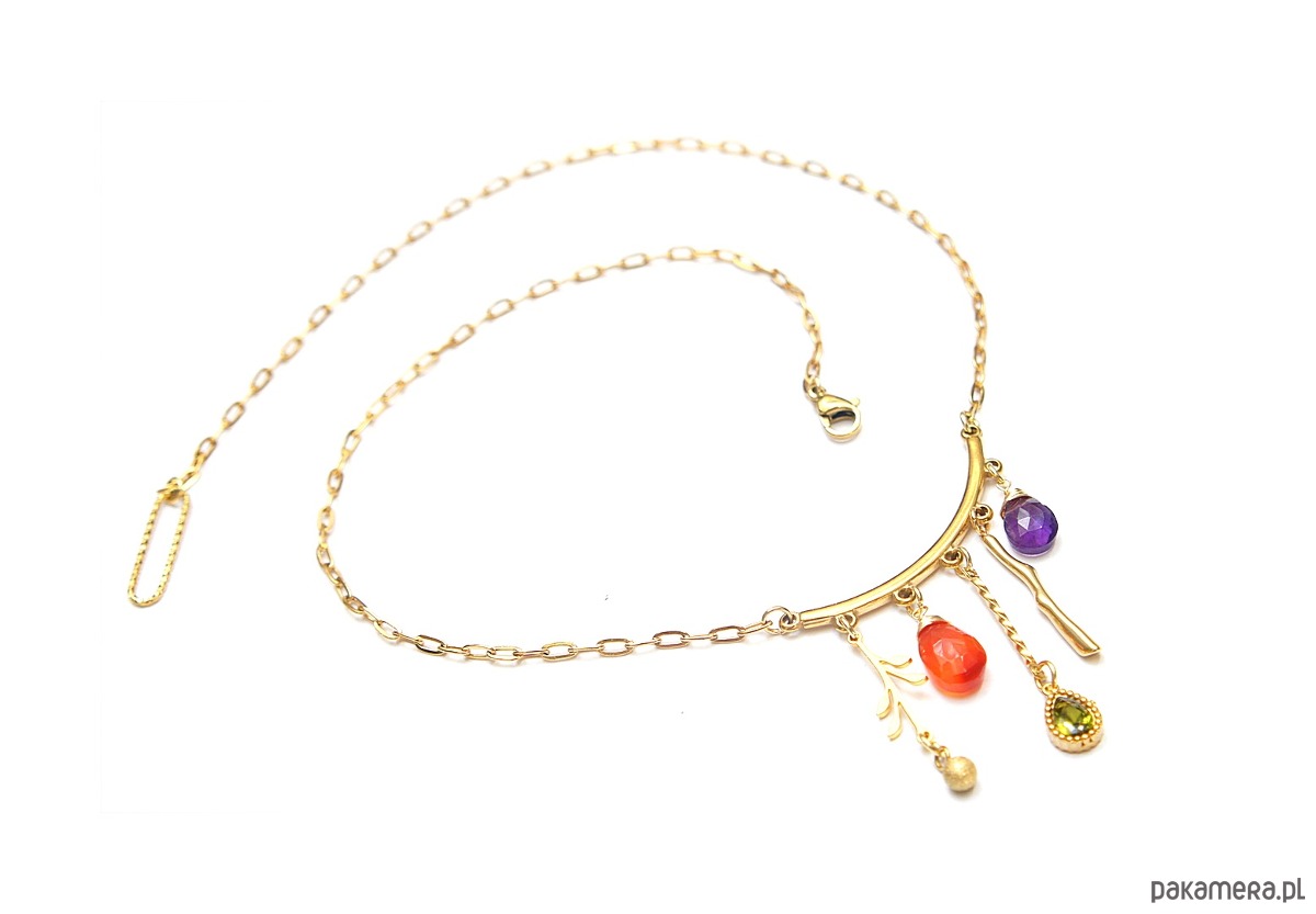 Naszyjnik wykonany w całości ze stali szlachetnej w połączeniu z naturalnym ametystem, karneolem, cyrkonią w oprawie. Całkowita długość naszyjnika ok. 46,7 cm.
