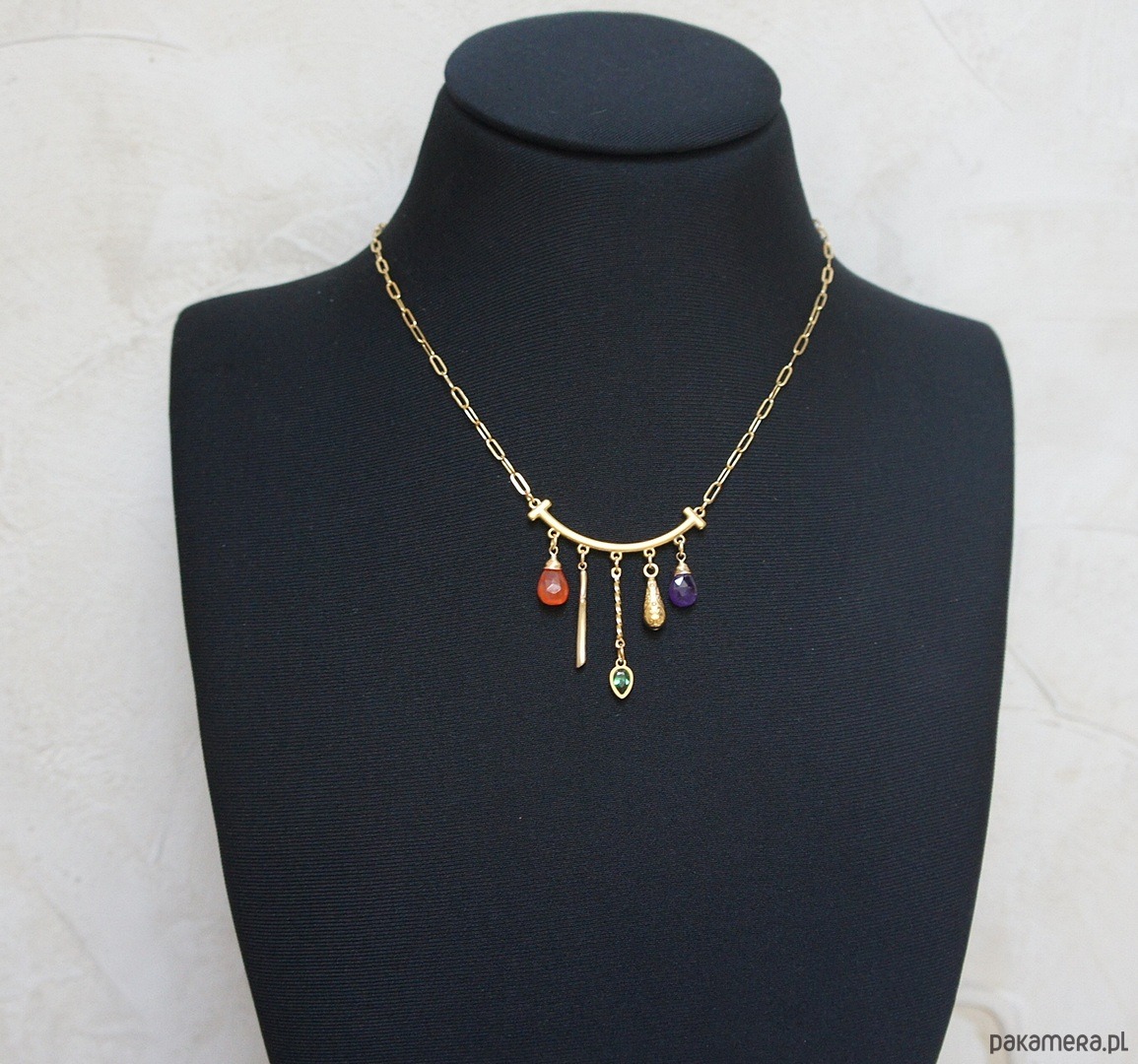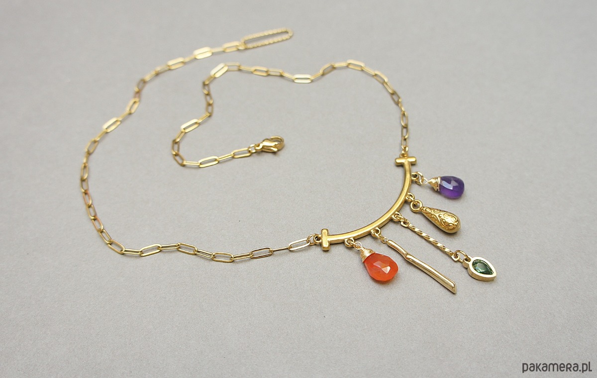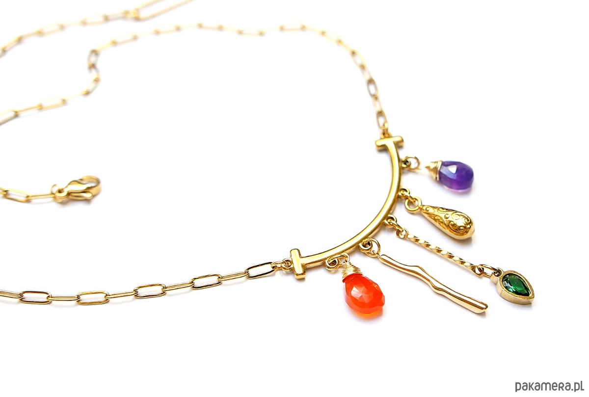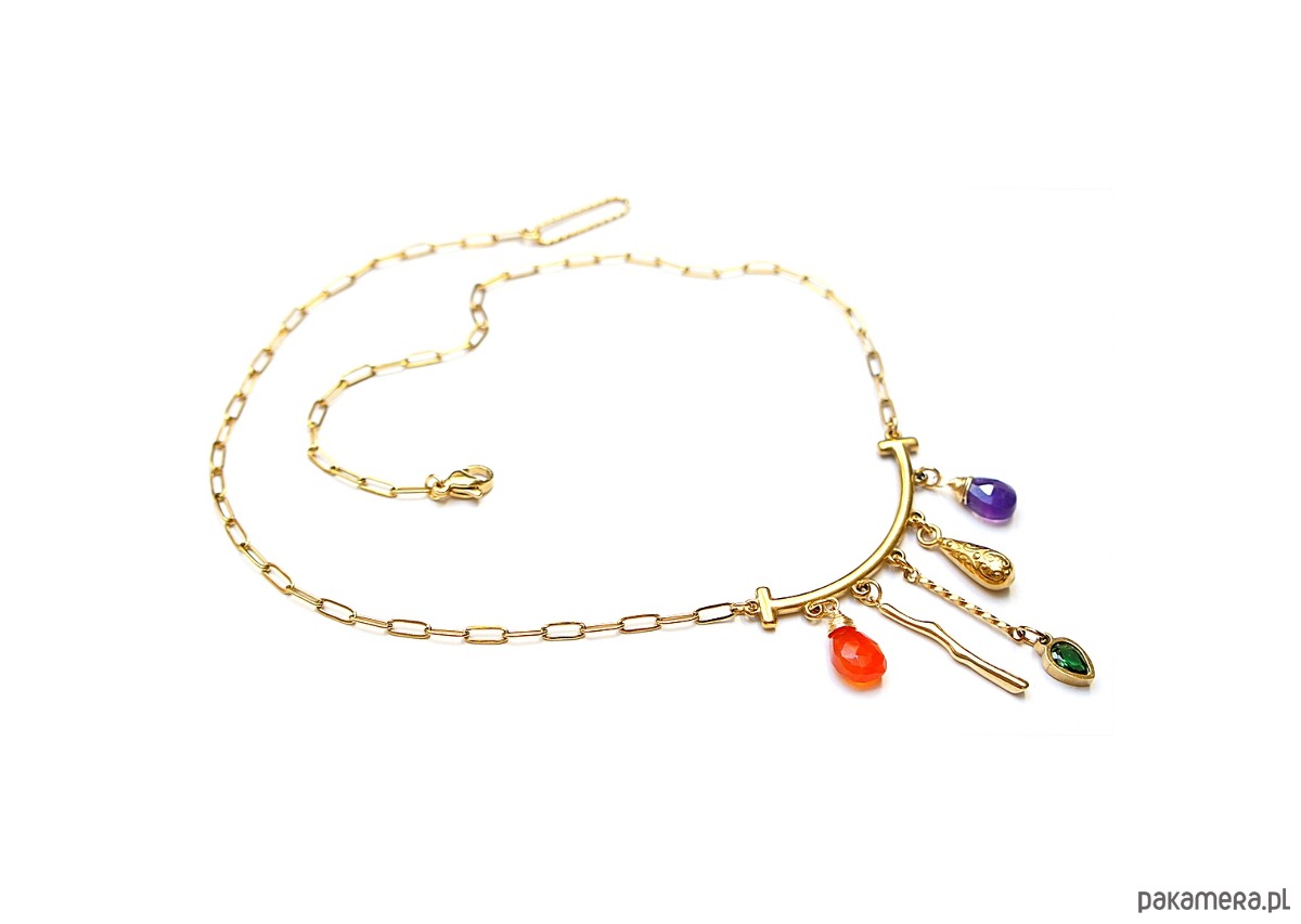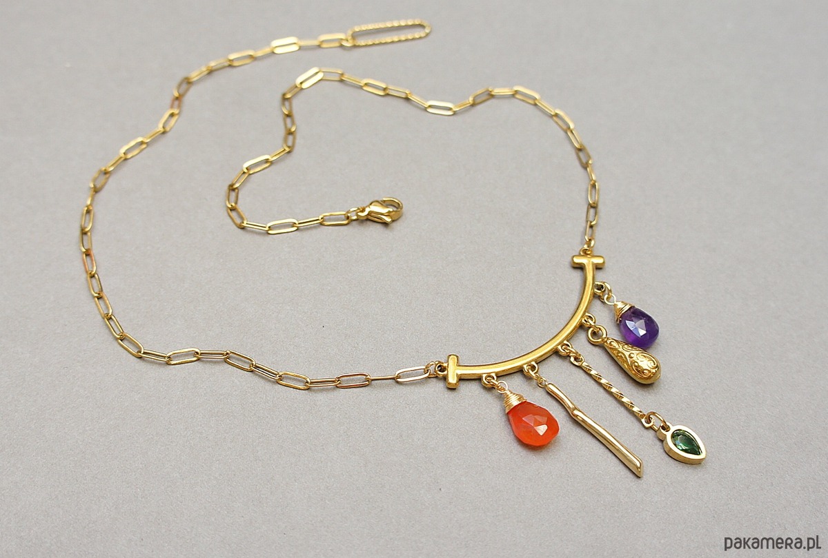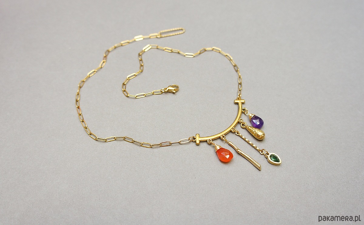 Naszyjnik wykonany w całości ze stali szlachetnej w połączeniu z naturalnym ametystem, karneolem, cyrkonią w oprawie. Całkowita długość naszyjnika ok. 43 cm.