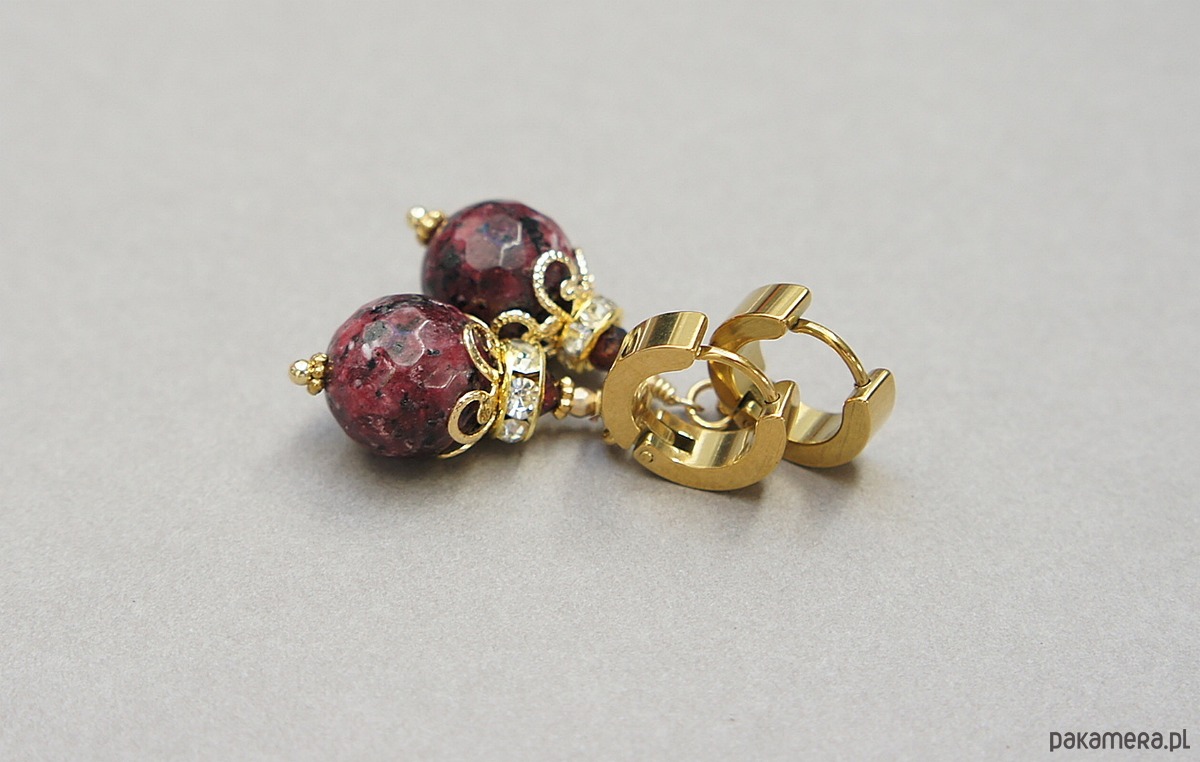 Kolczyki wykonane z naturalnych kamieni - fasetowane kule agatów [12mm],fasetowane kuleczki granatów [3mm] oraz z pozłacanej stali szlachetnej. Długość kolczyków: ok. 4,3cm. Bigle - kajdanki. Biżuteria ozdobnie zapakowana.