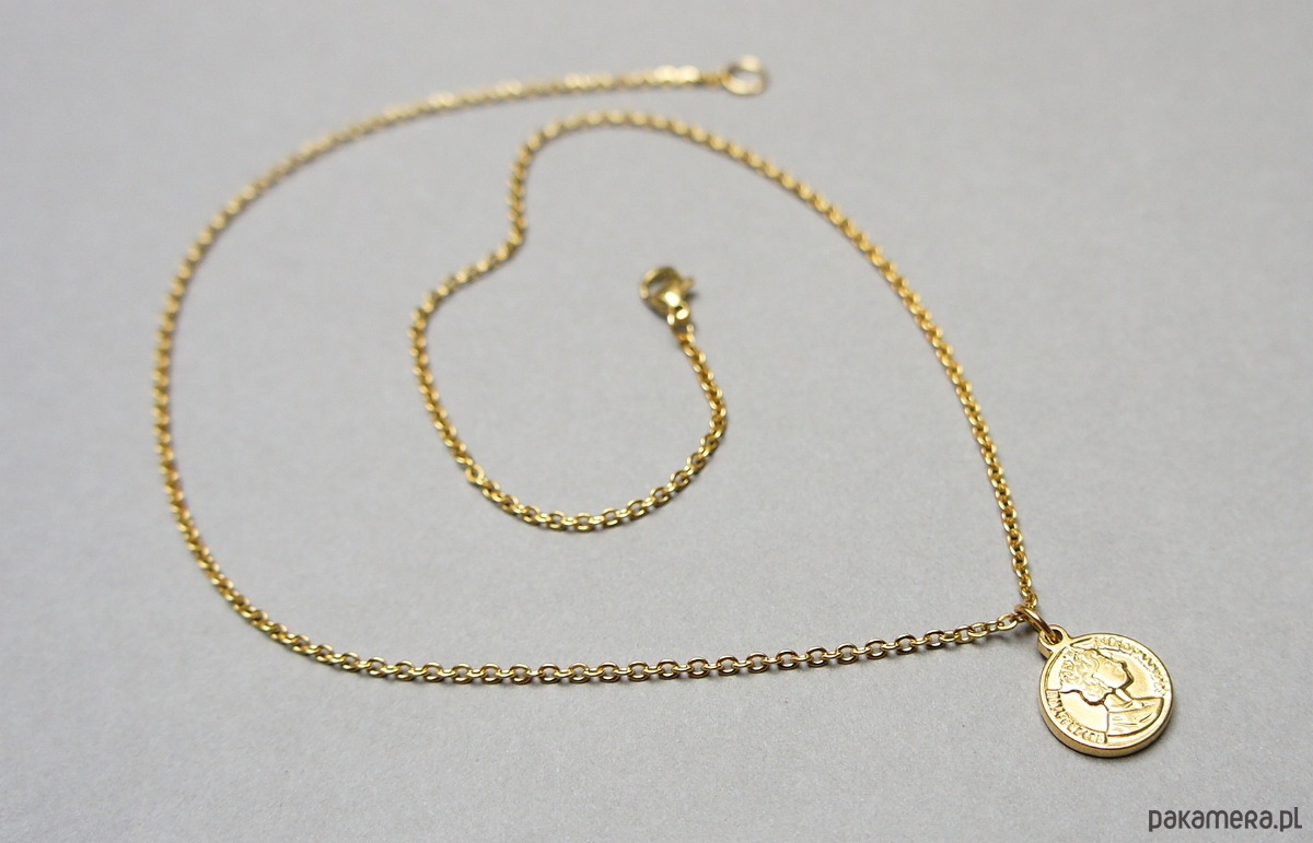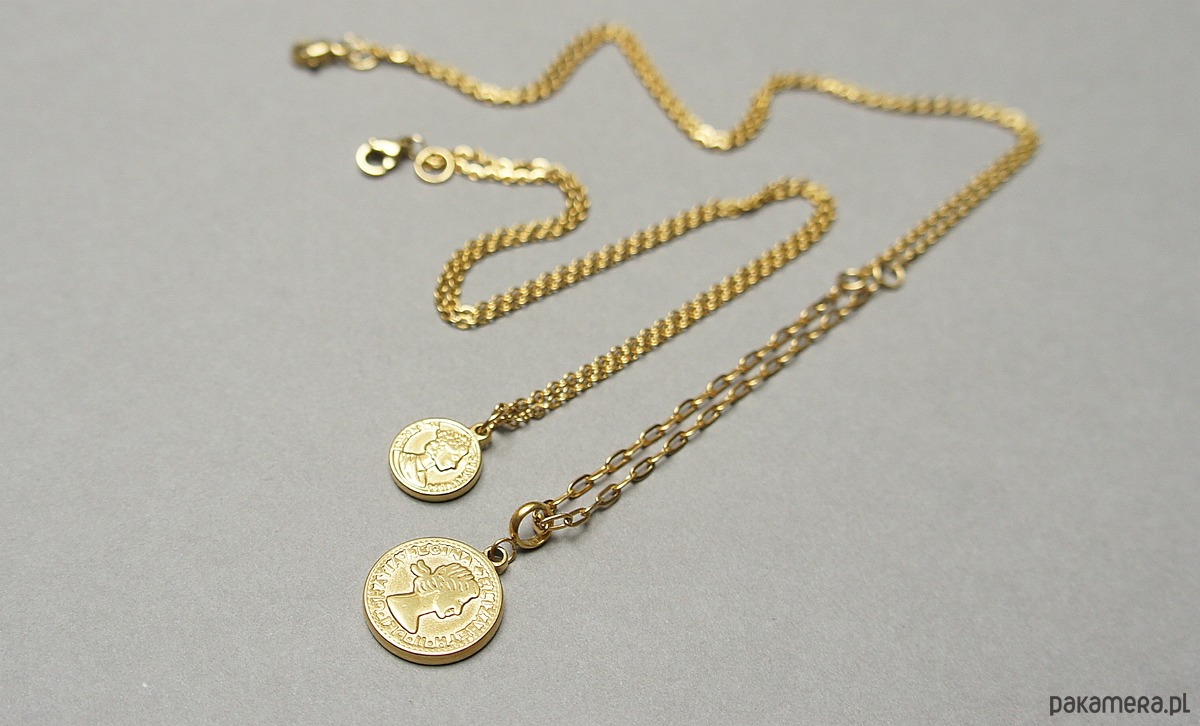 Krótki naszyjnik wykonany w całości z pozłacanej stali szlachetnej. Całkowita długość naszyjnika ok. 47cm; średnica monety - 13mm . Biżuteria ozdobnie zapakowana.Do kompletu można dokupić drugi naszyjnik przedstawiony na zdjęciach. Oferta dotyczy naszyjnika z mniejszą zawieszką.