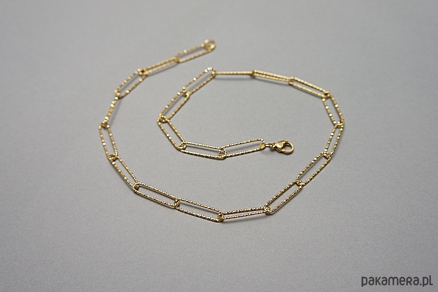 Krótki naszyjnik wykonany w całości z pozłacanej stali szlachetnej. Wielkość ogniw w łańcuszku: 20 x 5mm. Całkowita długość naszyjnika ok. 40,5cm. Biżuteria ozdobnie zapakowana.