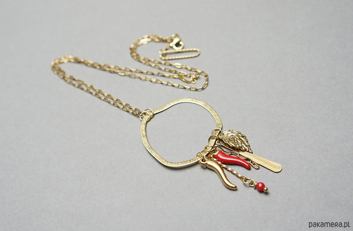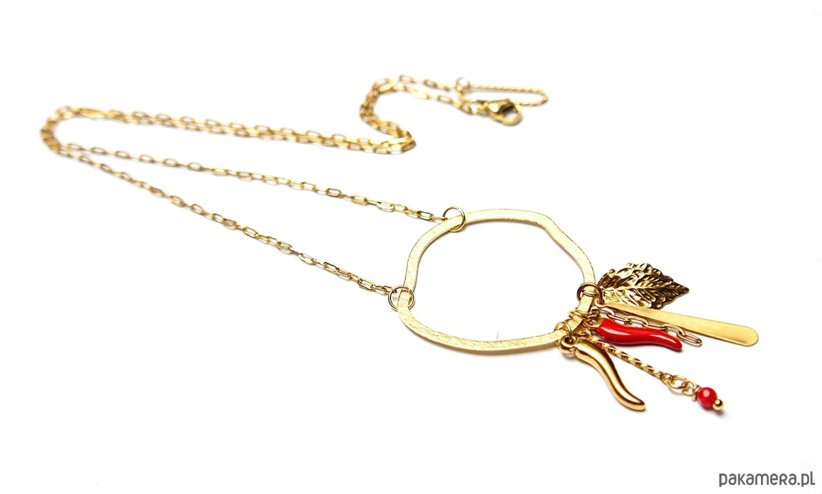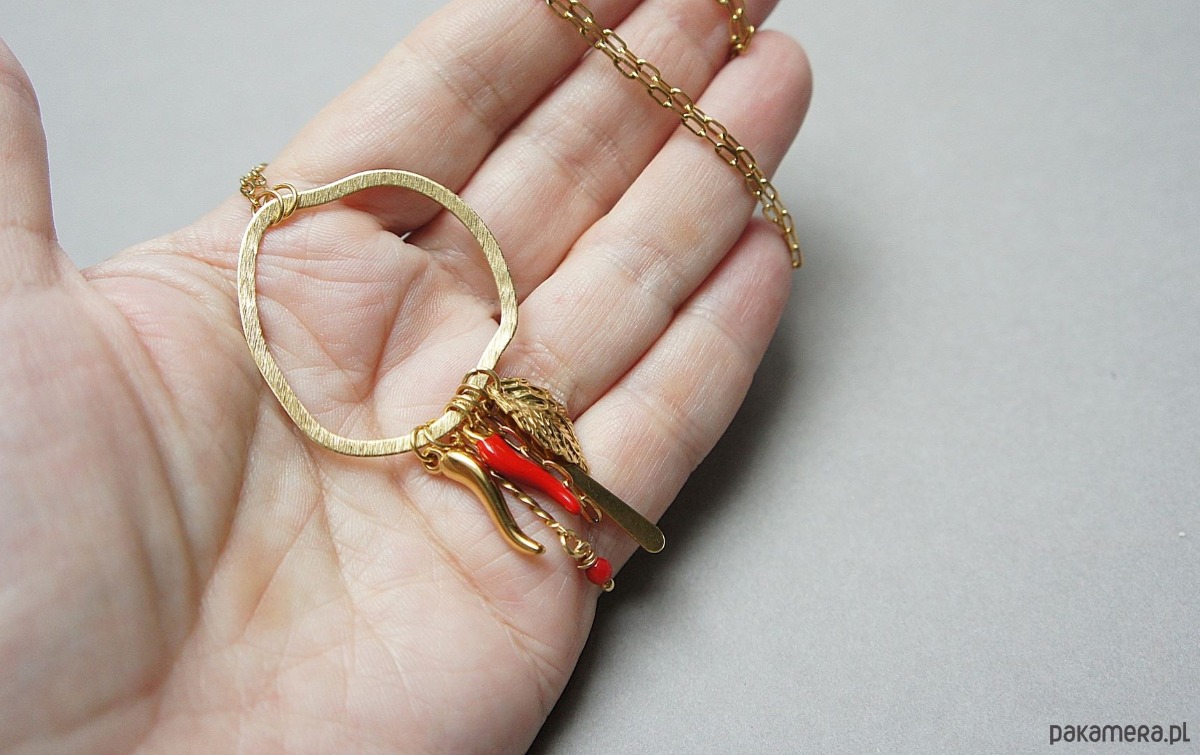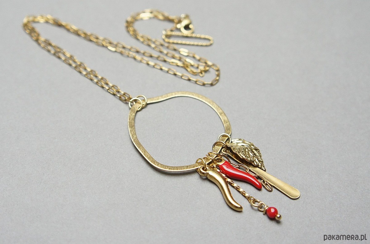 Naszyjnik wykonany w całości ze stali szlachetnej w połączeniu z czerwonym, fasetowanym koralem [3mm] oraz zawieszkami. Całkowita długość naszyjnika ok. 55 cm. Średnica obręczy - 35mm-38mm. Biżuteria ozdobnie zapakowana. Do kompletu można dokupić kolczyki widoczne na zdjęciu.