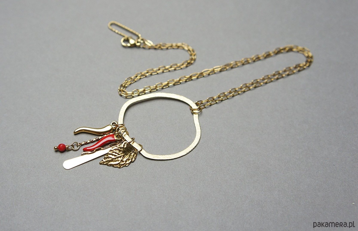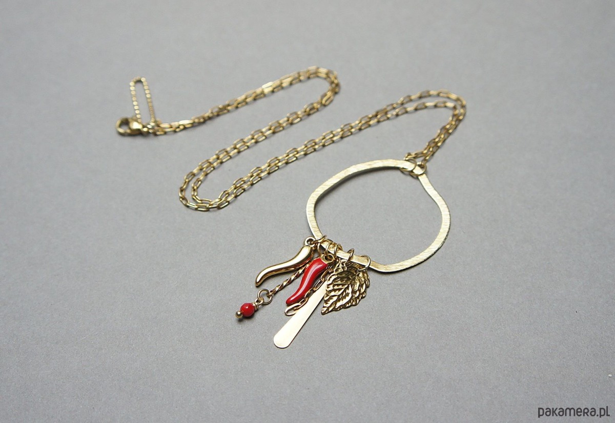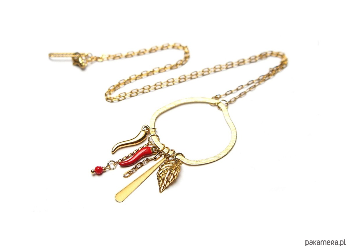 Naszyjnik wykonany w całości ze stali szlachetnej w połączeniu z czerwonym, fasetowanym koralem [3mm] oraz zawieszkami. Całkowita długość naszyjnika ok. 55 cm. Średnica obręczy - 35mm-38mm. Biżuteria ozdobnie zapakowana. Do kompletu można dokupić kolczyki widoczne na zdjęciu.