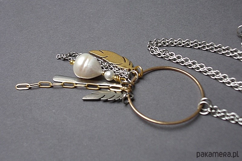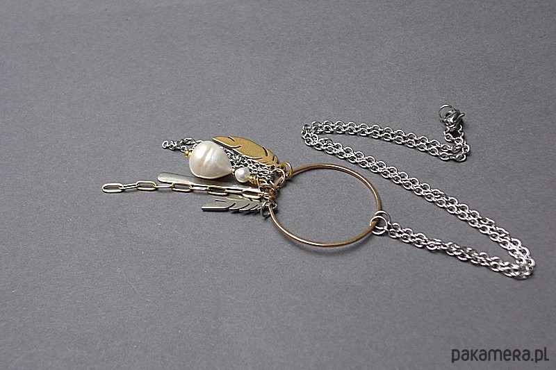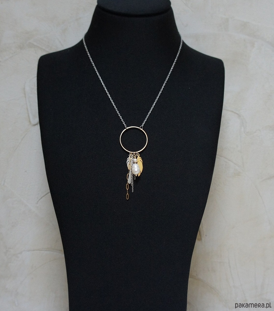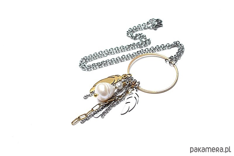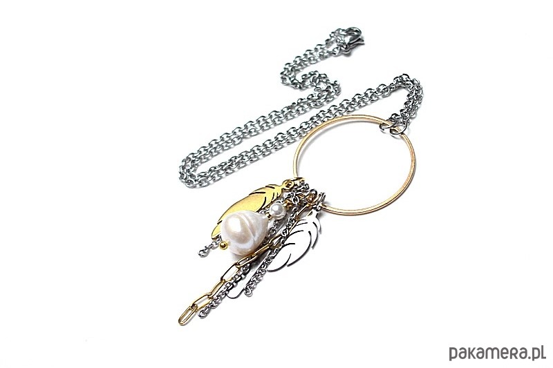 Naszyjnik wykonany w całości ze stali szlachetnej w połączeniu z perłą słodkowodną, perłą Swarovski. Całkowita długość naszyjnika 49 cm. Średnica obręczy - 30mm.