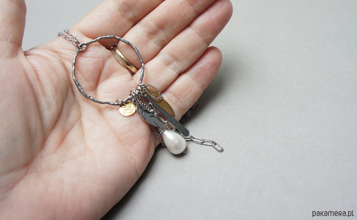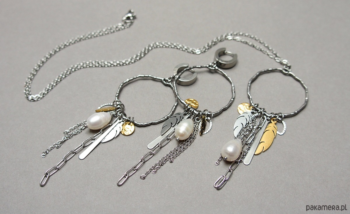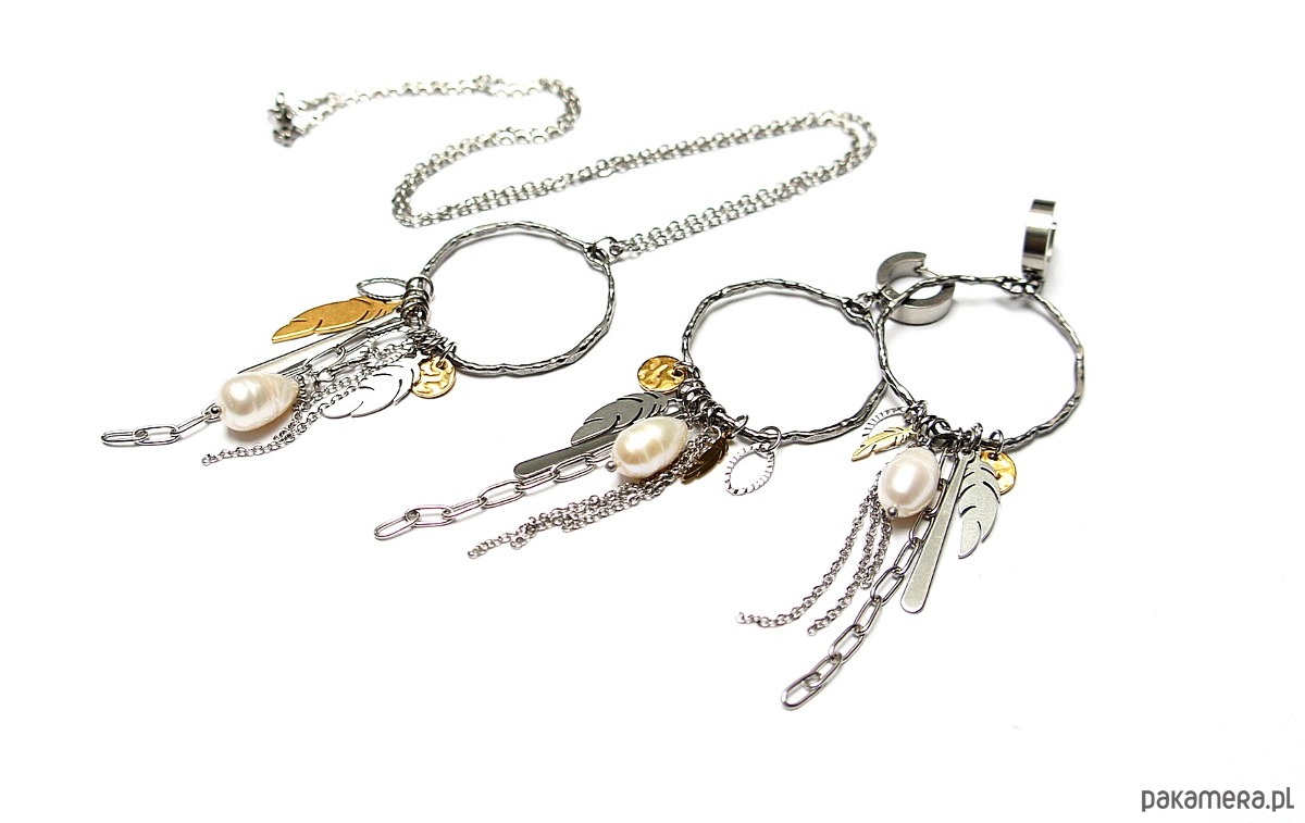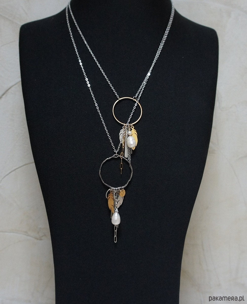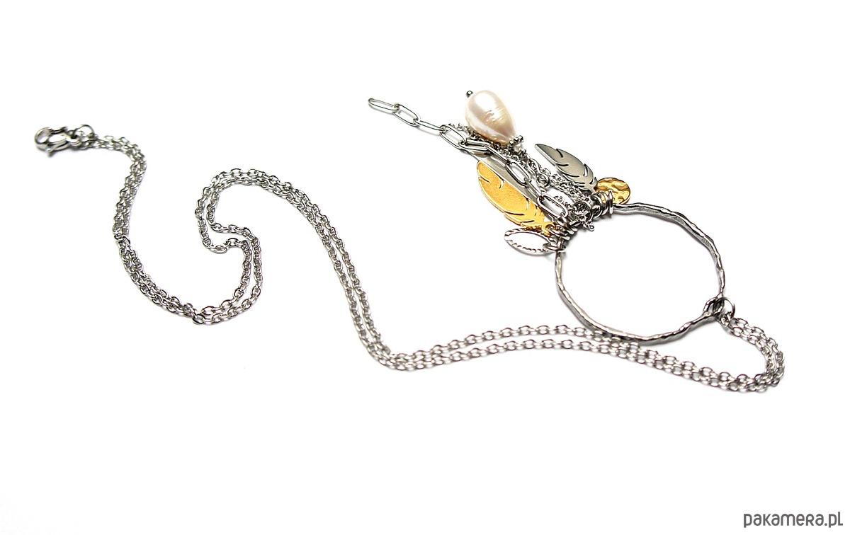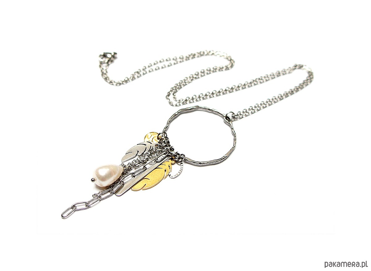 Naszyjnik wykonany w całości ze stali szlachetnej w połączeniu z perłą słodkowodną oraz zawieszkami. Całkowita długość naszyjnika 57 cm. Średnica obręczy - 34mm.