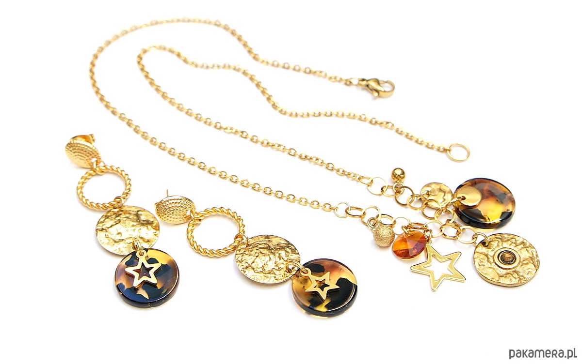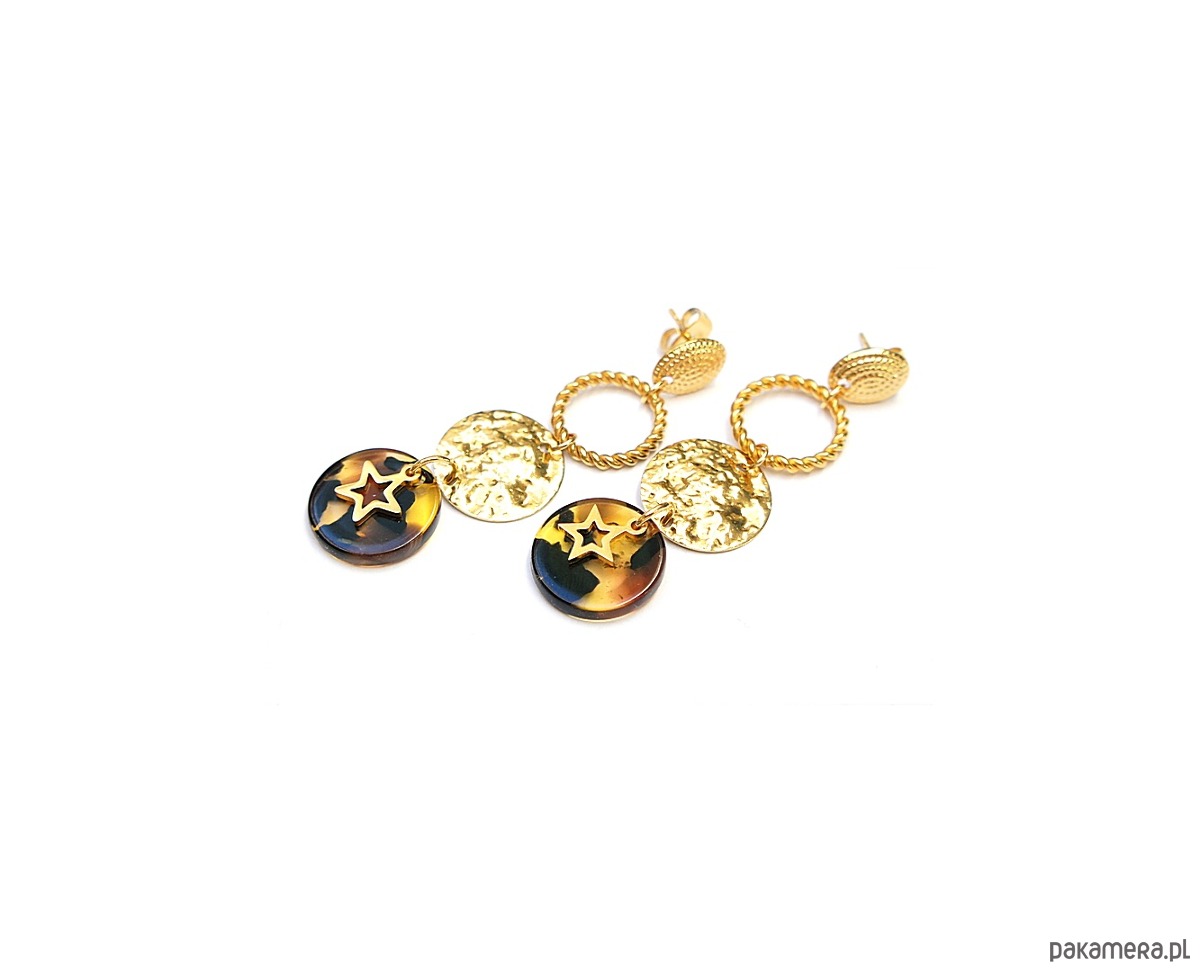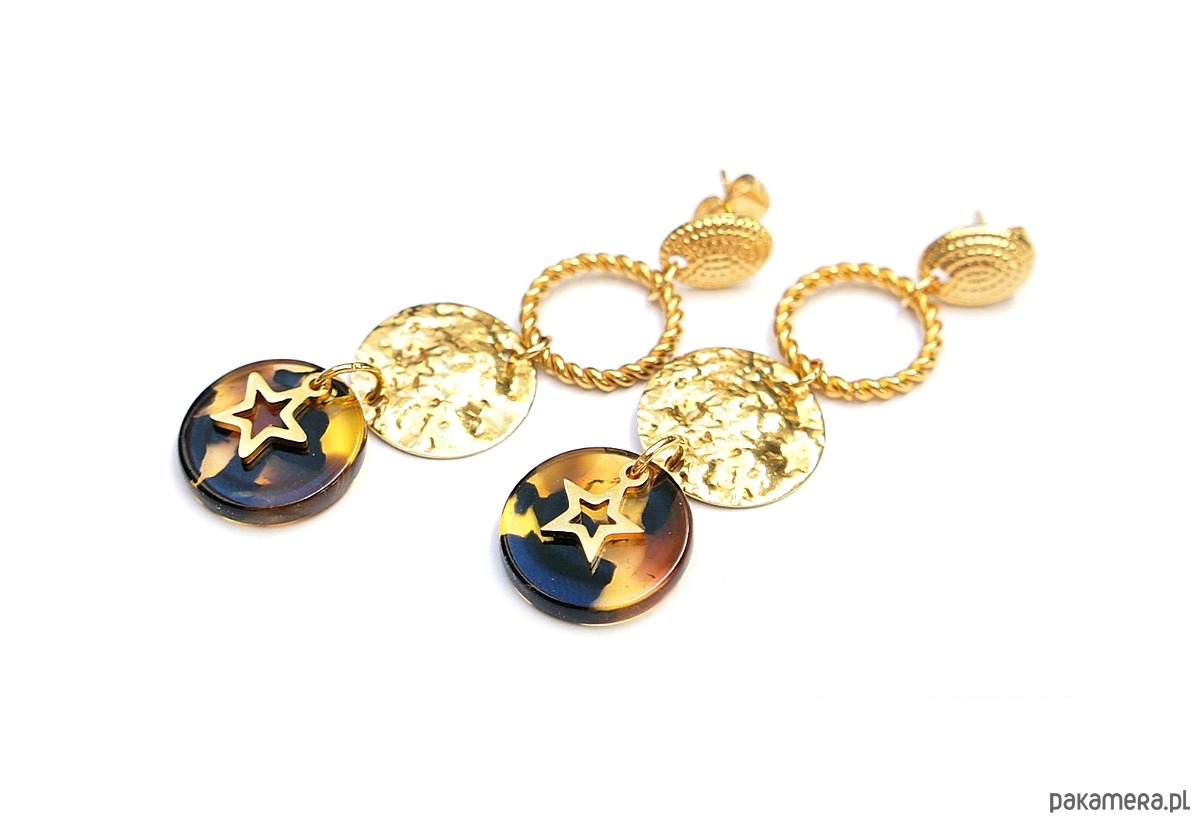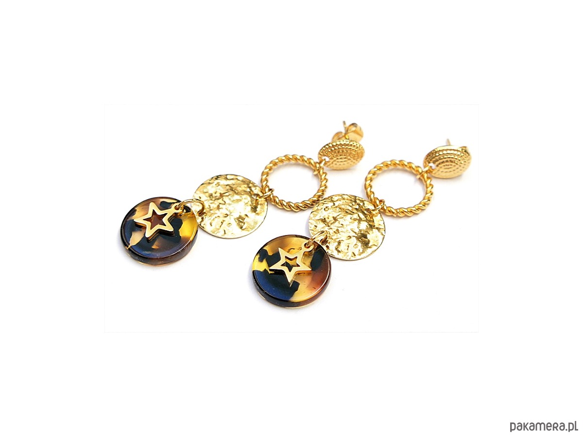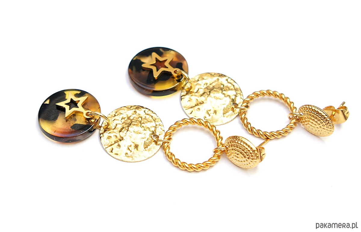 Długie kolczyki wykonane ze stali szlachetnej pozłacanej, gniecionych blaszek z mosiądzu oraz z monetek z żywicy [10mm] oraz zawieszkami. Długość kolczyków: ok. 5cm. Do kompletu można dokupić naszyjnik przedstawiony na zdjęciach.