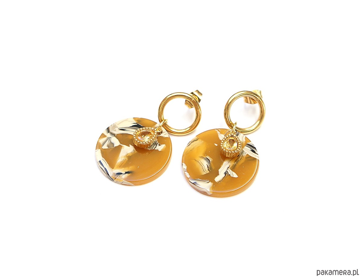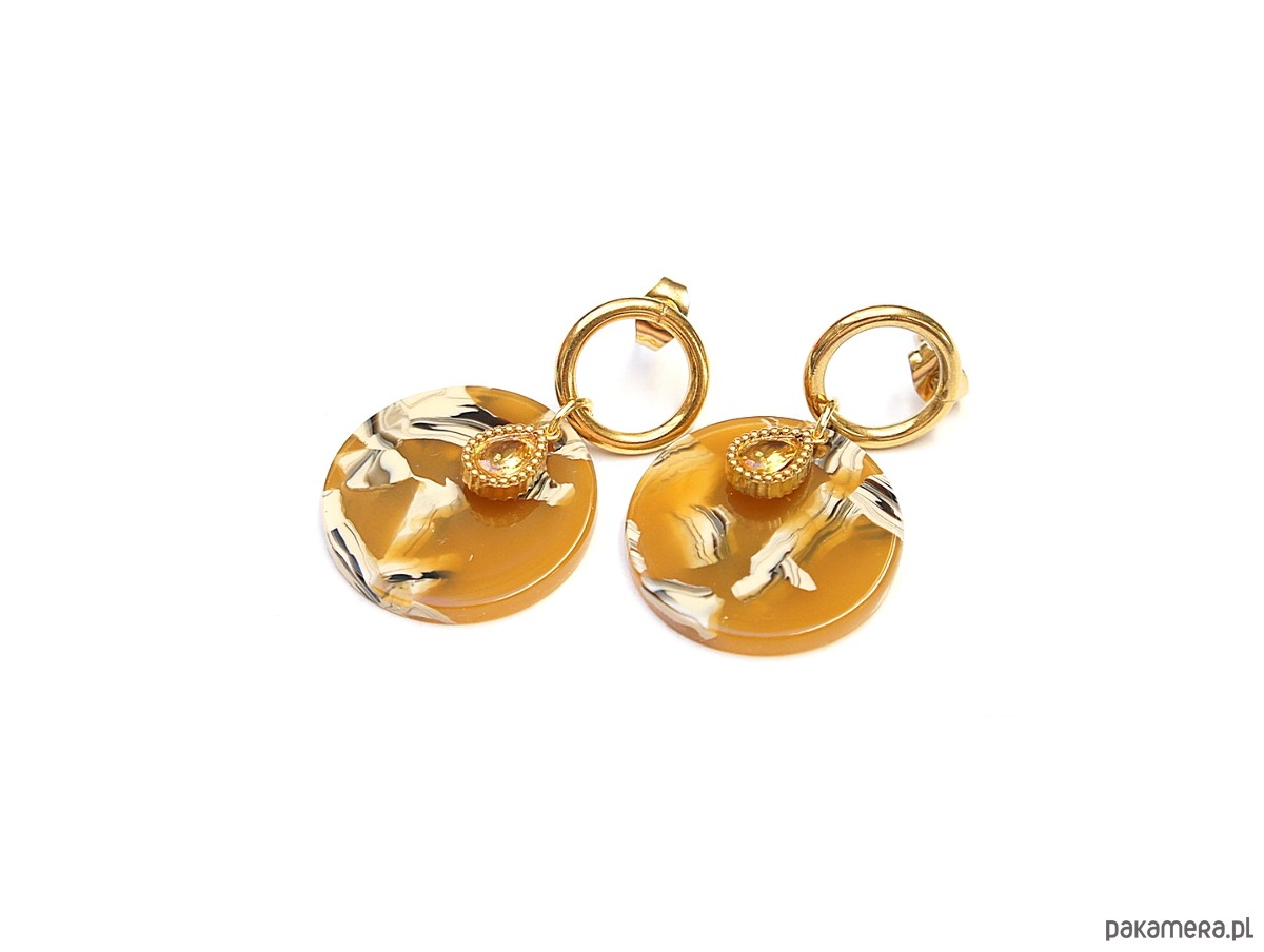 Kolczyki wykonane ze stali szlachetnej pozłacanej, monetek z żywicy [śr. 23mm] oraz cyrkoniami w okuciu. Długość kolczyków: ok. 3,8m.