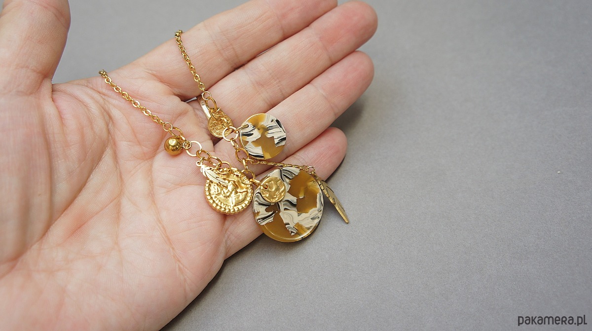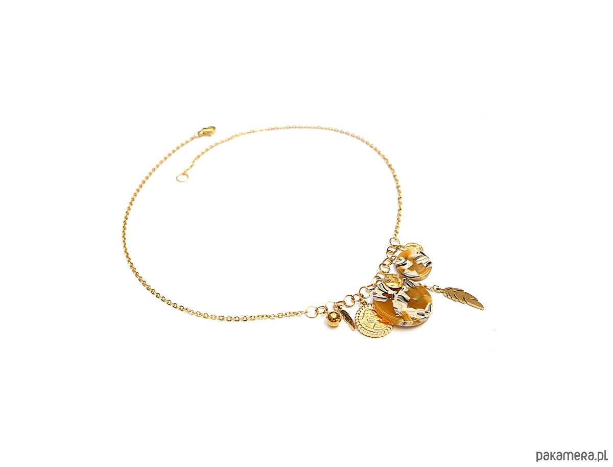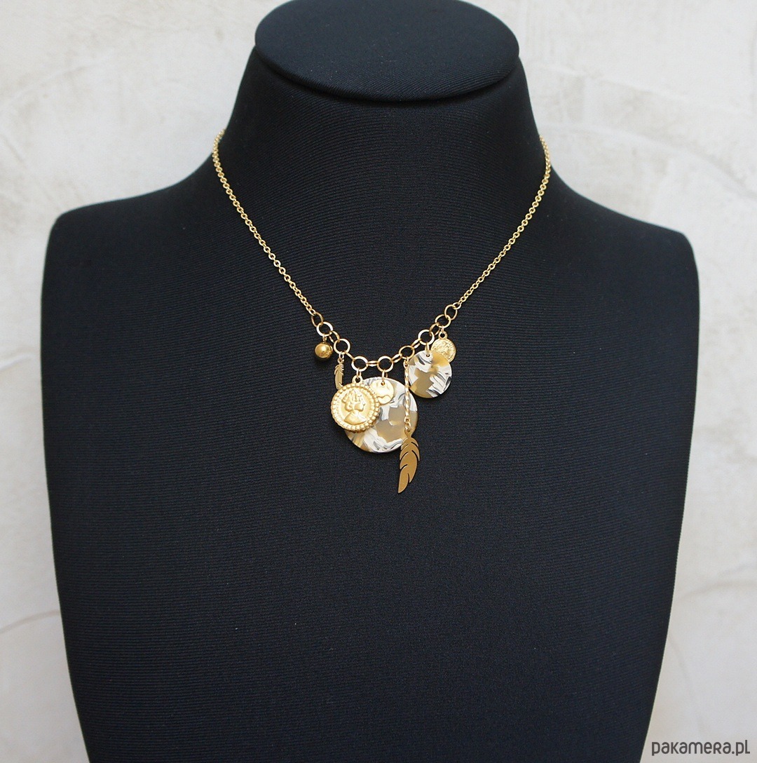 Krótki naszyjnik wykonany w całości ze stali szlachetnej pozłacanej w połączeniu z monetką żywicy [16mm i 24mm] oraz zawieszkami. Całkowita długość naszyjnika ok. 42,5cm. Biżuteria ozdobnie zapakowana.