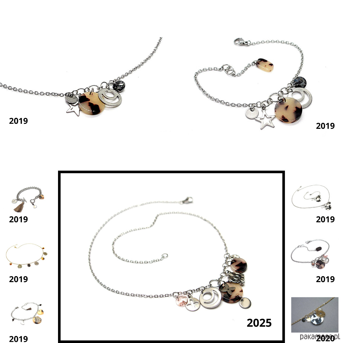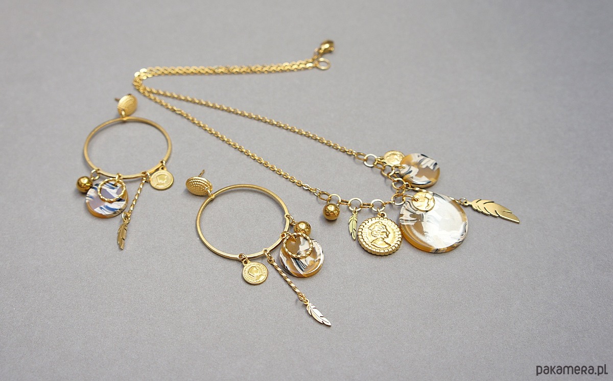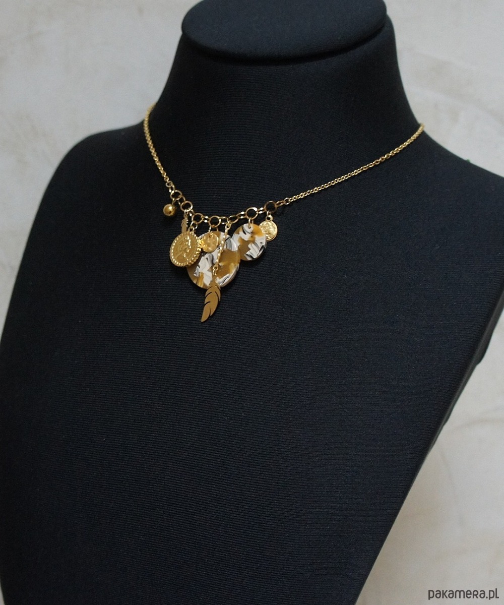 Krótki naszyjnik wykonany w całości ze stali szlachetnej pozłacanej w połączeniu z monetką żywicy [16mm i 24mm] oraz zawieszkami. Całkowita długość naszyjnika ok. 42,5cm. Biżuteria ozdobnie zapakowana.