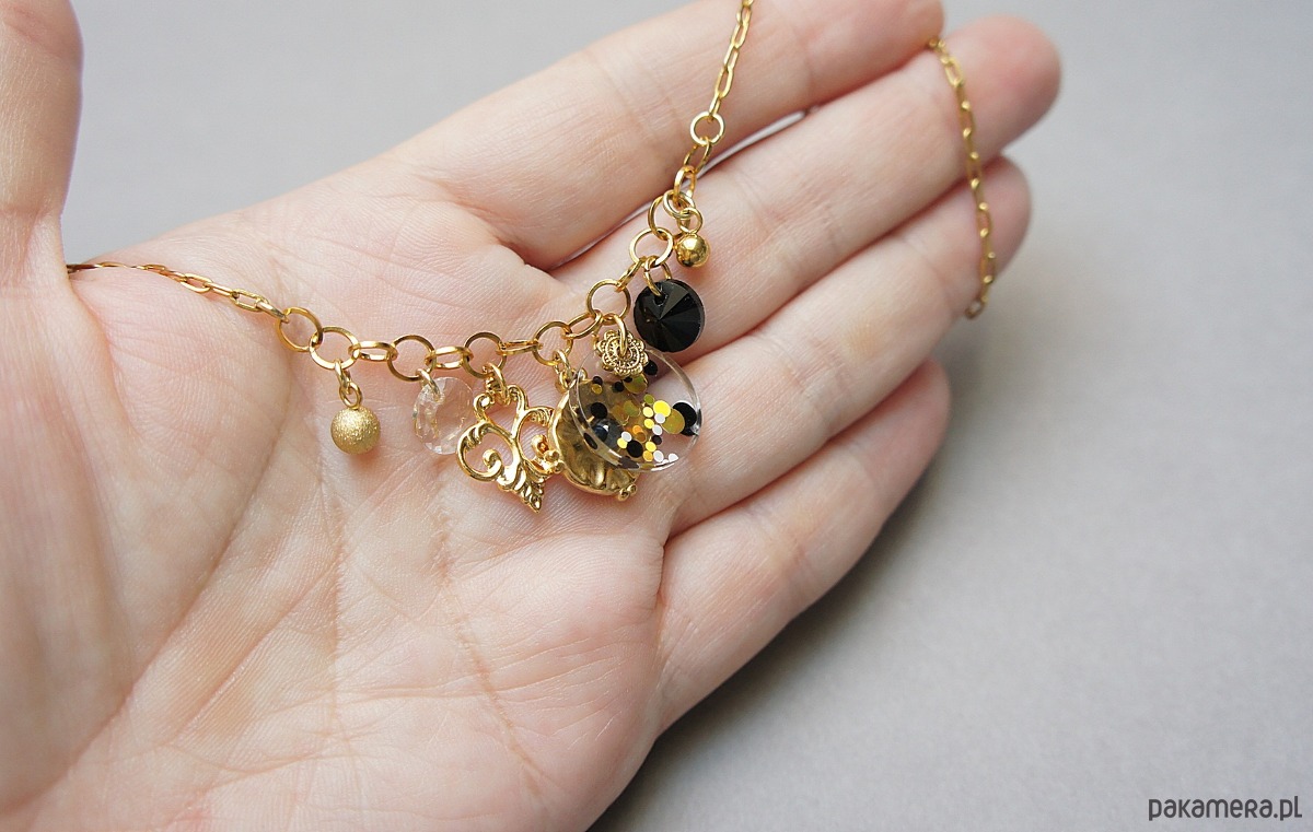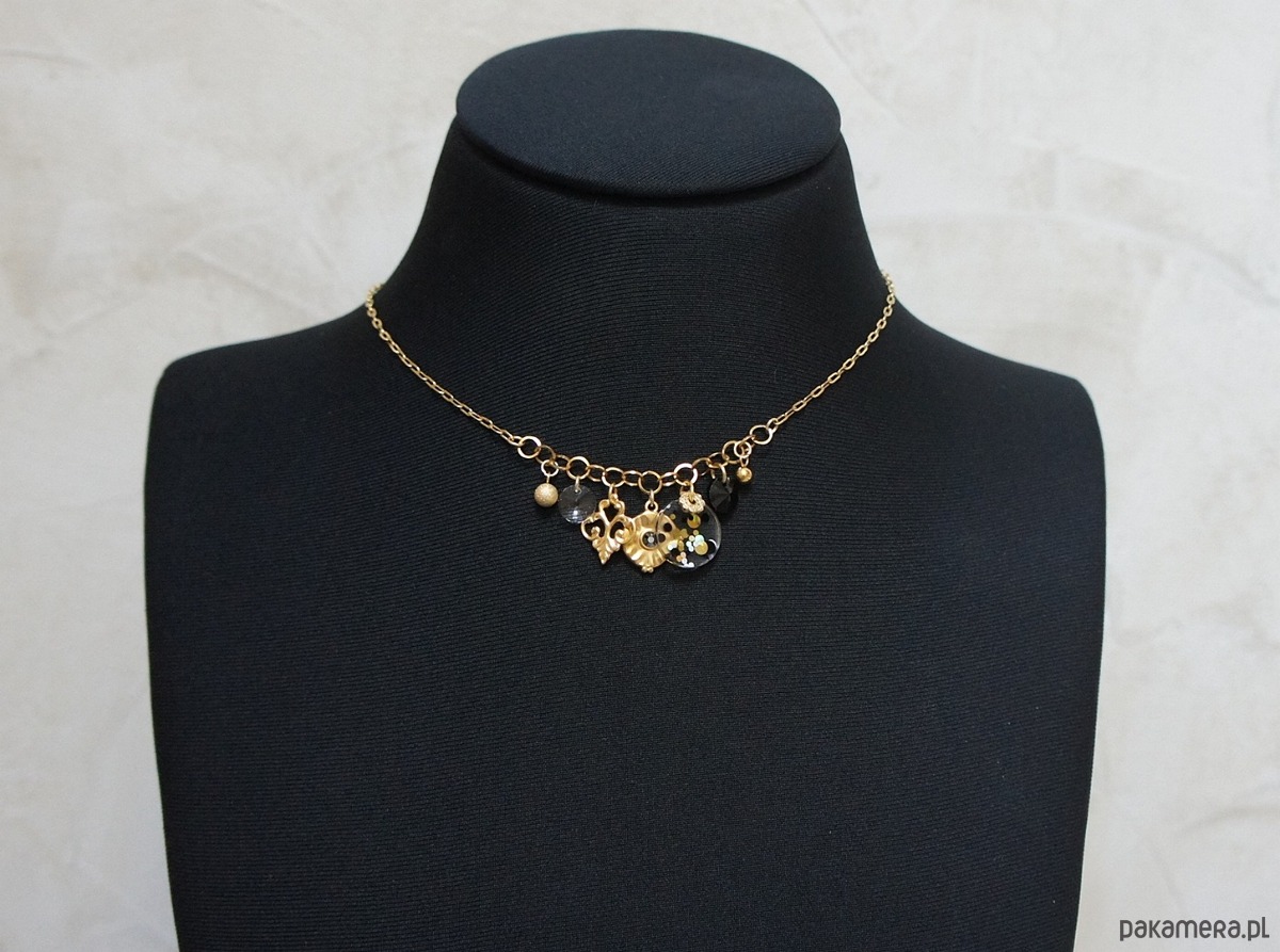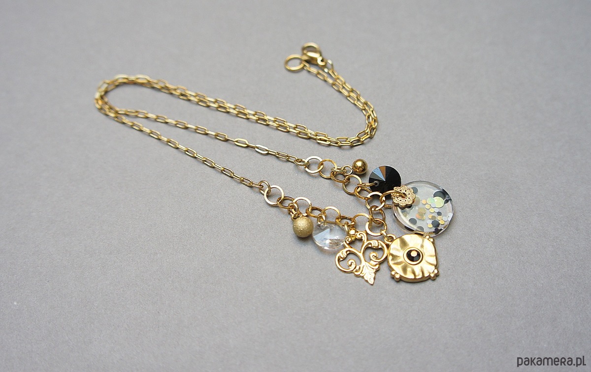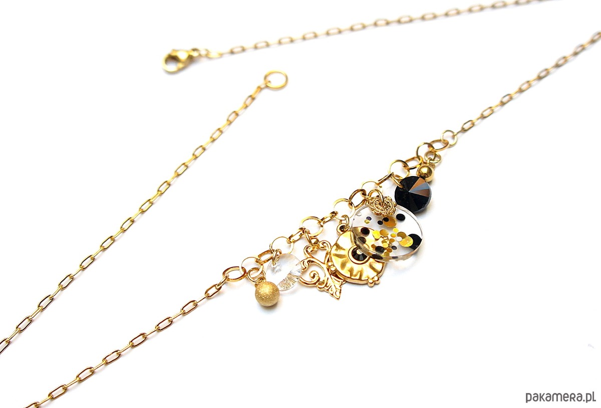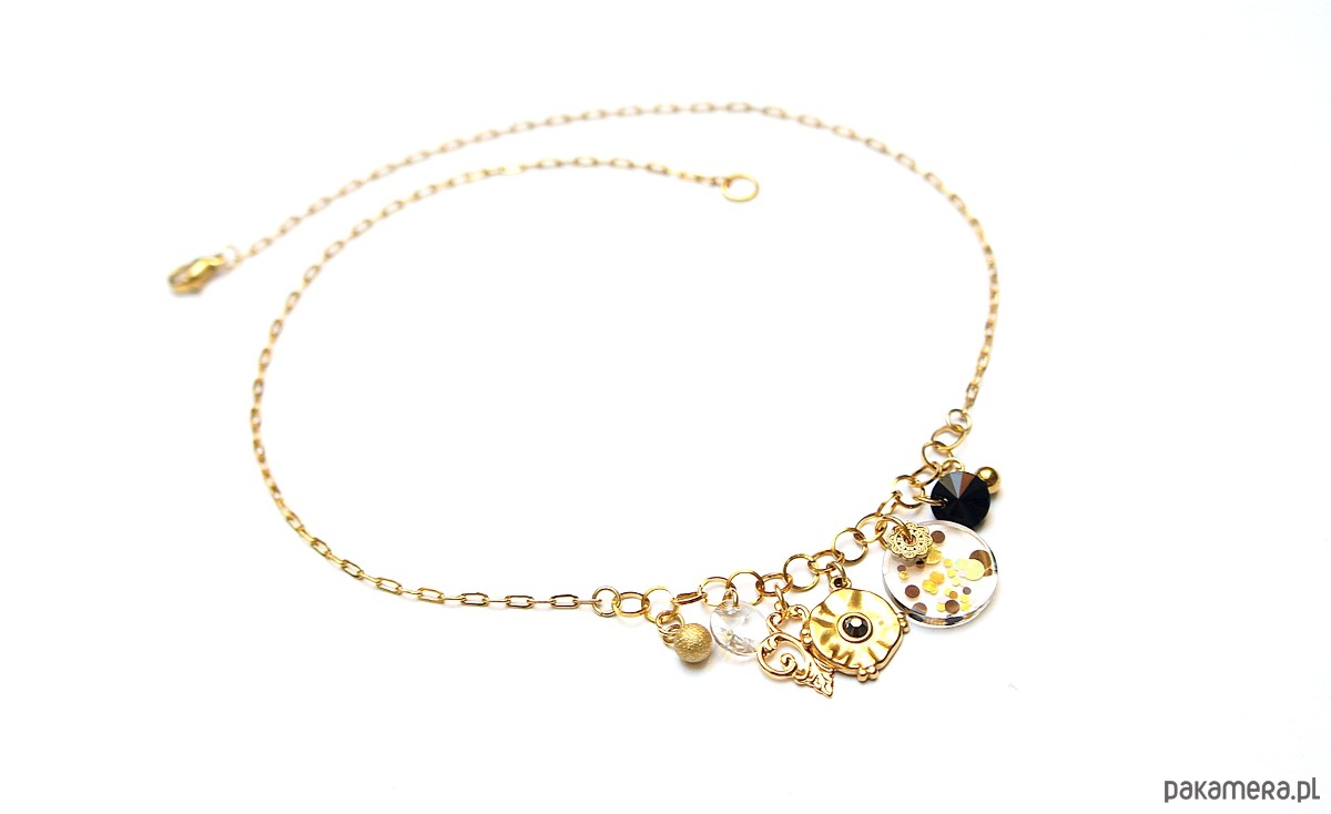 Krótki naszyjnik wykonany w całości ze stali szlachetnej pozłacanej w połączeniu z monetką żywicy [15mm], kryształkami [8mm] oraz zawieszkami (w tym zawieszka z kryształkiem Swarovski). Całkowita długość naszyjnika ok. 42,5cm. Biżuteria ozdobnie zapakowana.