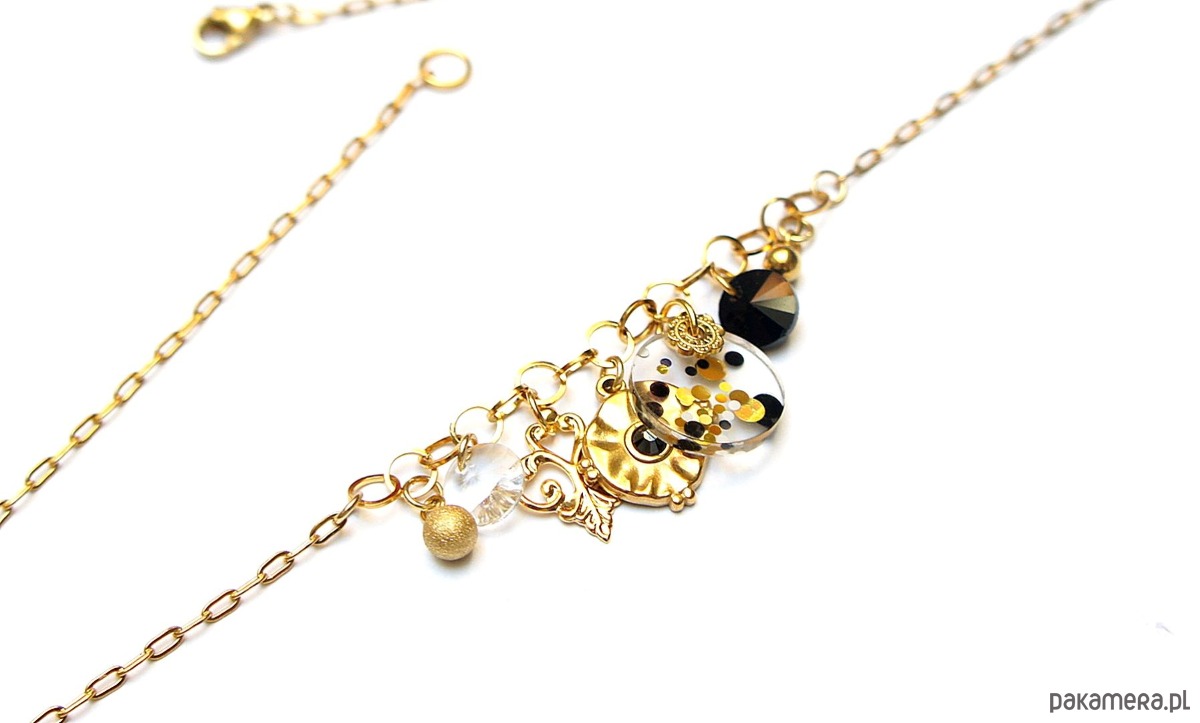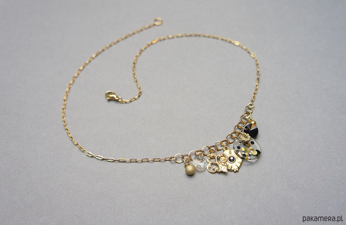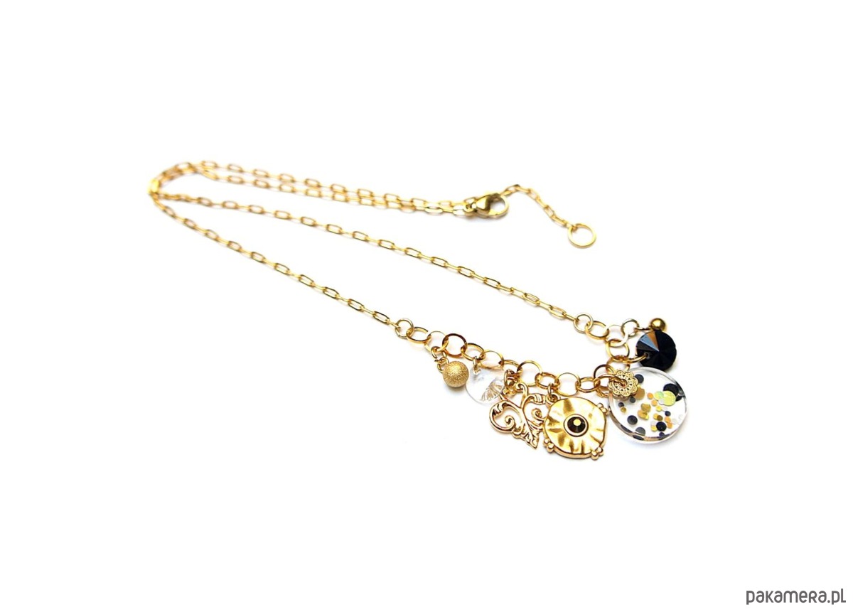 Krótki naszyjnik wykonany w całości ze stali szlachetnej pozłacanej w połączeniu z monetką żywicy [15mm], kryształkami [8mm] oraz zawieszkami (w tym zawieszka z kryształkiem Swarovski). Całkowita długość naszyjnika ok. 42,5cm. Biżuteria ozdobnie zapakowana.