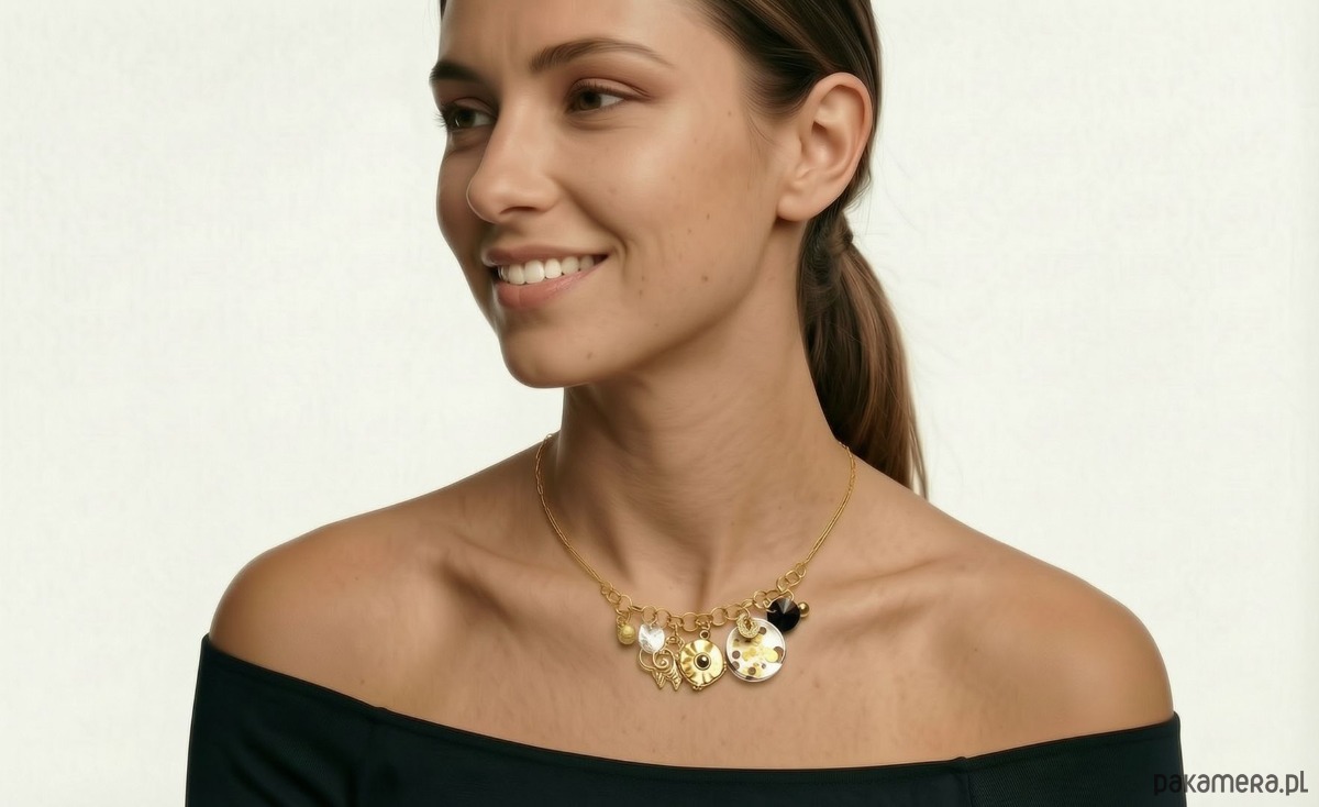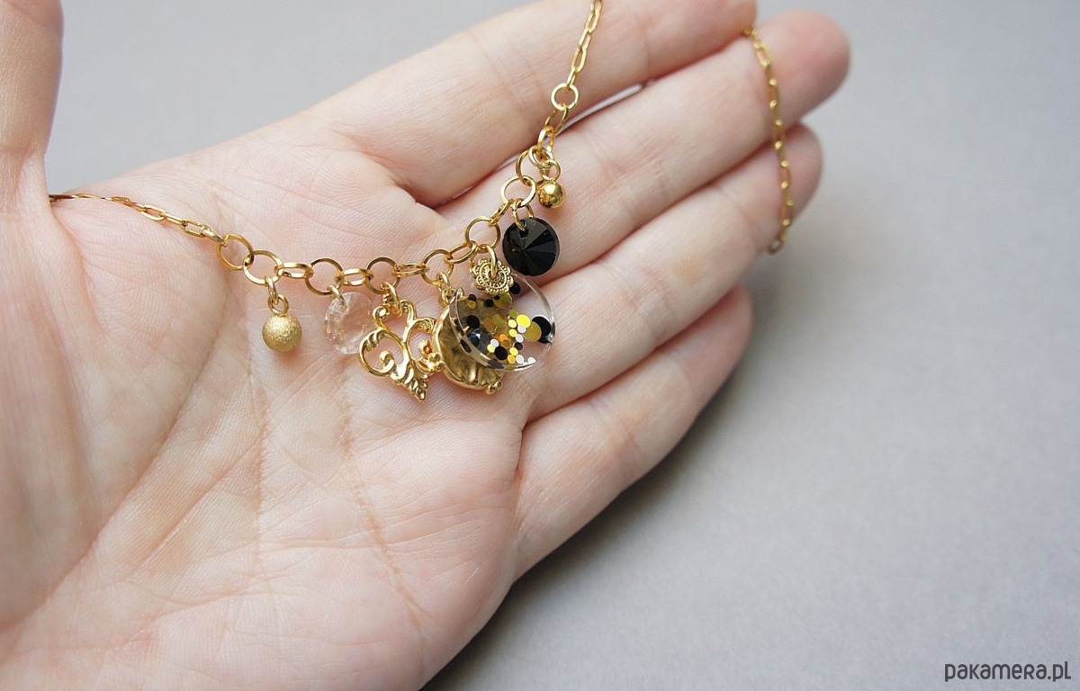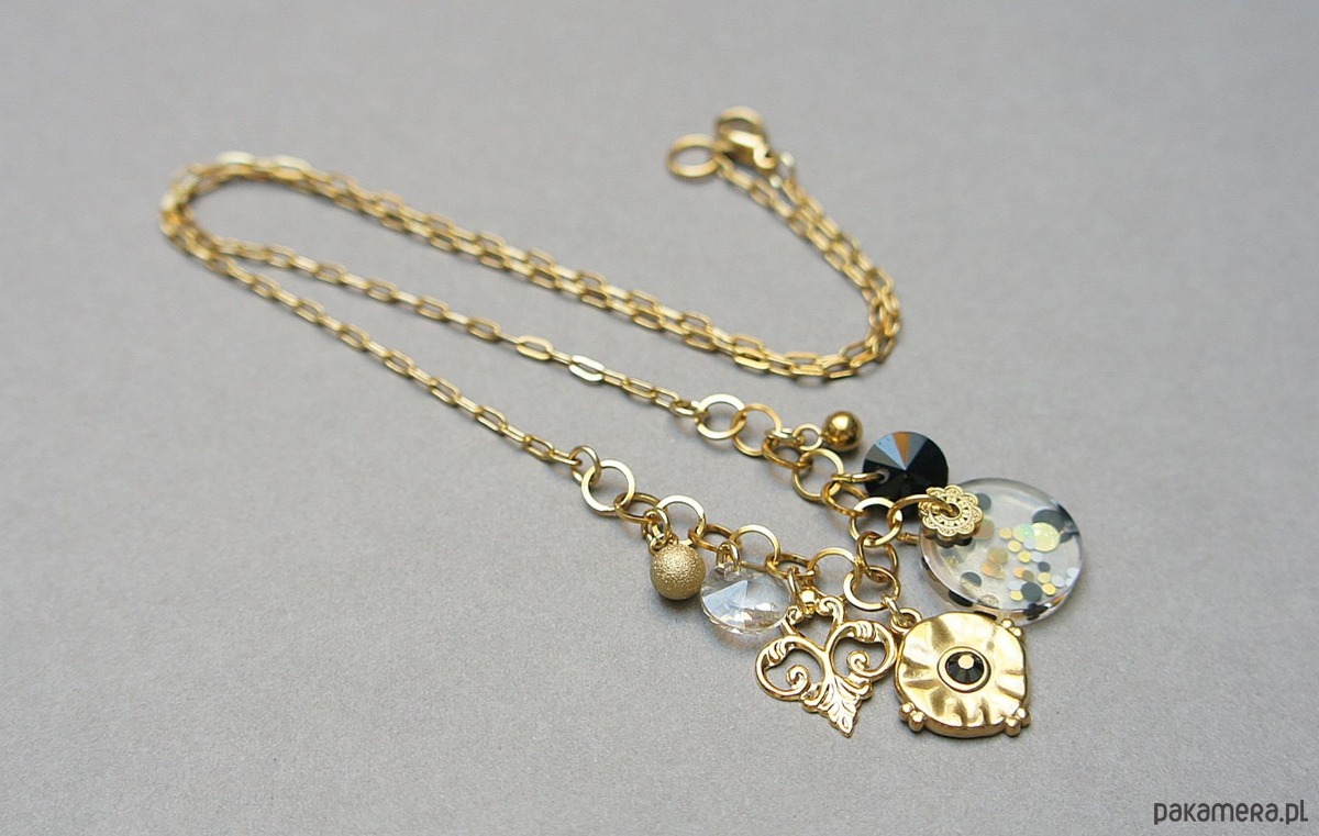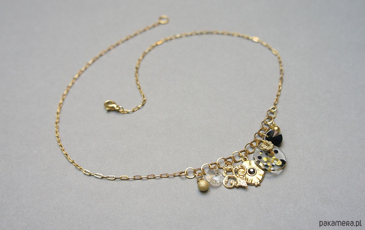 Krótki naszyjnik wykonany w całości ze stali szlachetnej pozłacanej w połączeniu z monetką żywicy [15mm], kryształkami [8mm] oraz zawieszkami (w tym zawieszka z kryształkiem Swarovski). Całkowita długość naszyjnika ok. 42,5cm. Biżuteria ozdobnie zapakowana.