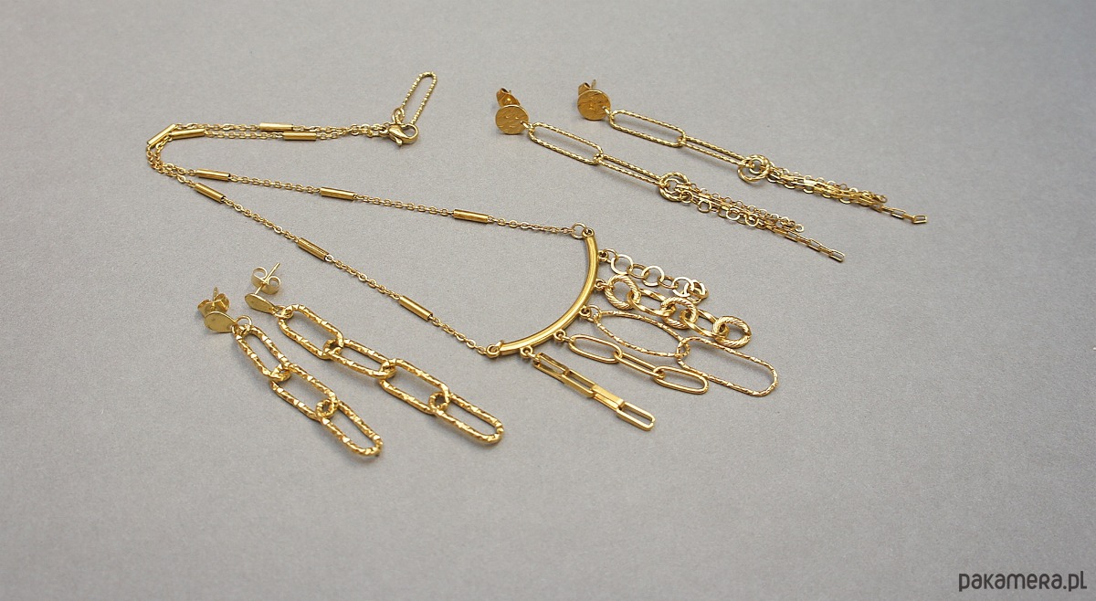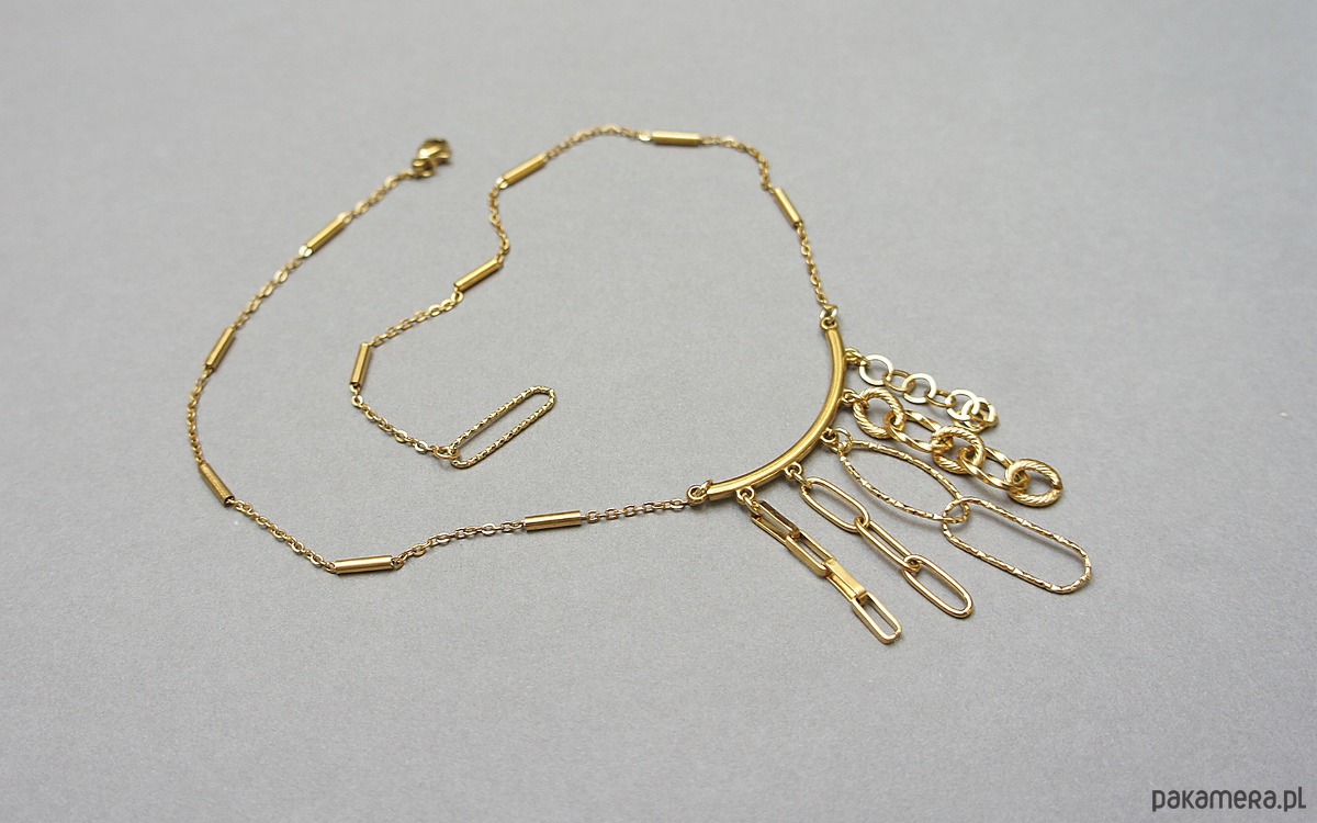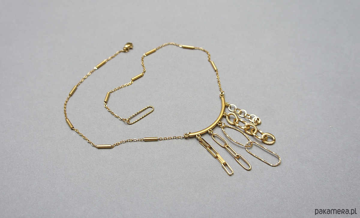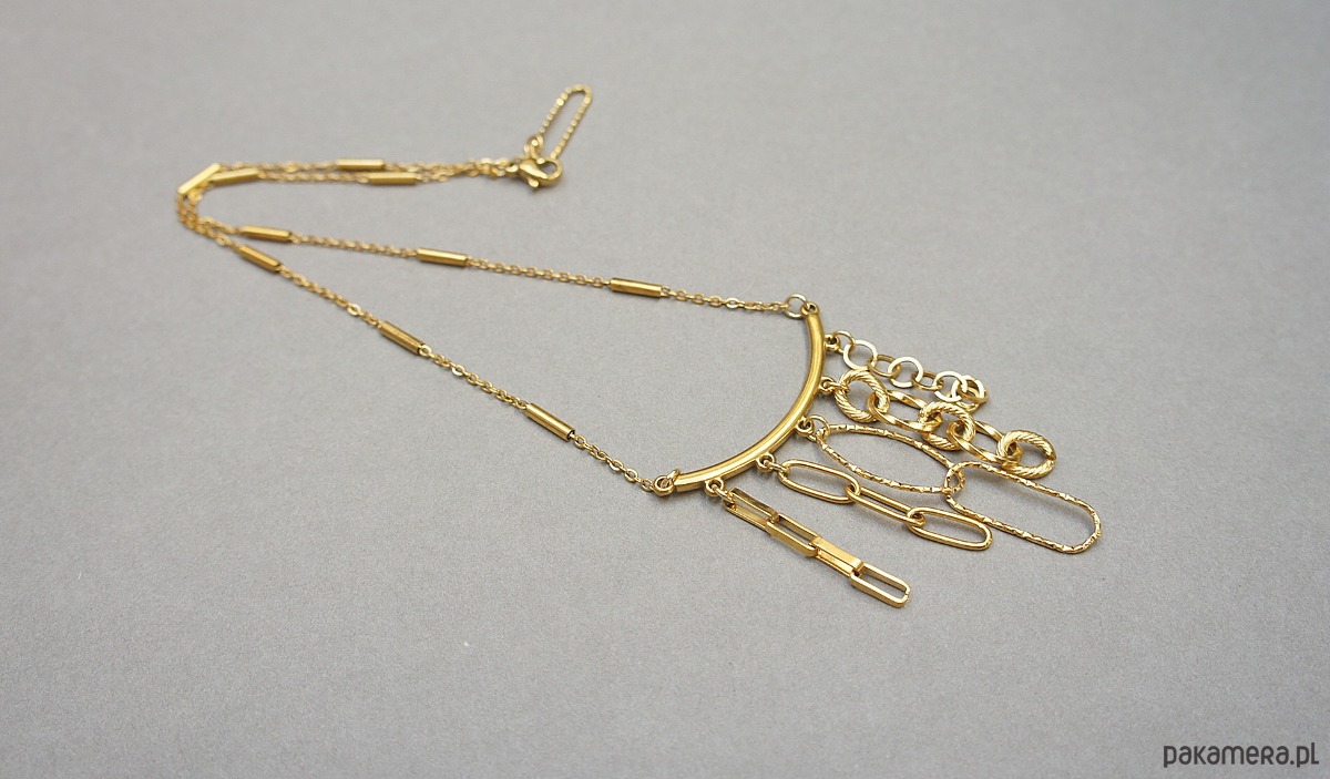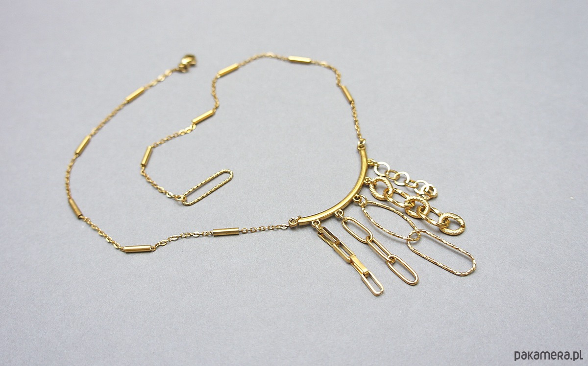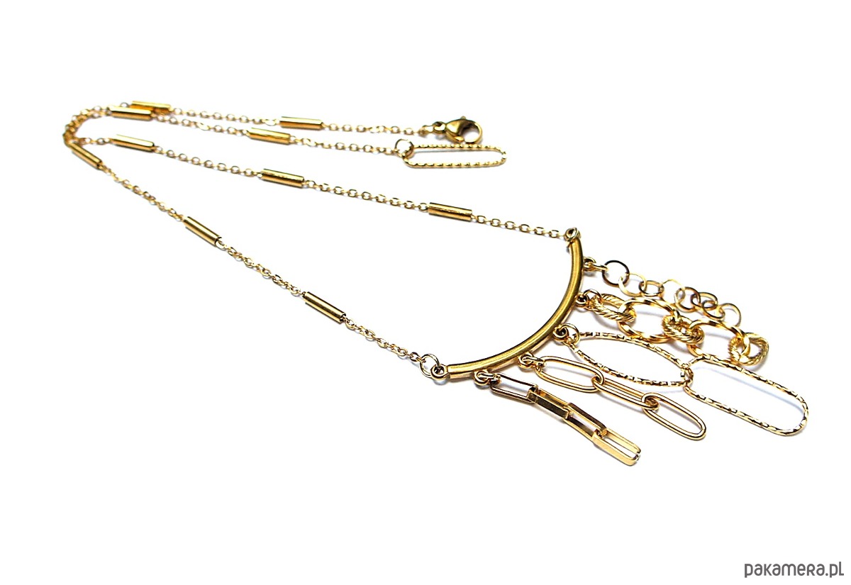 Krótki naszyjnik wykonany od podstaw w całości ze stali szlachetnej pozłacanej . Całkowita długość naszyjnika ok. 42cm, długość części wiszącej: ok. 5,5cm. Biżuteria ozdobnie zapakowana.