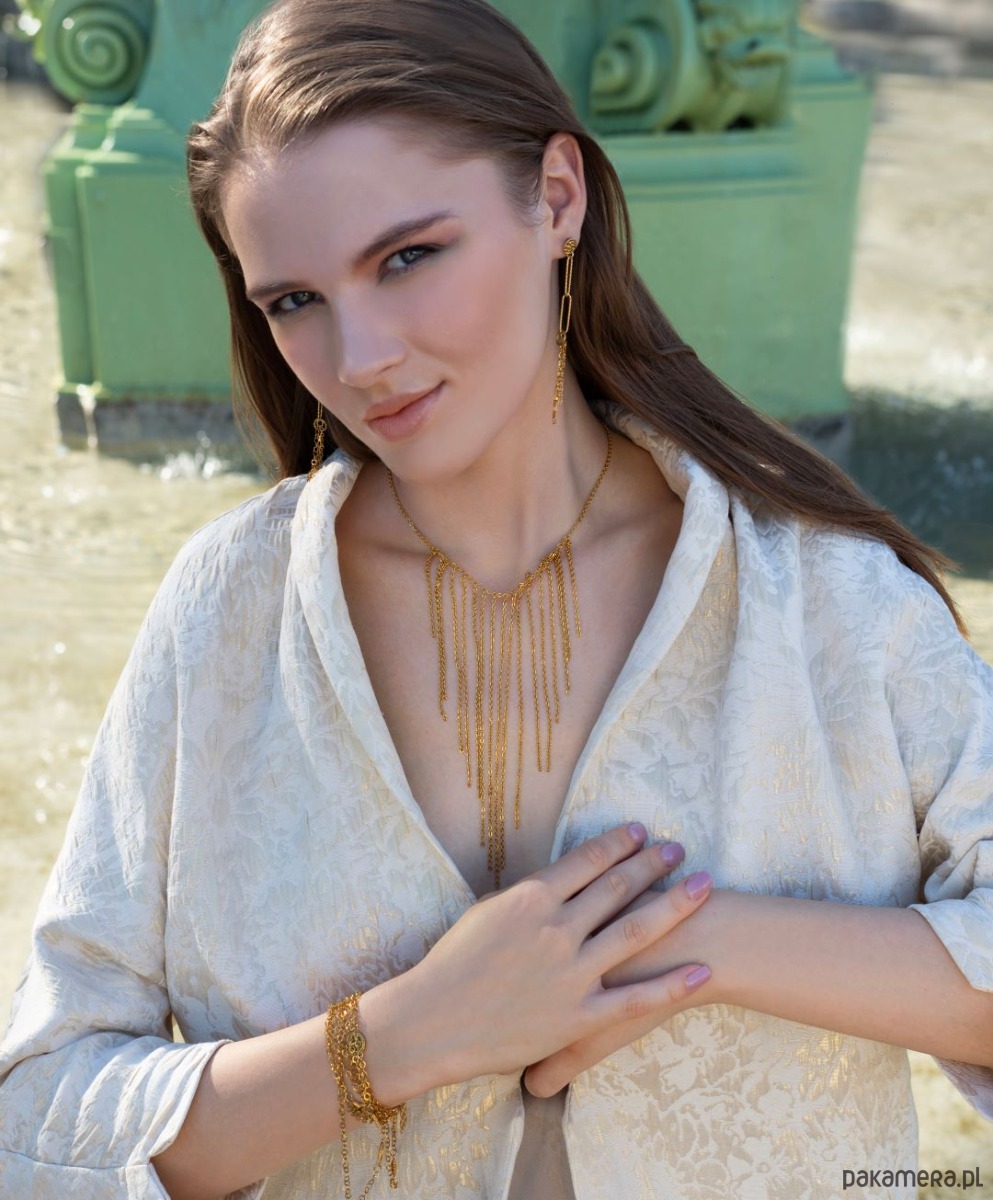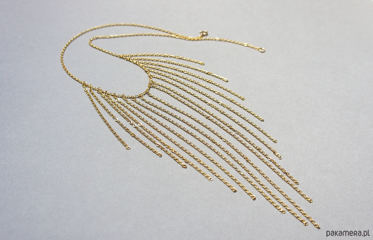 Krótki, spektakularny naszyjnik wykonany od podstaw w całości ze stali szlachetnej pozłacanej. Całkowita długość naszyjnika 44,5cm. Biżuteria ozdobnie zapakowana.