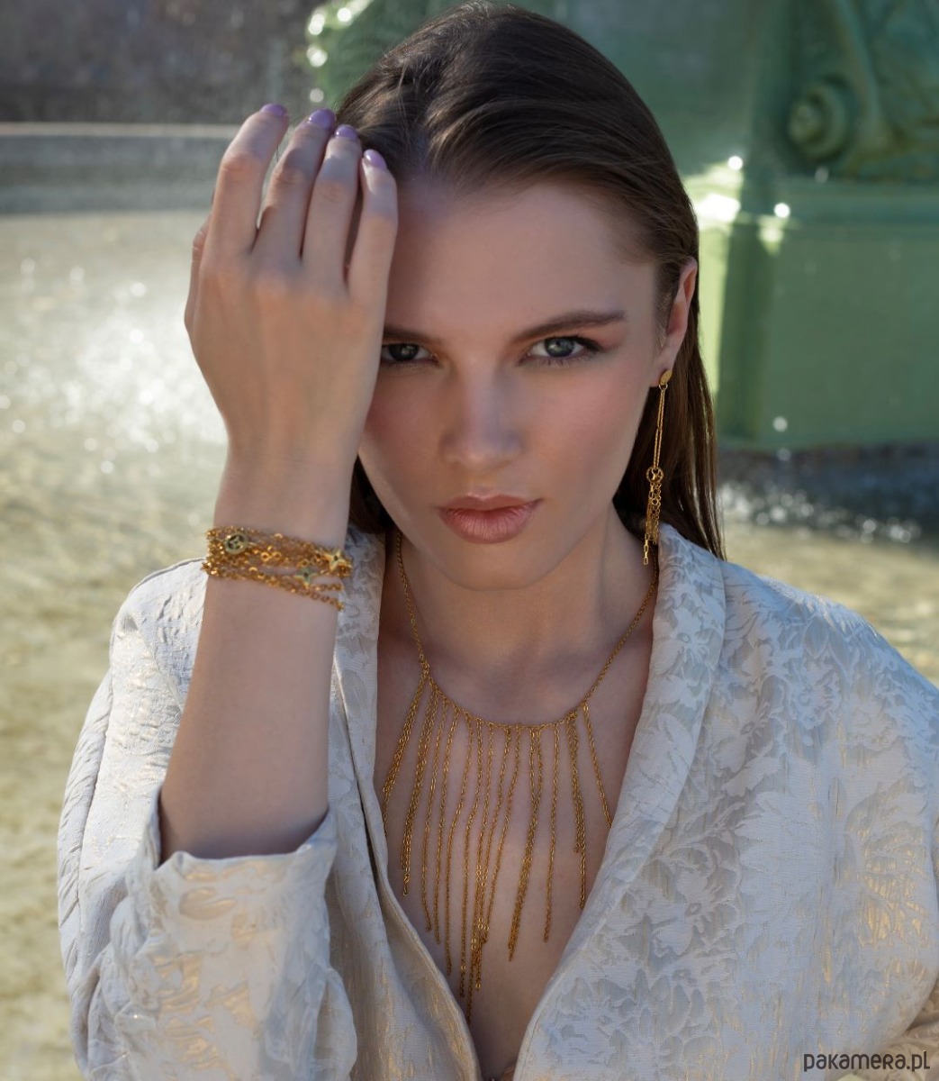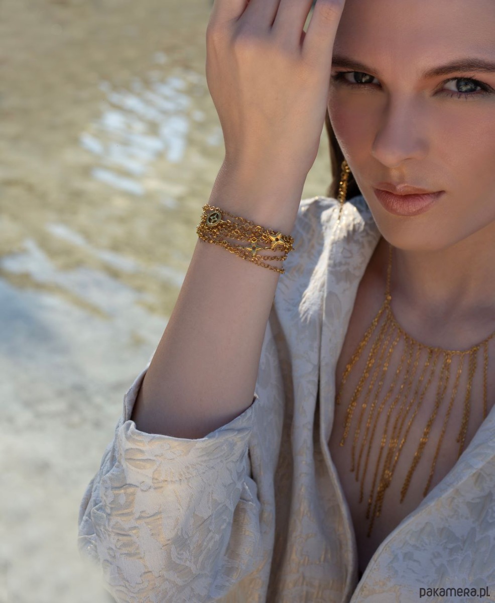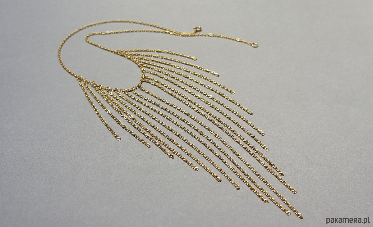 Krótki, spektakularny naszyjnik wykonany od podstaw w całości ze stali szlachetnej pozłacanej. Całkowita długość naszyjnika 44,5cm. Biżuteria ozdobnie zapakowana.