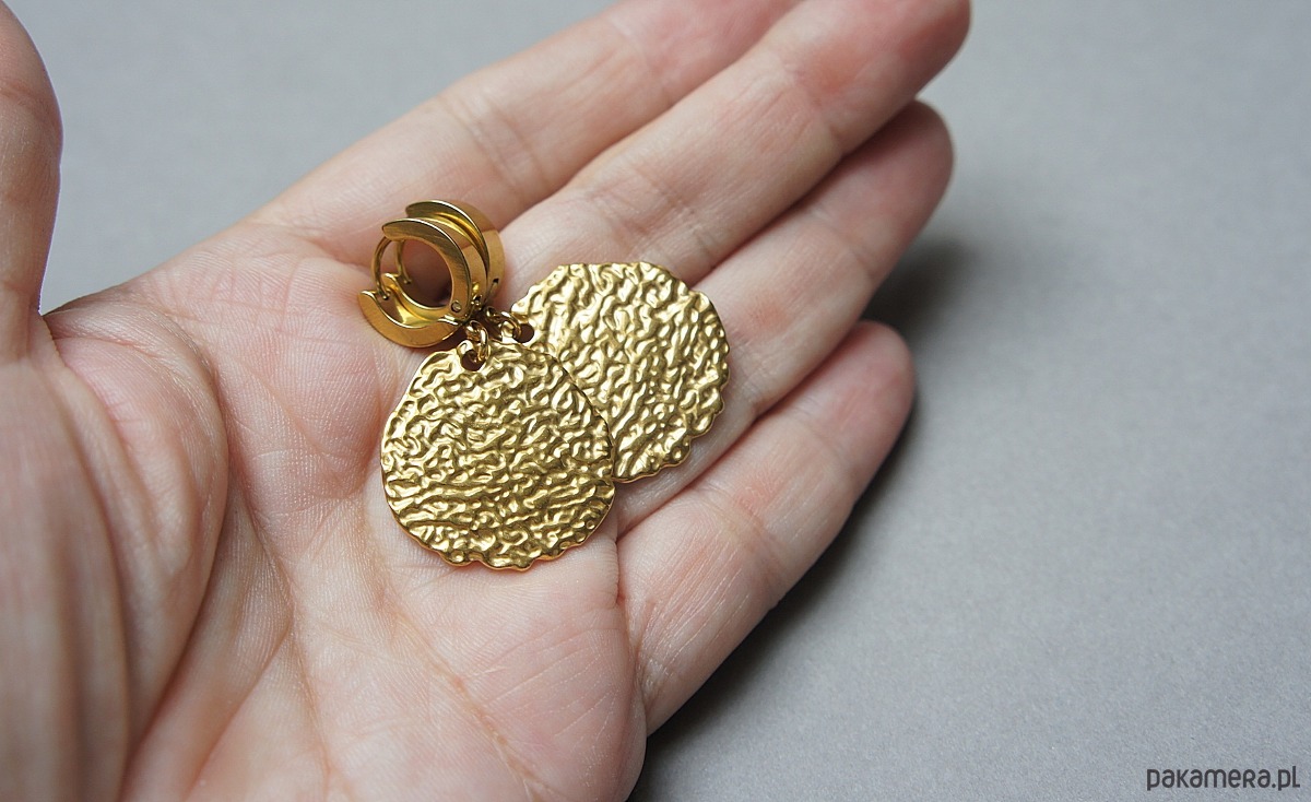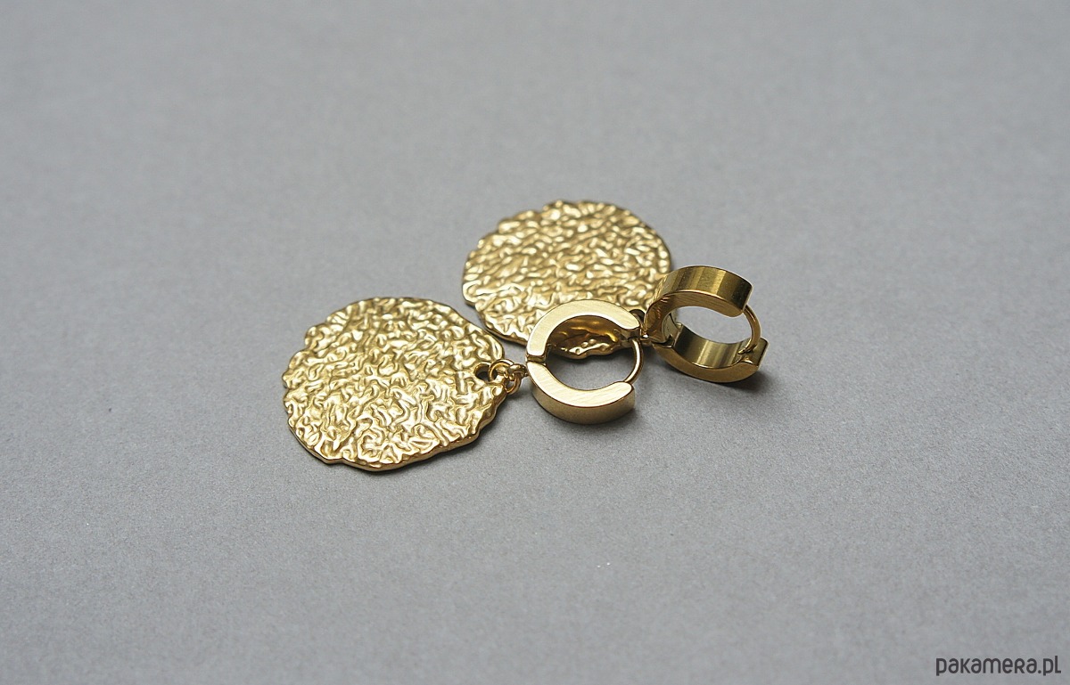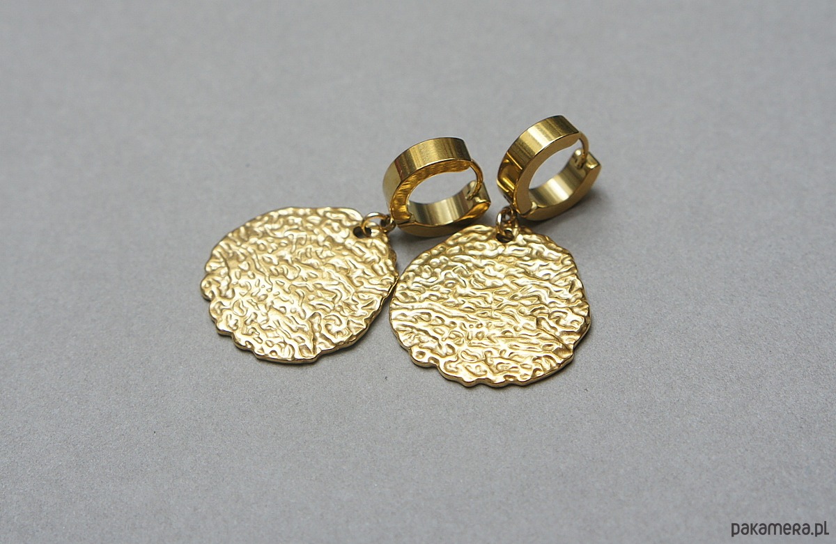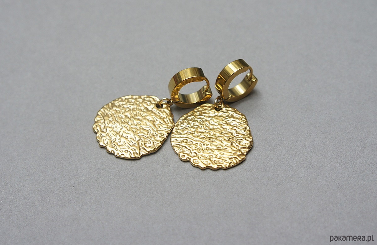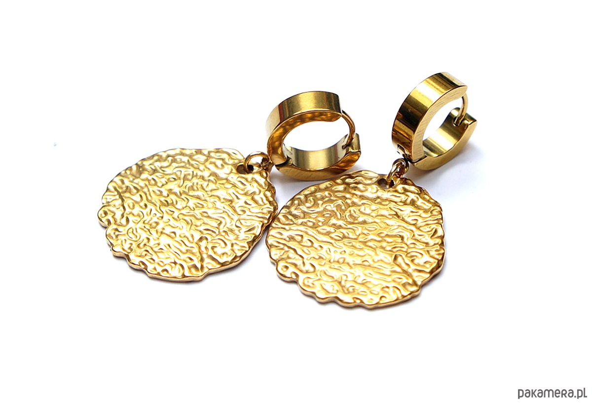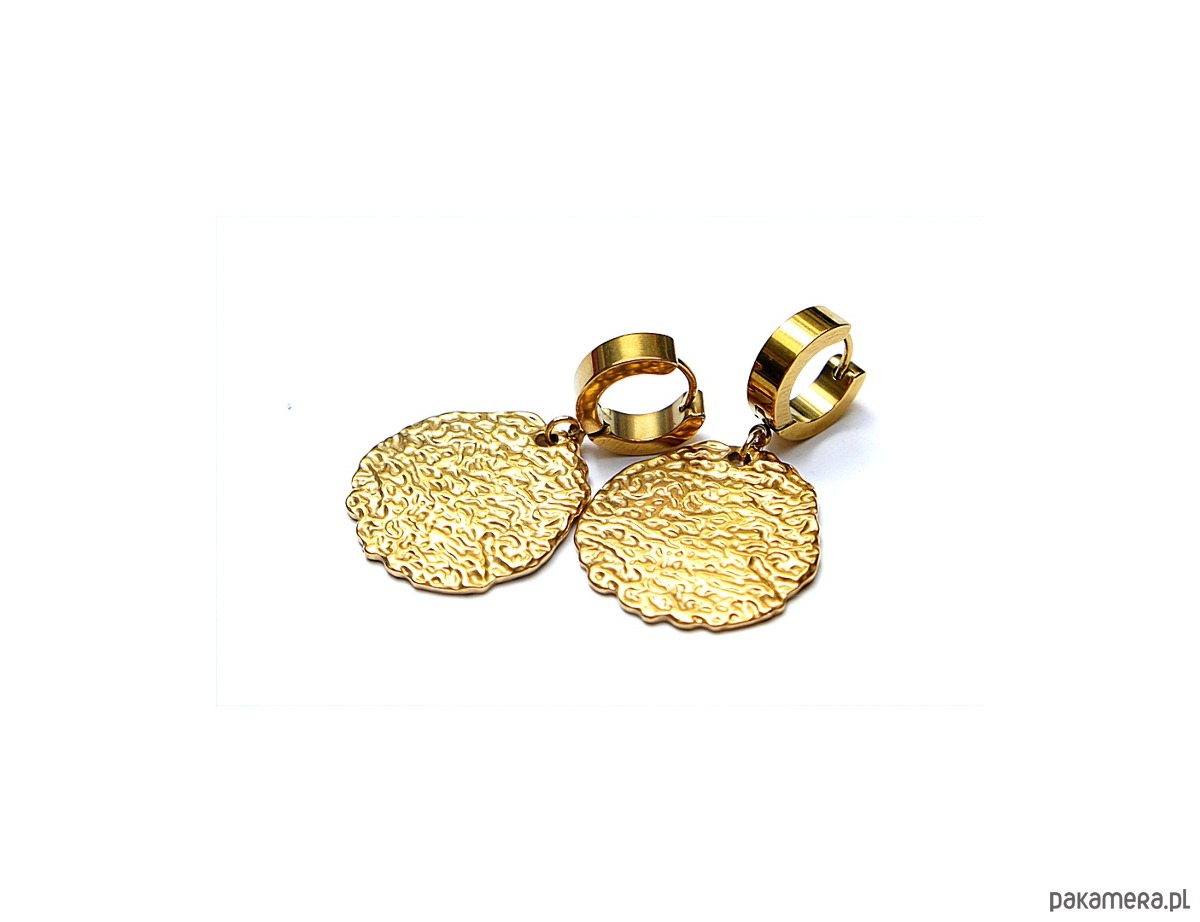 Kolczyki wykonane ze stali szlachetnej. Długość kolczyków: ok. 3,9cm; średnica emblematów ok. 2,3cm. Bigle - kajdanki. Biżuteria ozdobnie zapakowana.