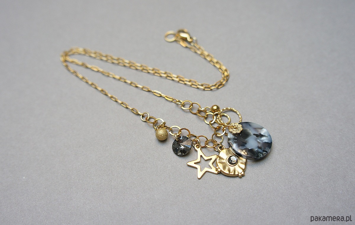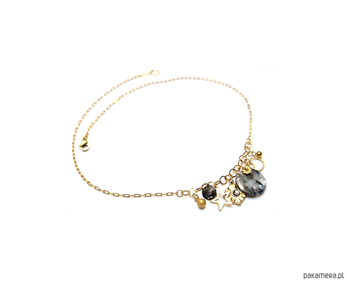 Krótki naszyjnik wykonany w całości ze stali szlachetnej pozłacanej w połączeniu z monetką żywicy [15mm], kryształkiem Swarovski rivolii [8mm]. Całkowita długość naszyjnika ok. 42,5cm. Biżuteria ozdobnie zapakowana.