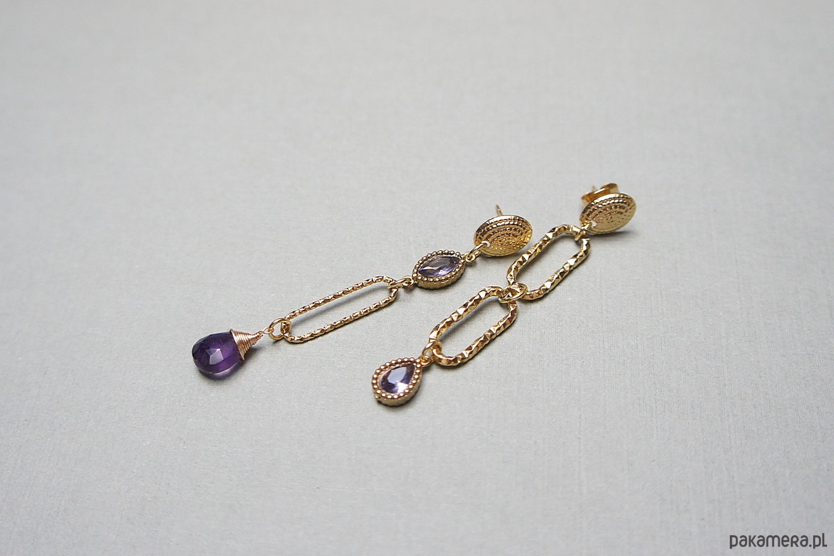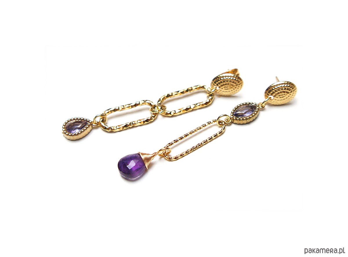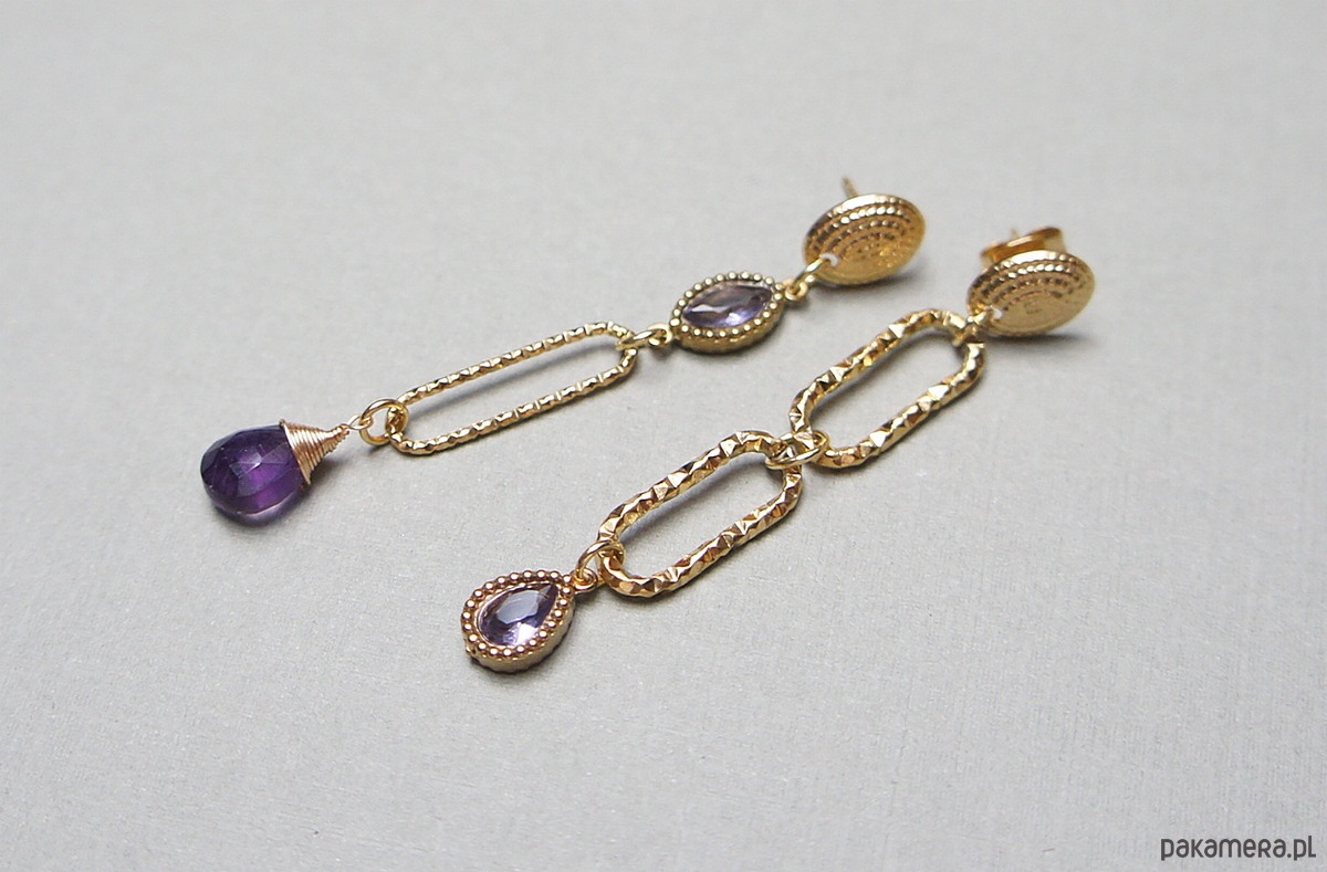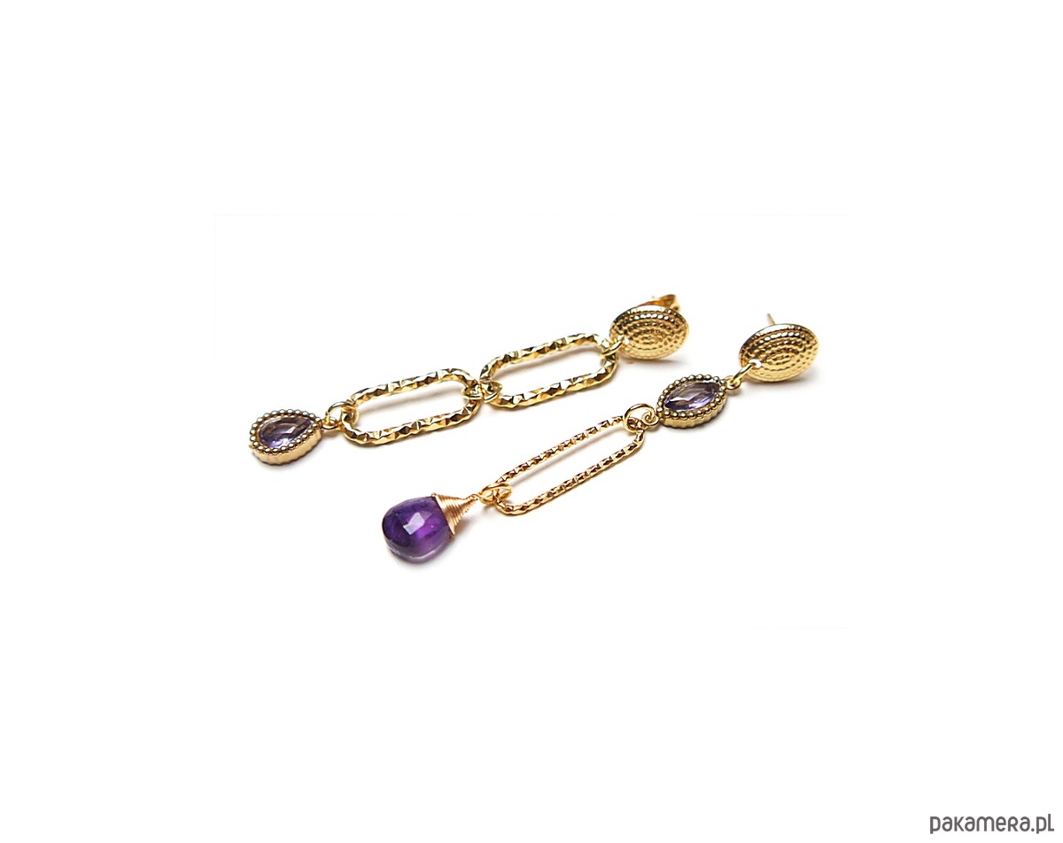 Asymetryczne kolczyki wykonane z pozłacanej stali szlachetnej, brioletki naturalnego ametystu oraz łącznika i zawieszki z cyrkoniami w okuciu. Długość kolczyków: ok. 5,4,1 i 5,8cm.