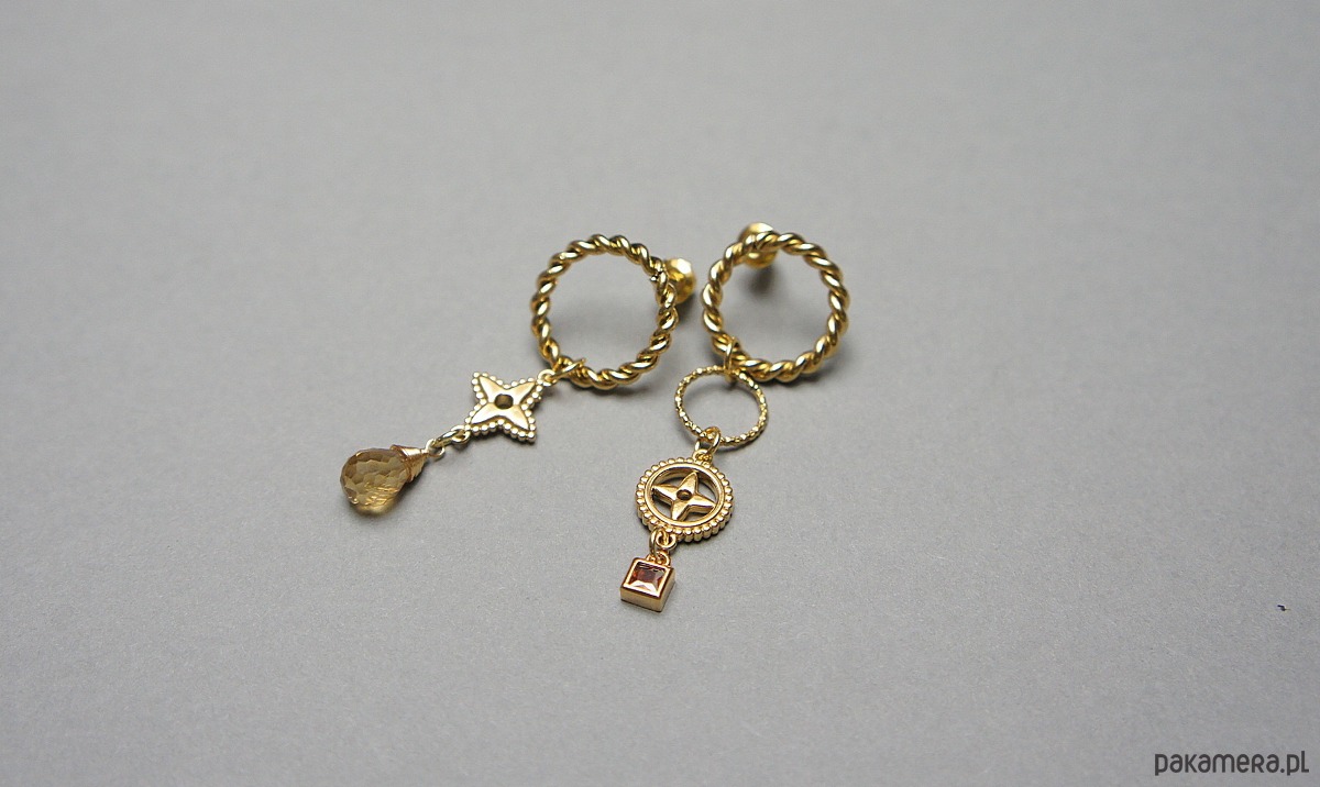 Asymetryczne kolczyki wykonane z pozłacanej stali szlachetnej oraz brioletki naturalnego cytrynu. Cyrkonia oprawiona w kasetkę. Długość kolczyków: ok. 4,5 i 4,8cm. Biżuteria ozdobnie zapakowana.