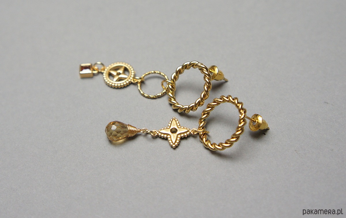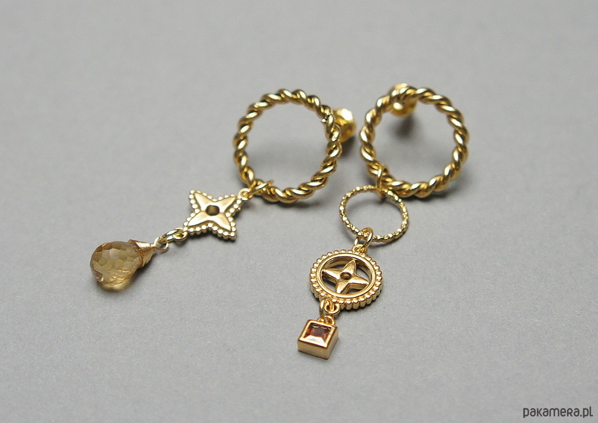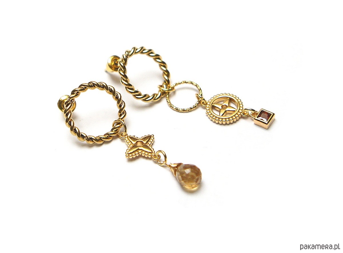 Asymetryczne kolczyki wykonane z pozłacanej stali szlachetnej oraz brioletki naturalnego cytrynu. Cyrkonia oprawiona w kasetkę. Długość kolczyków: ok. 4,5 i 4,8cm. Biżuteria ozdobnie zapakowana.