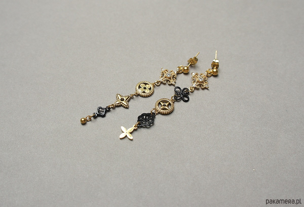 Asymetryczne kolczyki wykonane z pozłacanej stali szlachetnej, stali szlachetnej w kolorze czarnym oraz mosiądzu platerowanego, sztyfty ze stali szlachetnej. Długość kolczyków: ok. 7,5 i 7cm. Biżuteria ozdobnie zapakowana. Do kompletu można dokupić naszyjnik.