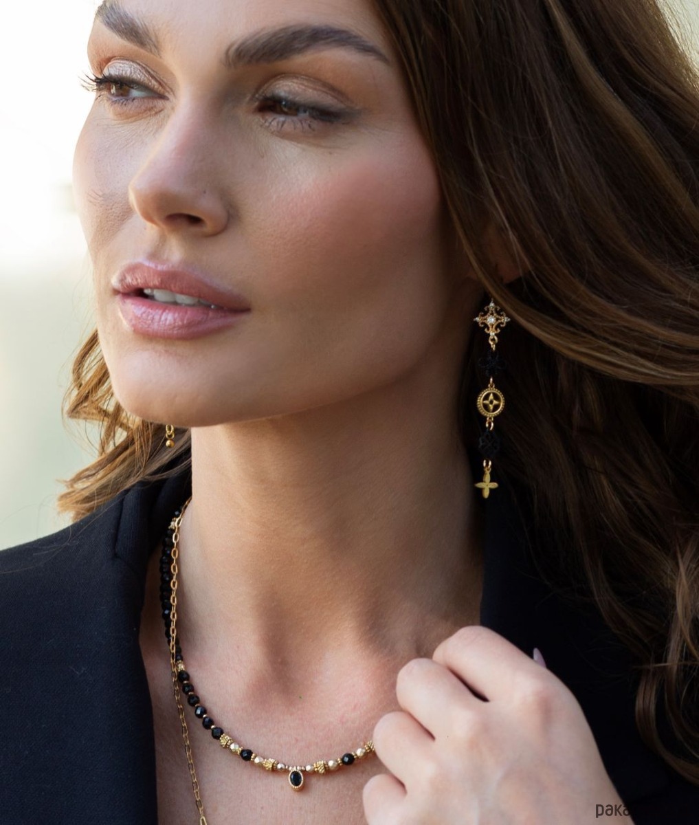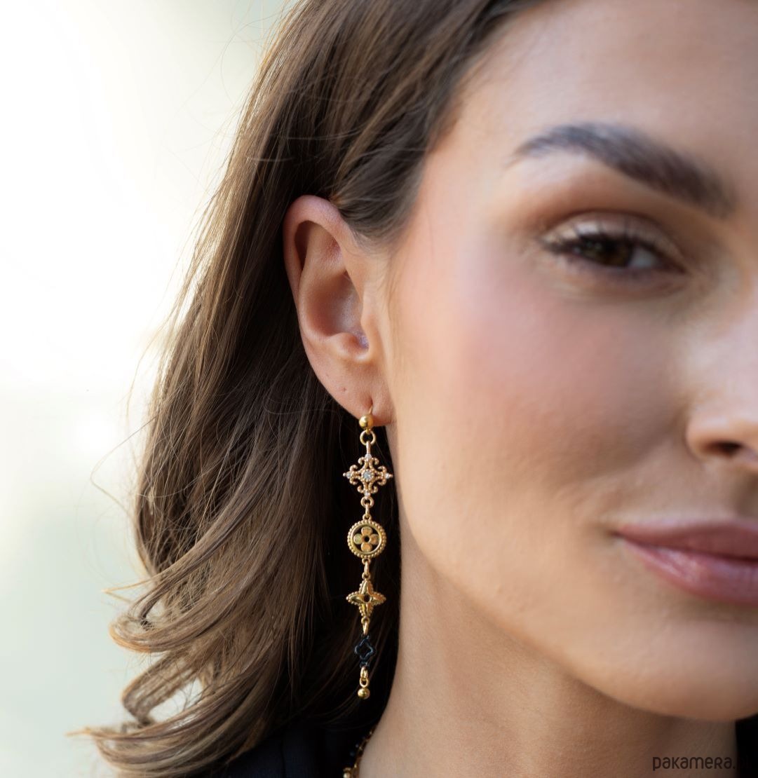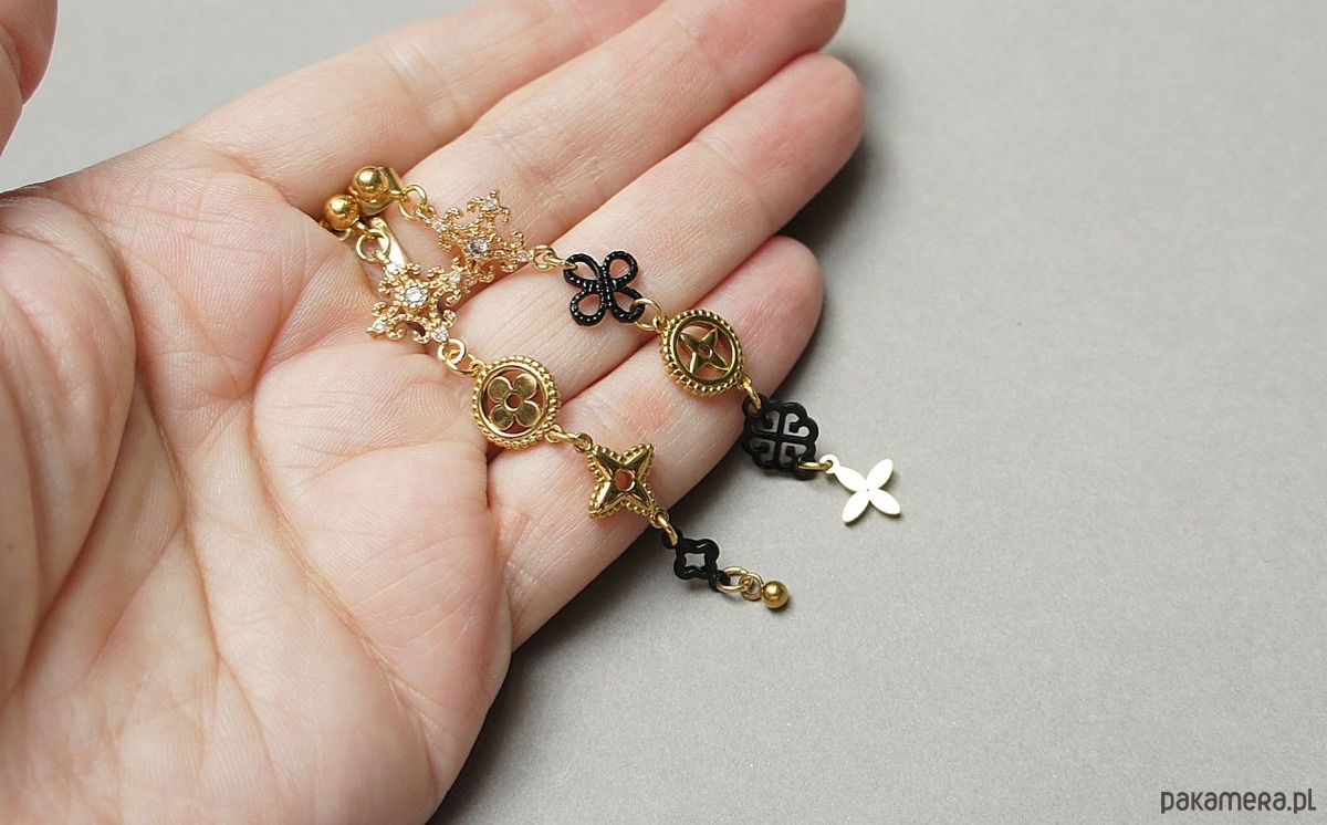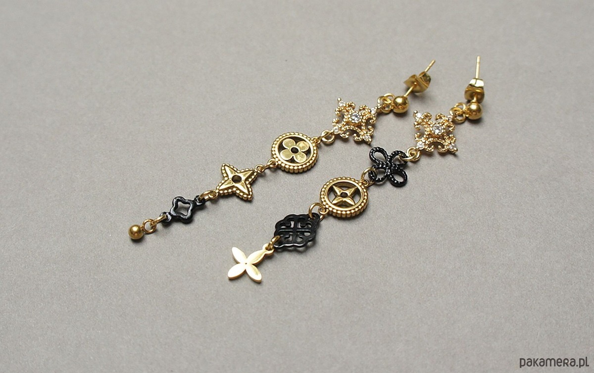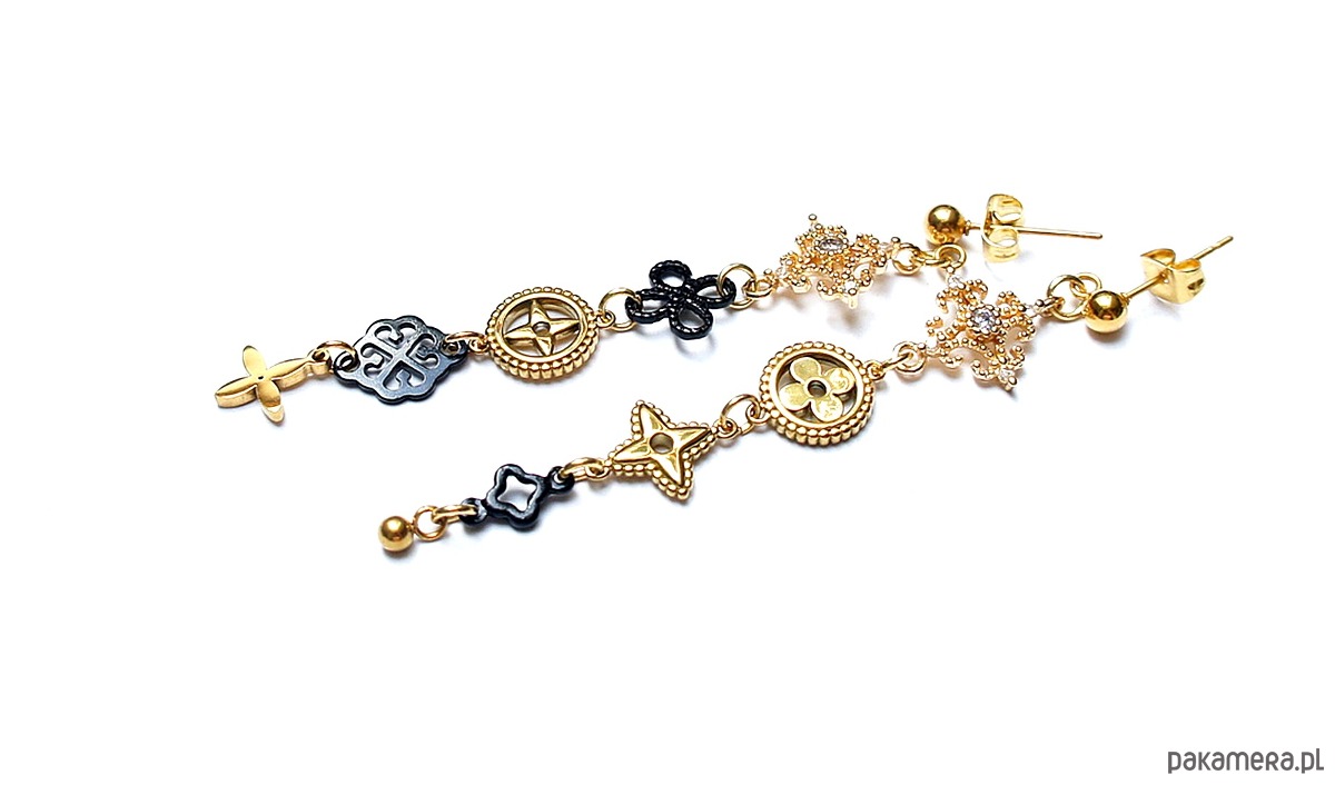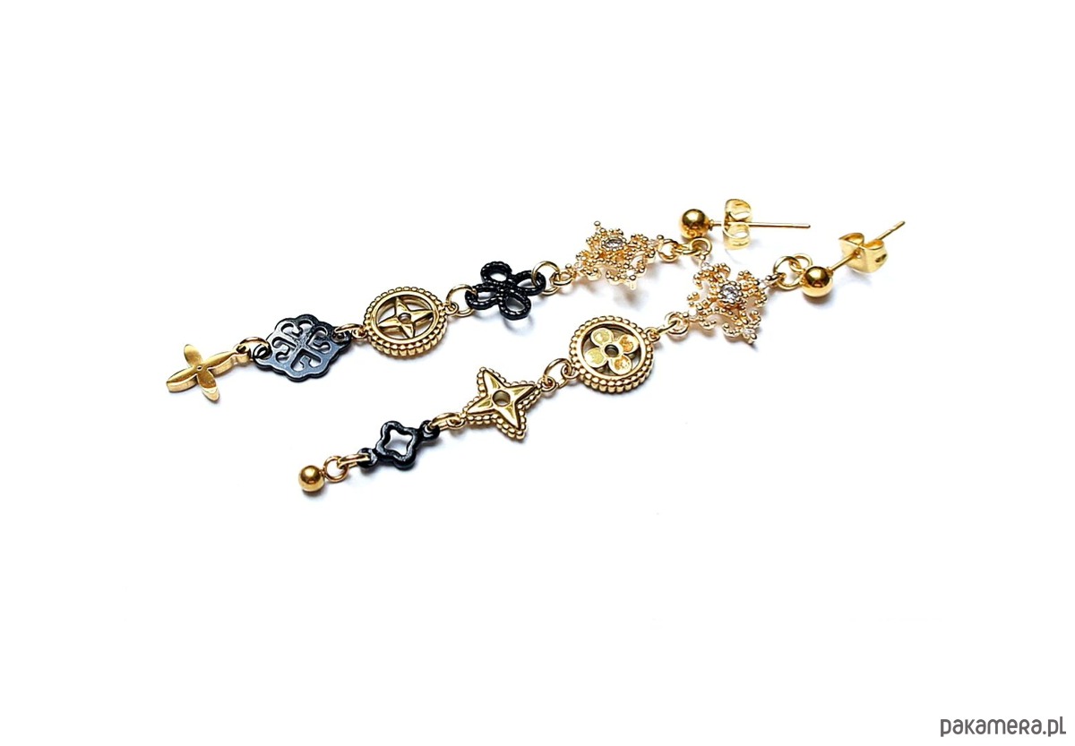 Asymetryczne kolczyki wykonane z pozłacanej stali szlachetnej, stali szlachetnej w kolorze czarnym oraz mosiądzu platerowanego, sztyfty ze stali szlachetnej. Długość kolczyków: ok. 7,5 i 7cm. Biżuteria ozdobnie zapakowana. Do kompletu można dokupić naszyjnik.