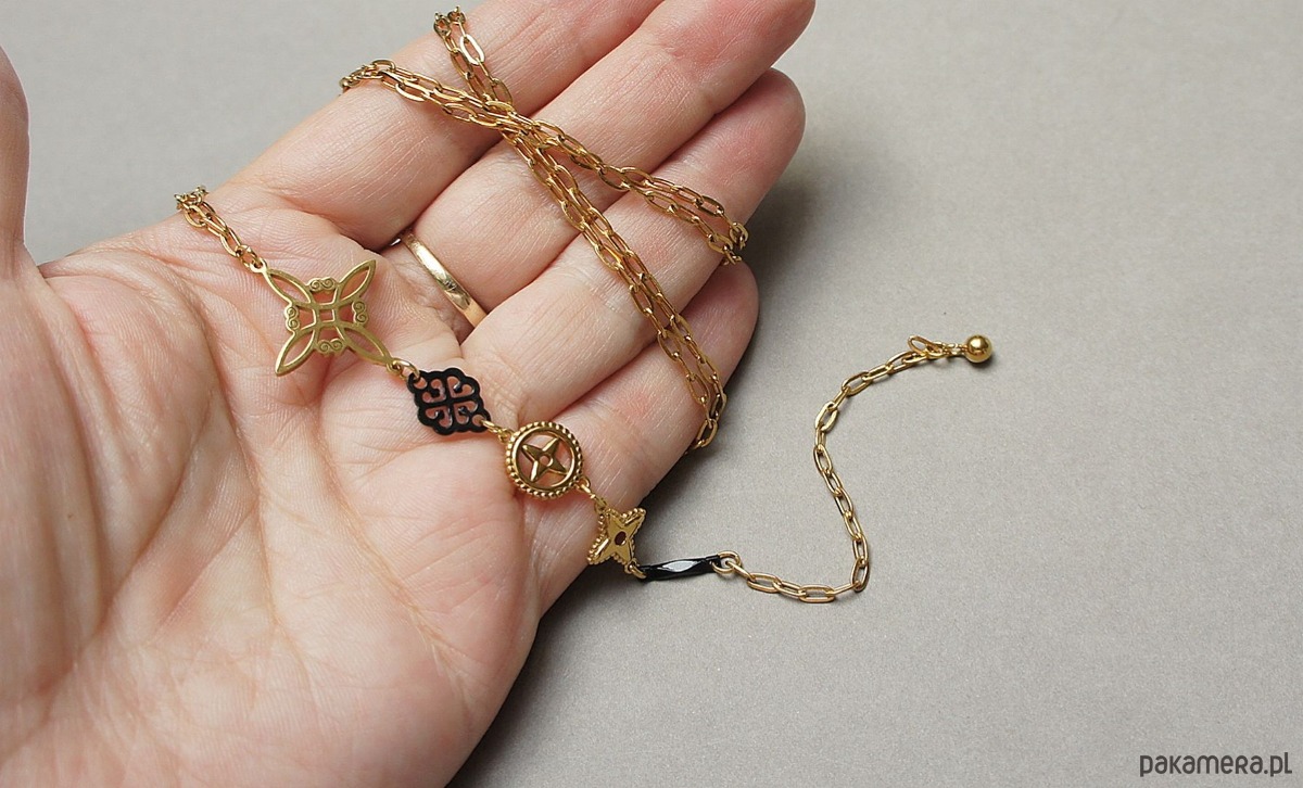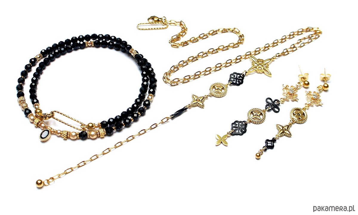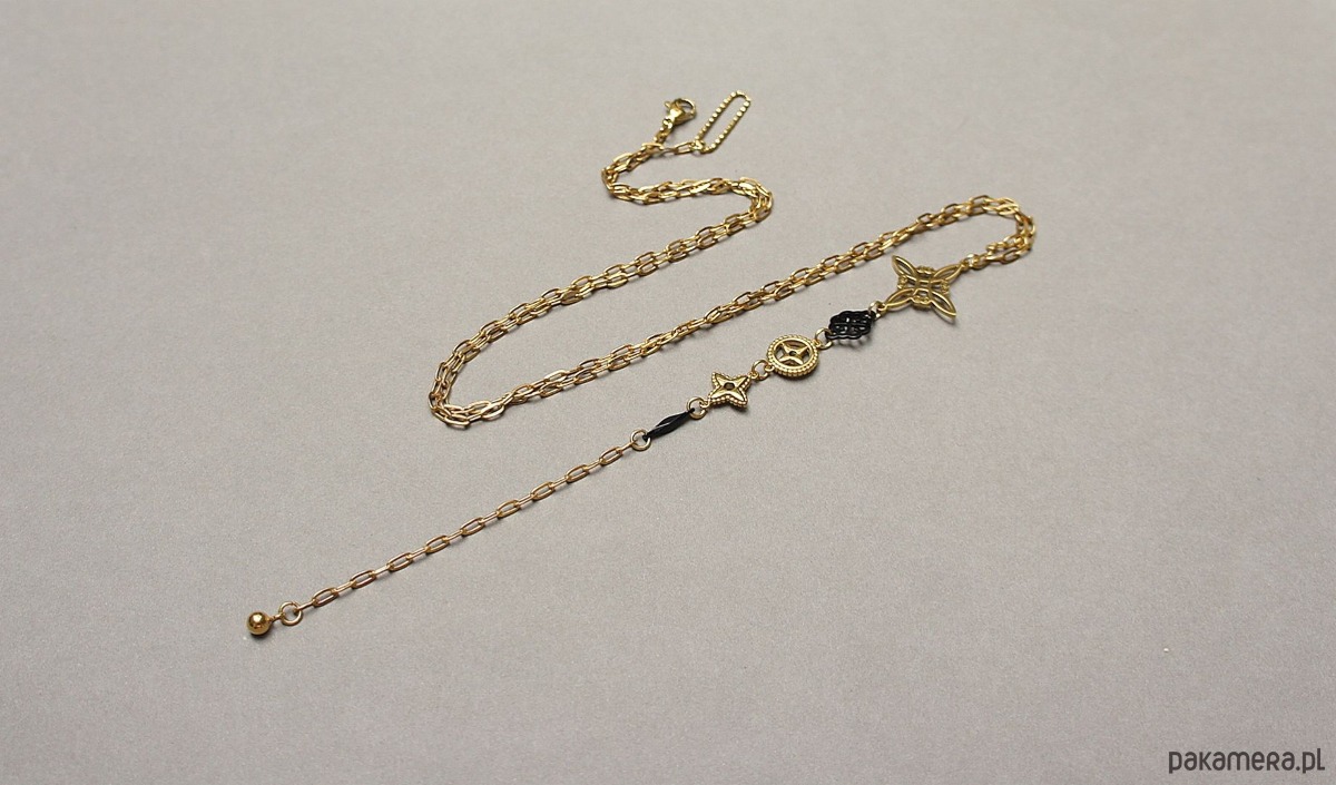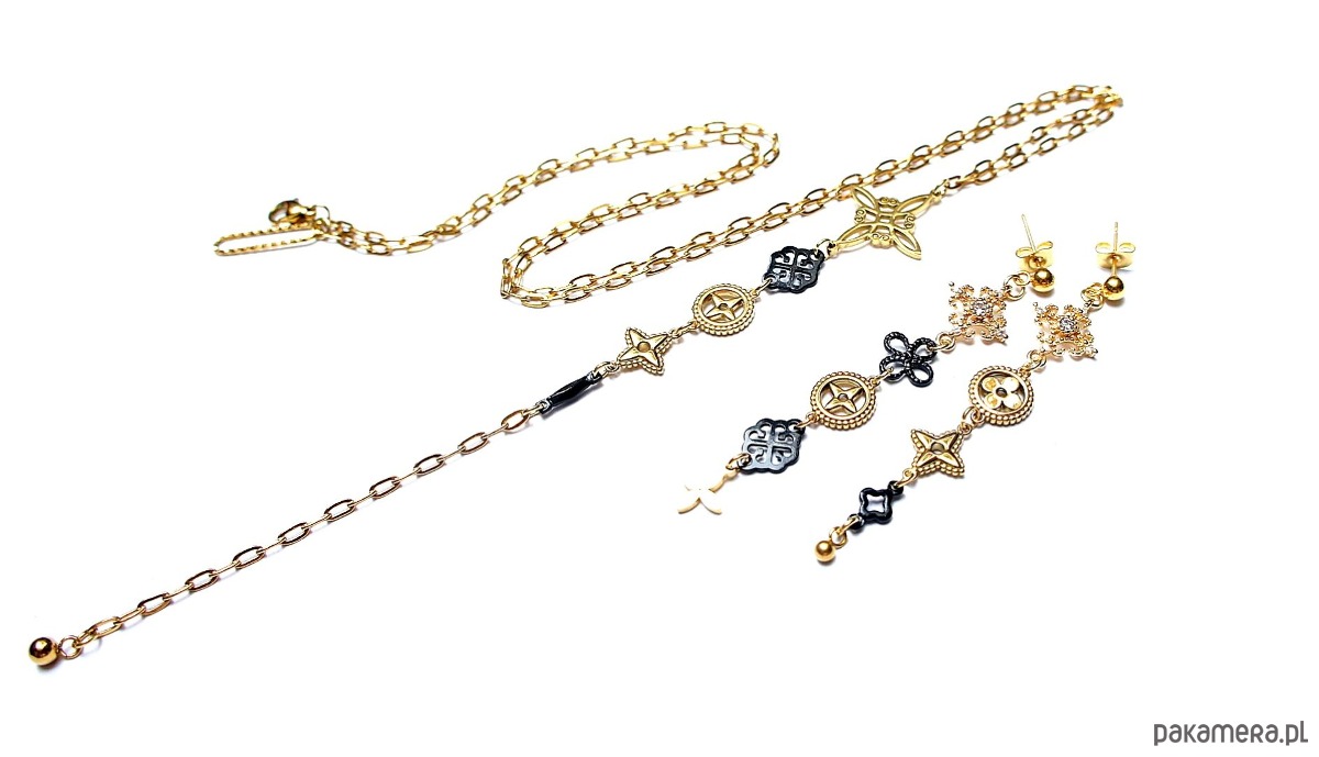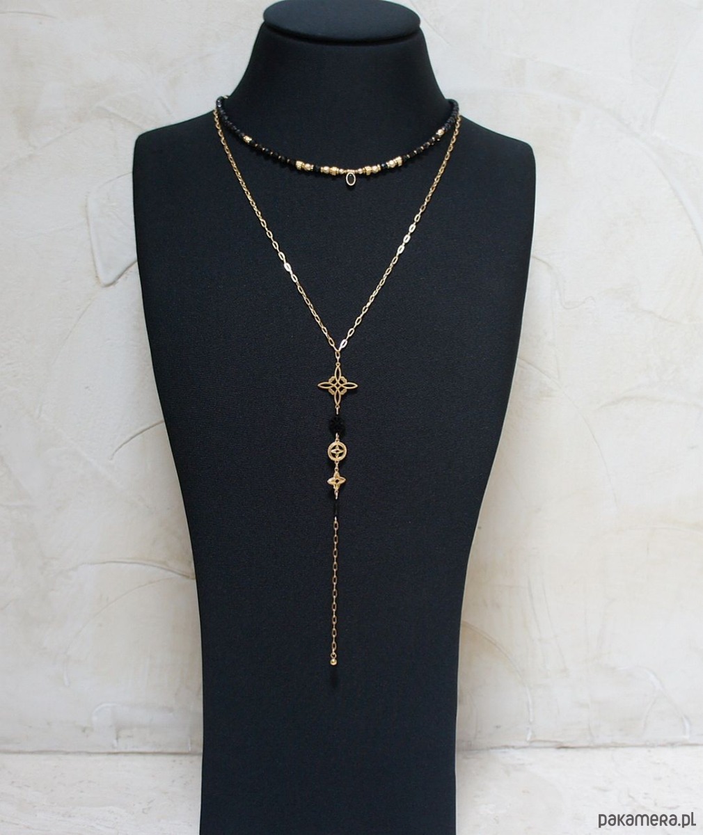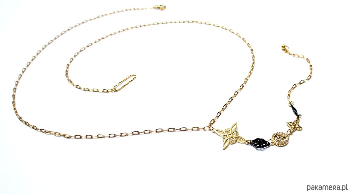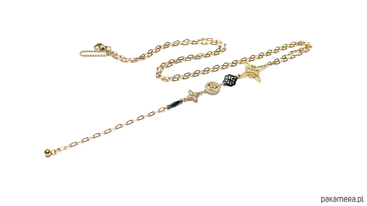 Naszyjnik wykonany z pozłacanej stali szlachetnej oraz stali szlachetnej w kolorze czarnym. Obwód łańcuszka: 66cm. , długość części wiszącej: 16m. Biżuteria ozdobnie zapakowana. Do kompletu można dokupić kolczyki widoczne na zdjęciach.