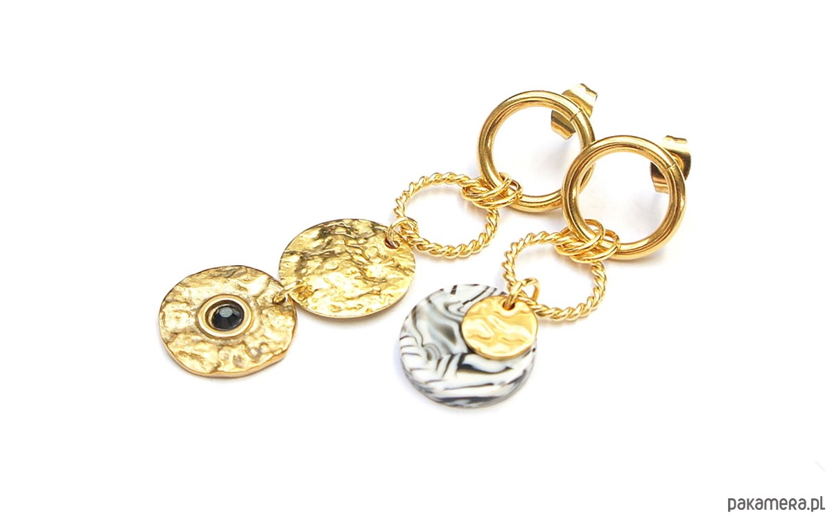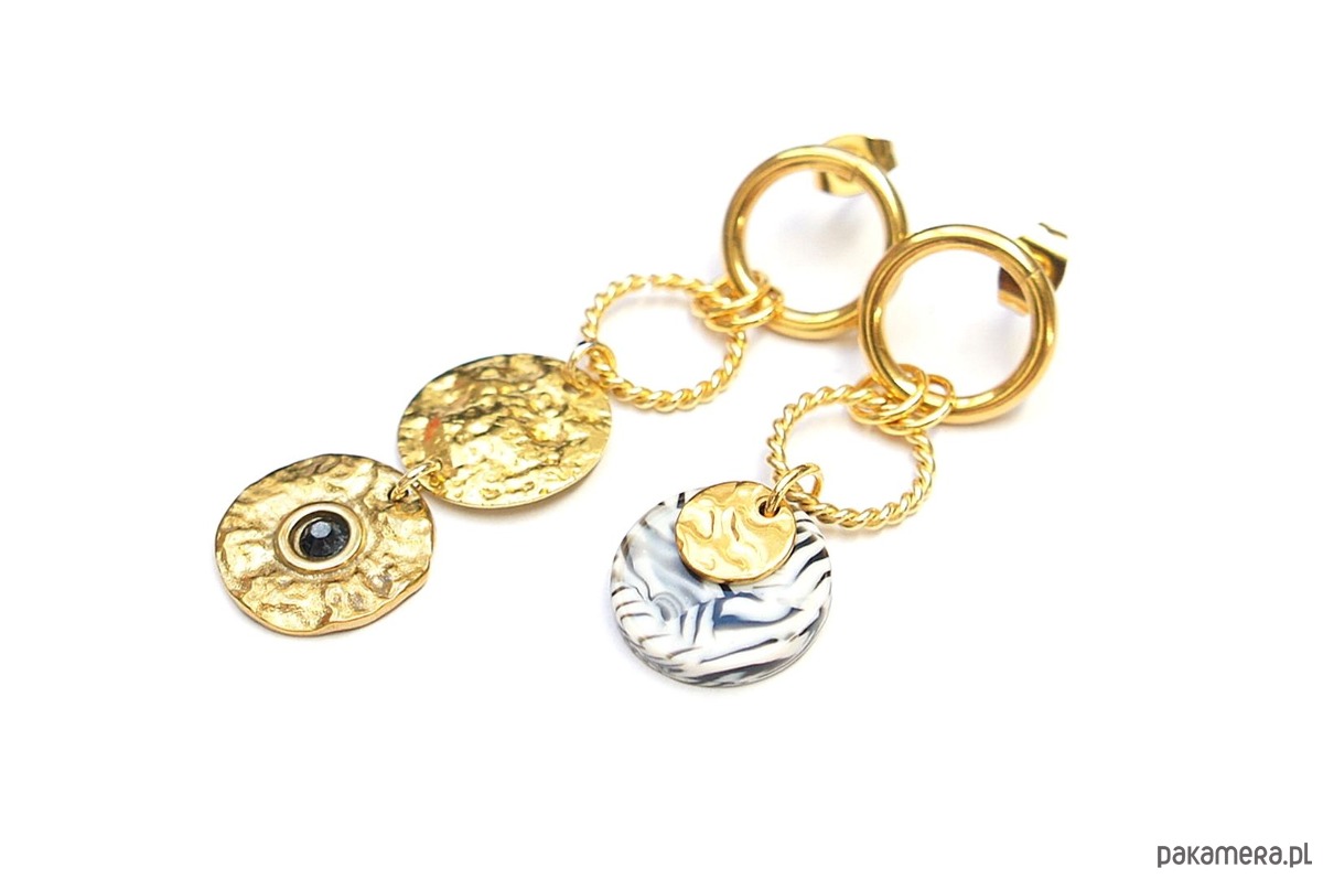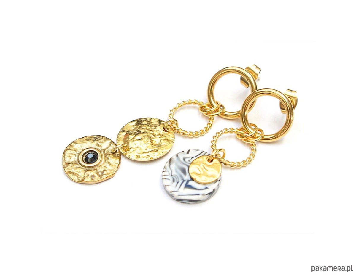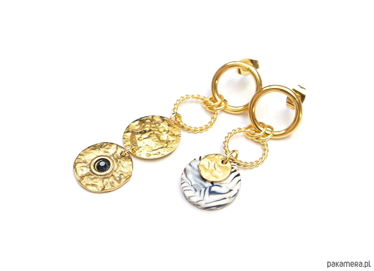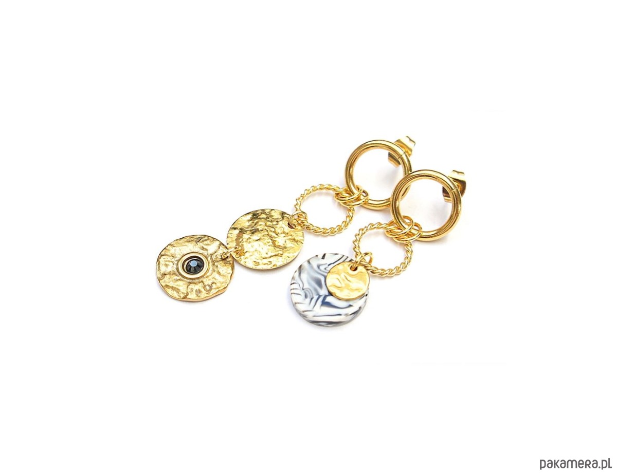 Asymetryczne kolczyki wykonane ze stali szlachetnej pozłacanej, blaszki z mosiądzu, zawieszki z kryształkiem Swarovski oraz monetki z żywicy [15mm]. Długość kolczyków: ok. 5,5cm oraz 4,2cm.