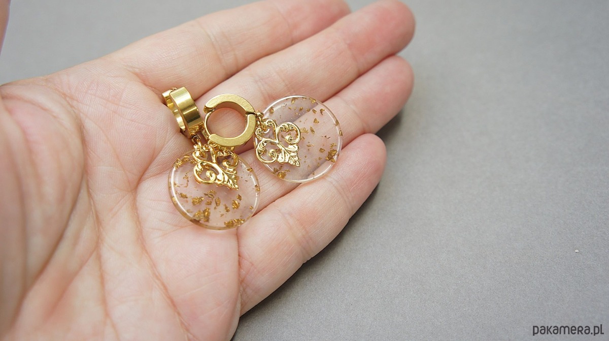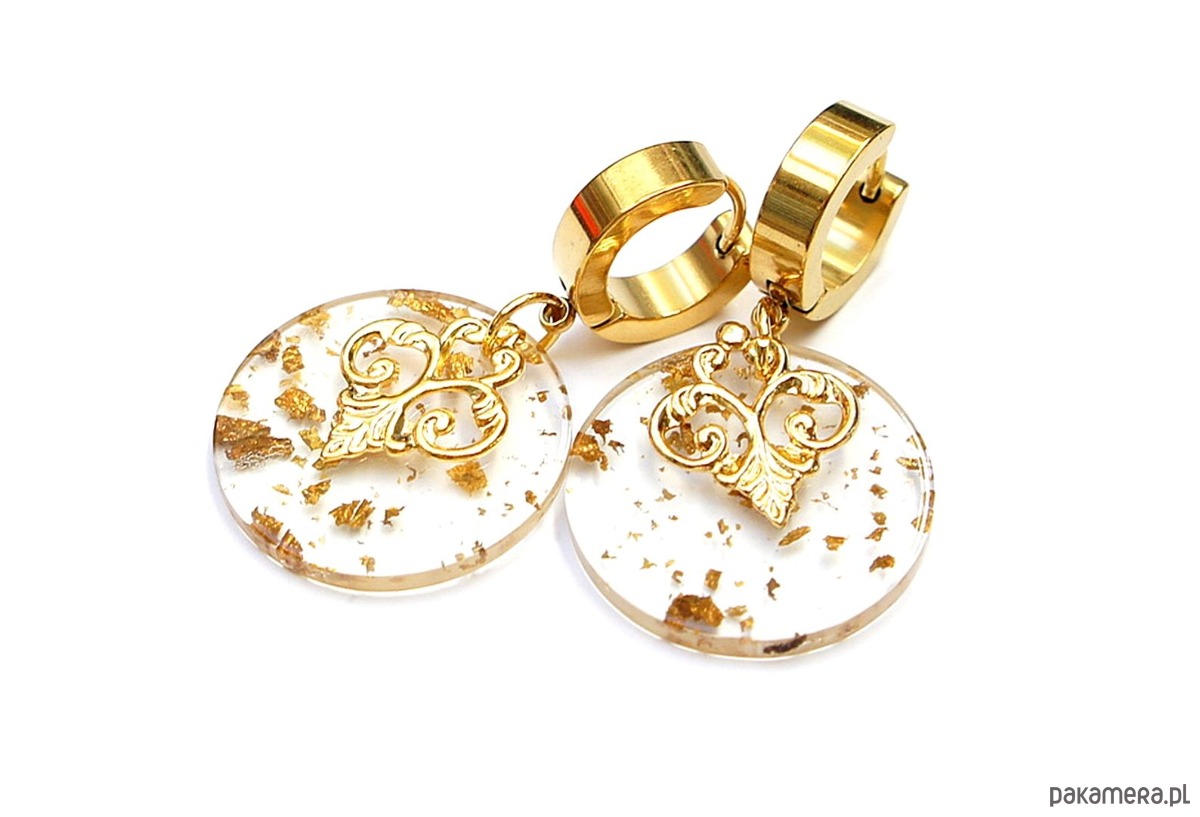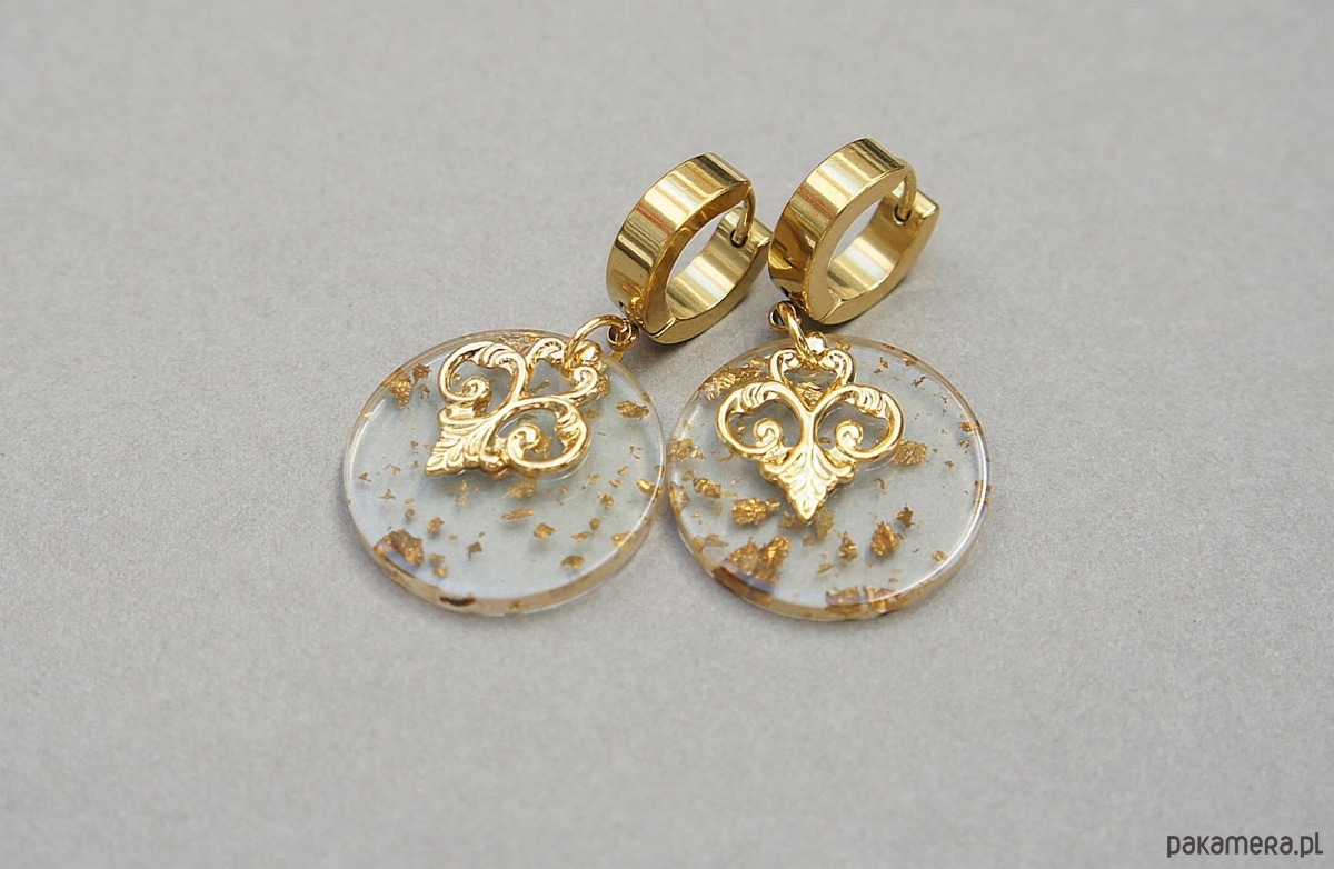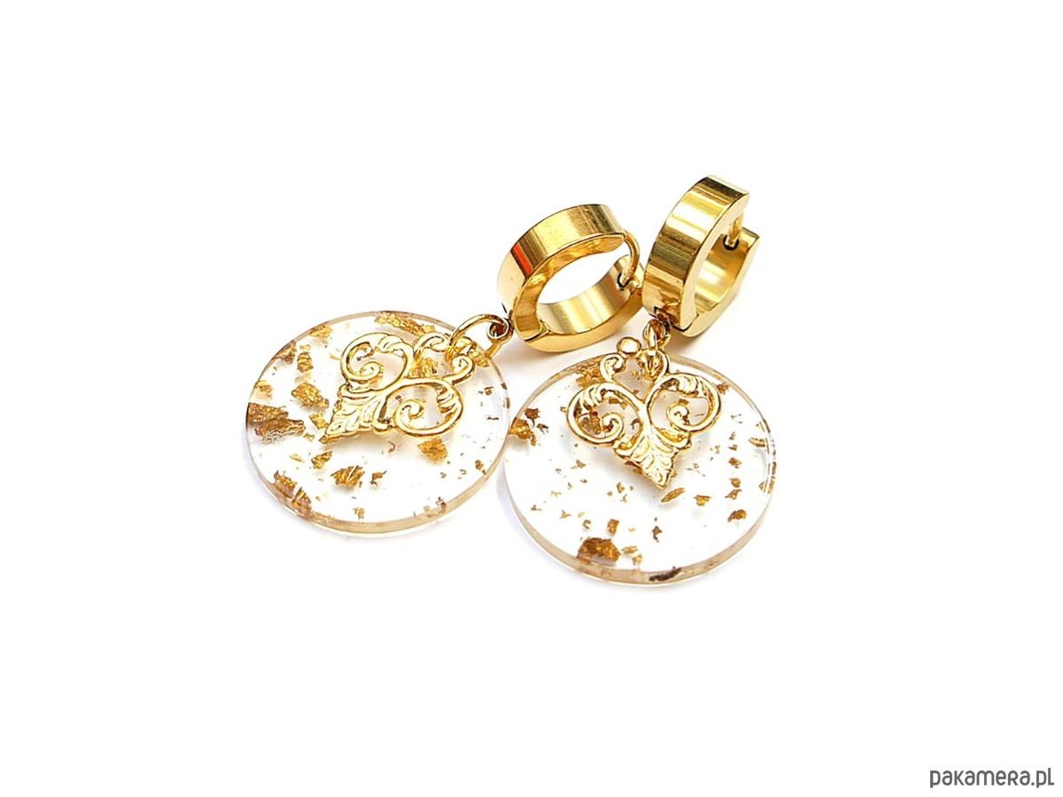Kolczyki wykonane ze stali szlachetnej pozłacanej oraz monetek z żywicy z zatopionymi w środku złotymi płatkami [22mm]. Długość kolczyków: ok. 3,6cm. Bigle - kajdanki.