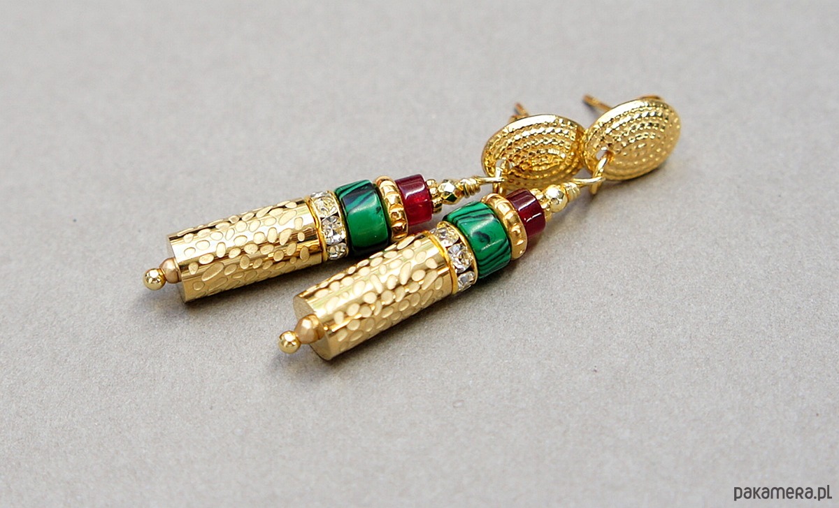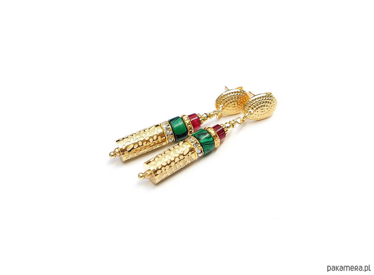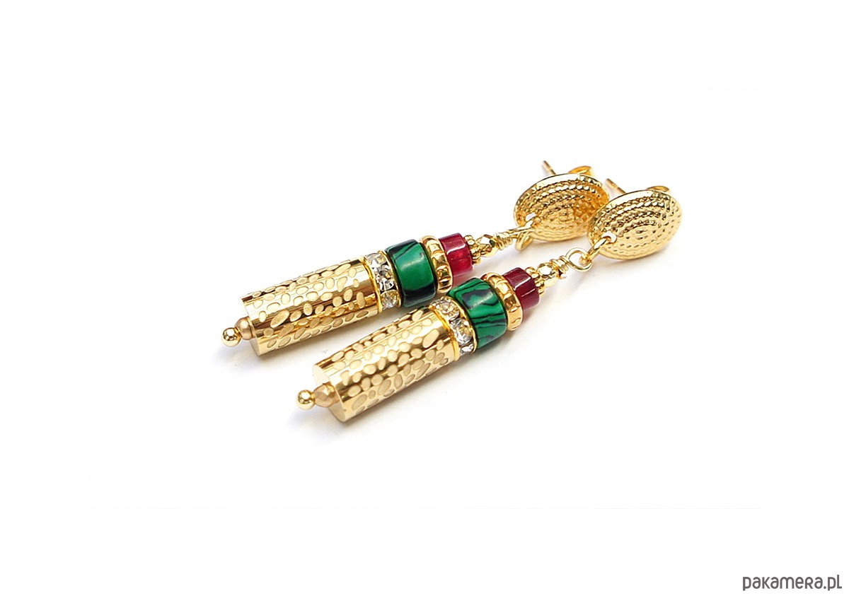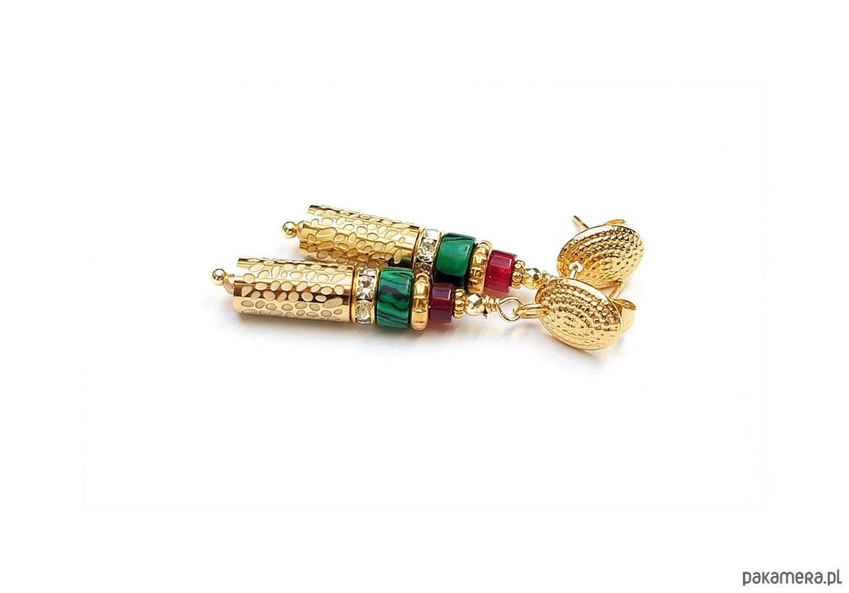 Kolczyki wykonane z naturalnych kamieni - talarki malachitów [6 x 3mm], talarki jadeitów [4 x 2mm] oraz z pozłacanej stali szlachetnej. Długość kolczyków: ok. 4,3cm. Biżuteria ozdobnie zapakowana.