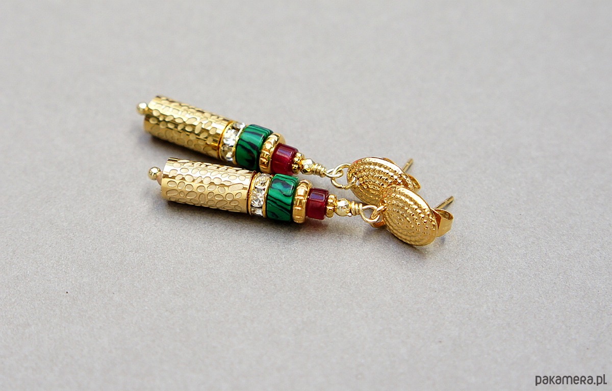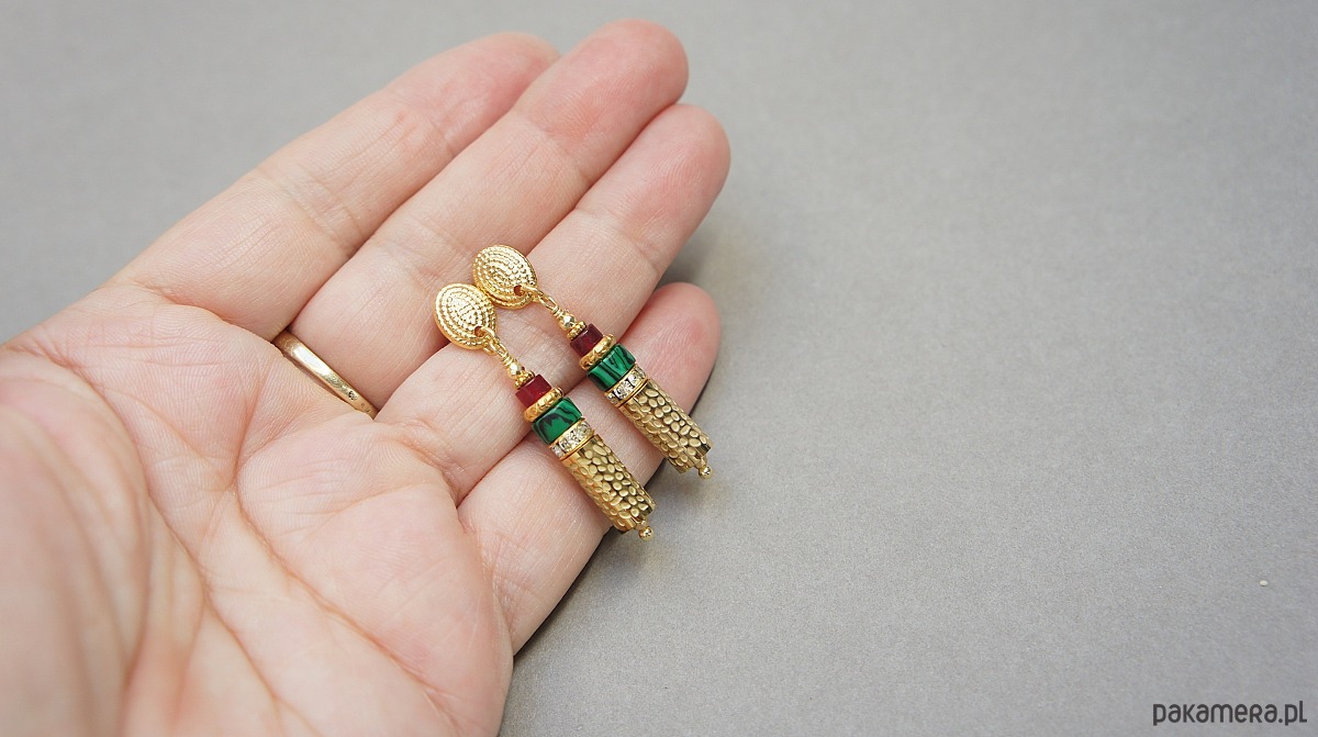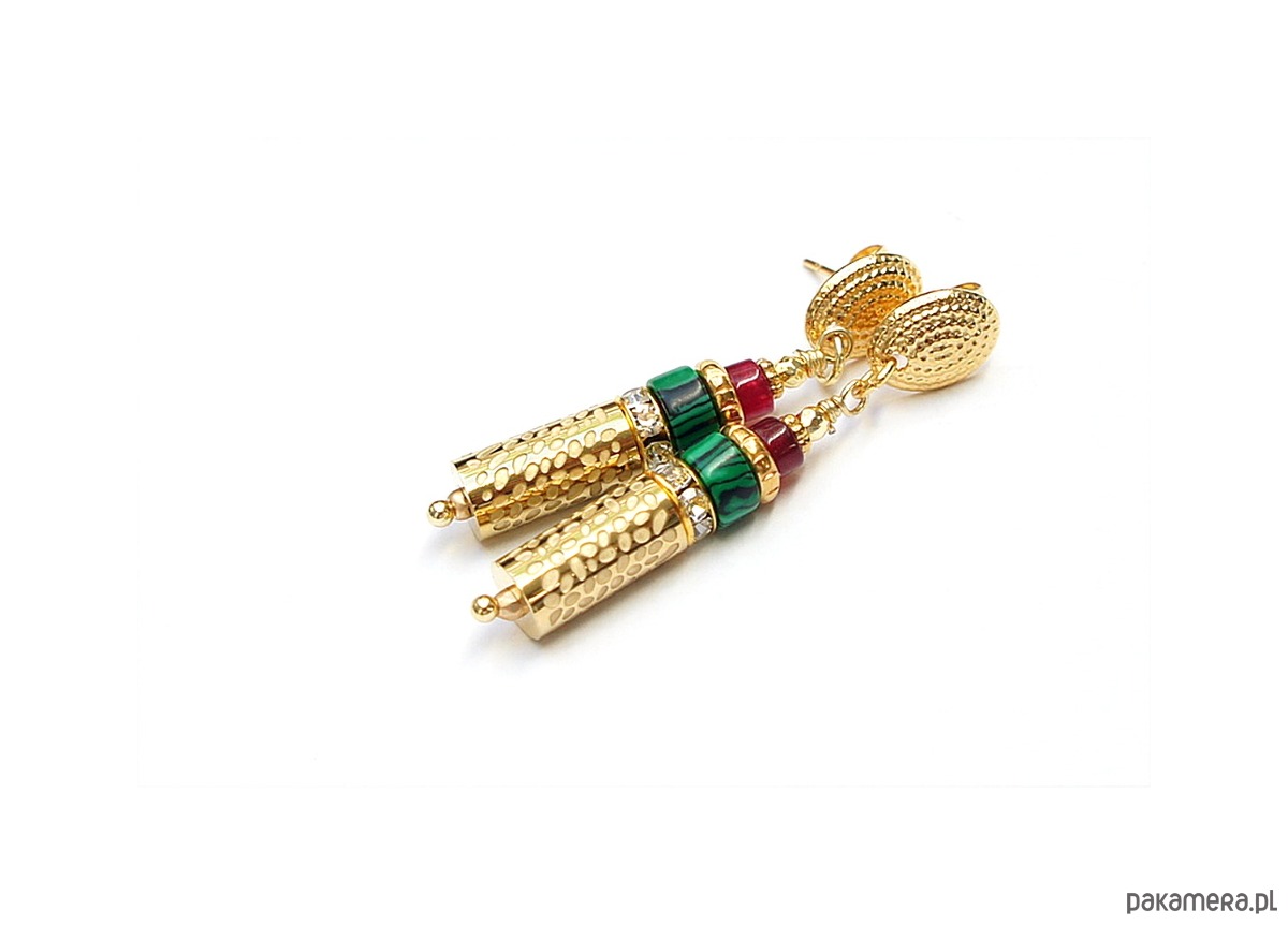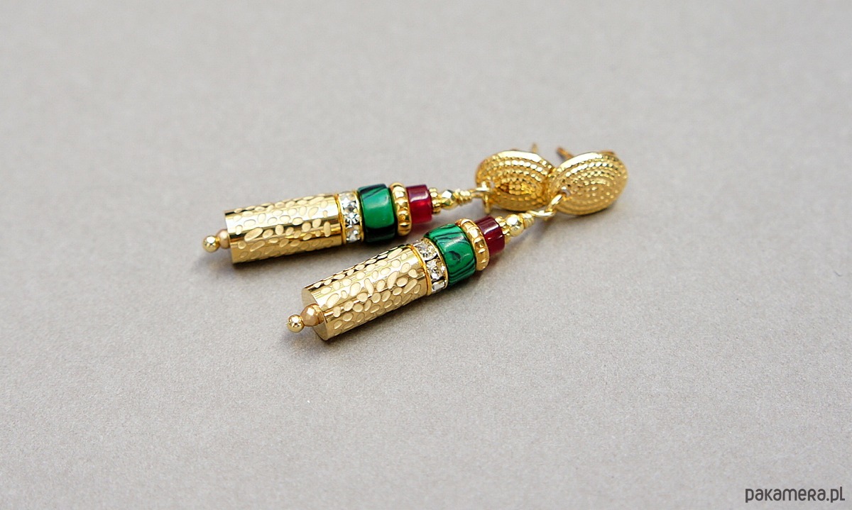 Kolczyki wykonane z naturalnych kamieni - talarki malachitów [6 x 3mm], talarki jadeitów [4 x 2mm] oraz z pozłacanej stali szlachetnej. Długość kolczyków: ok. 4,3cm. Biżuteria ozdobnie zapakowana.