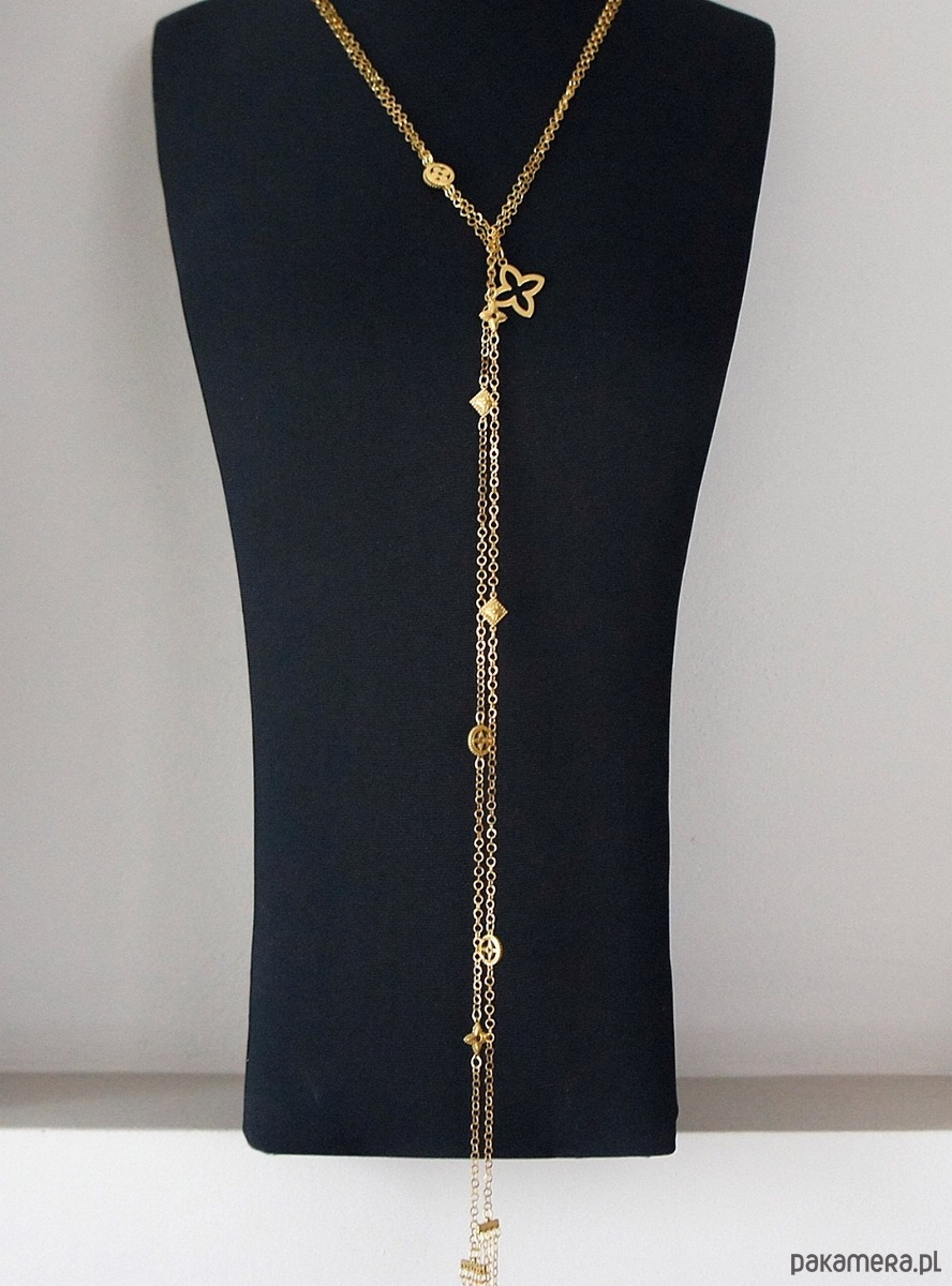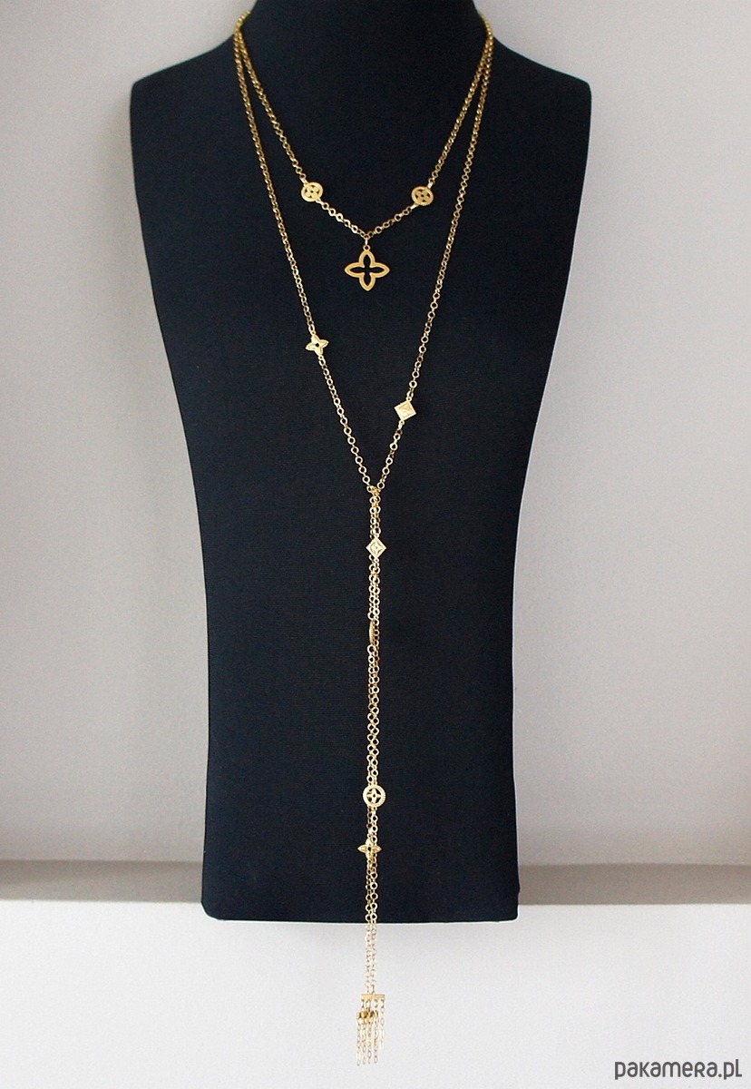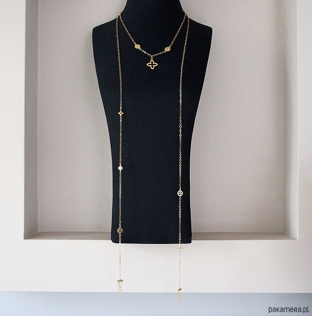 Bardzo długi, delikatny naszyjnik wykonany w całości z pozłacanej stali szlachetnej zakończony złotymi chwostami z łańcuszków. Całkowita długość naszyjnika ok. 178cm. Biżuteria ozdobnie zapakowana.