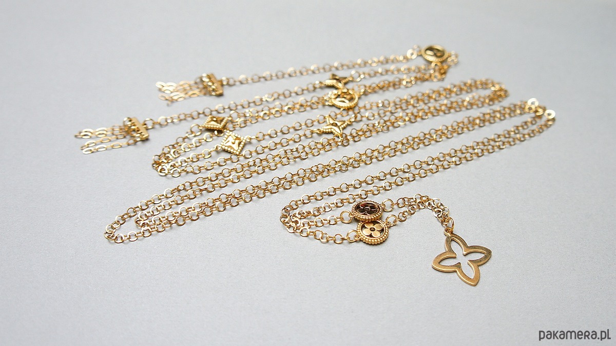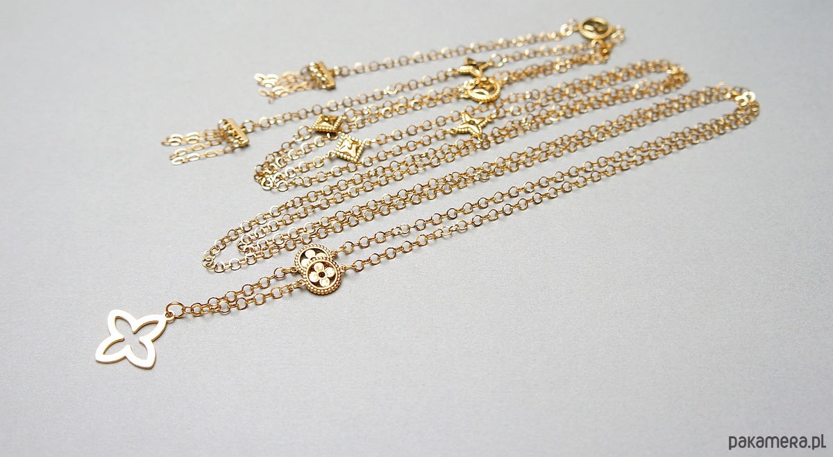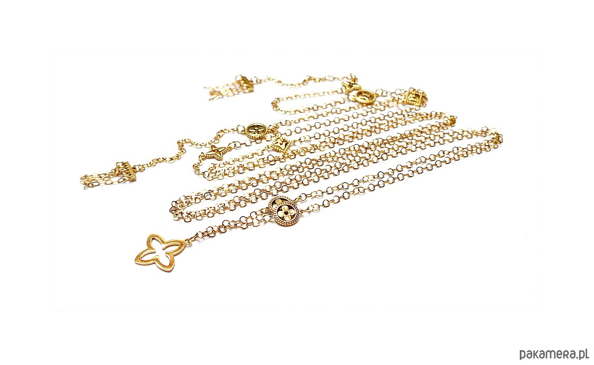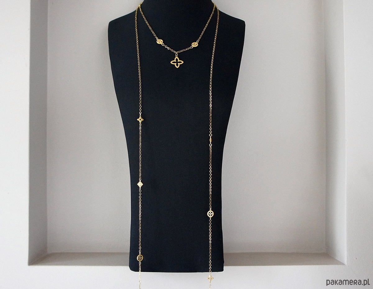Bardzo długi, delikatny naszyjnik wykonany w całości z pozłacanej stali szlachetnej zakończony złotymi chwostami z łańcuszków. Całkowita długość naszyjnika ok. 178cm. Biżuteria ozdobnie zapakowana.